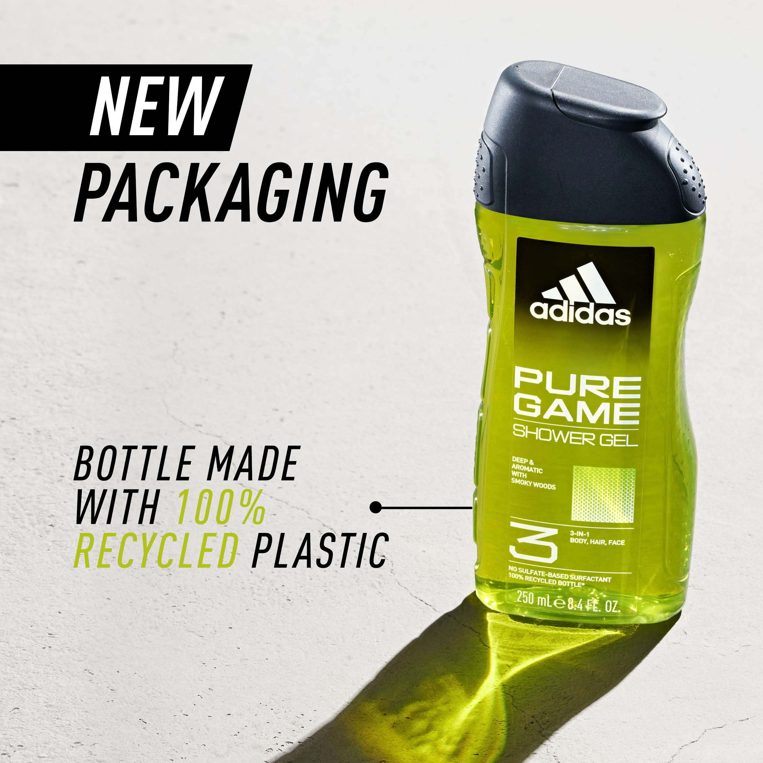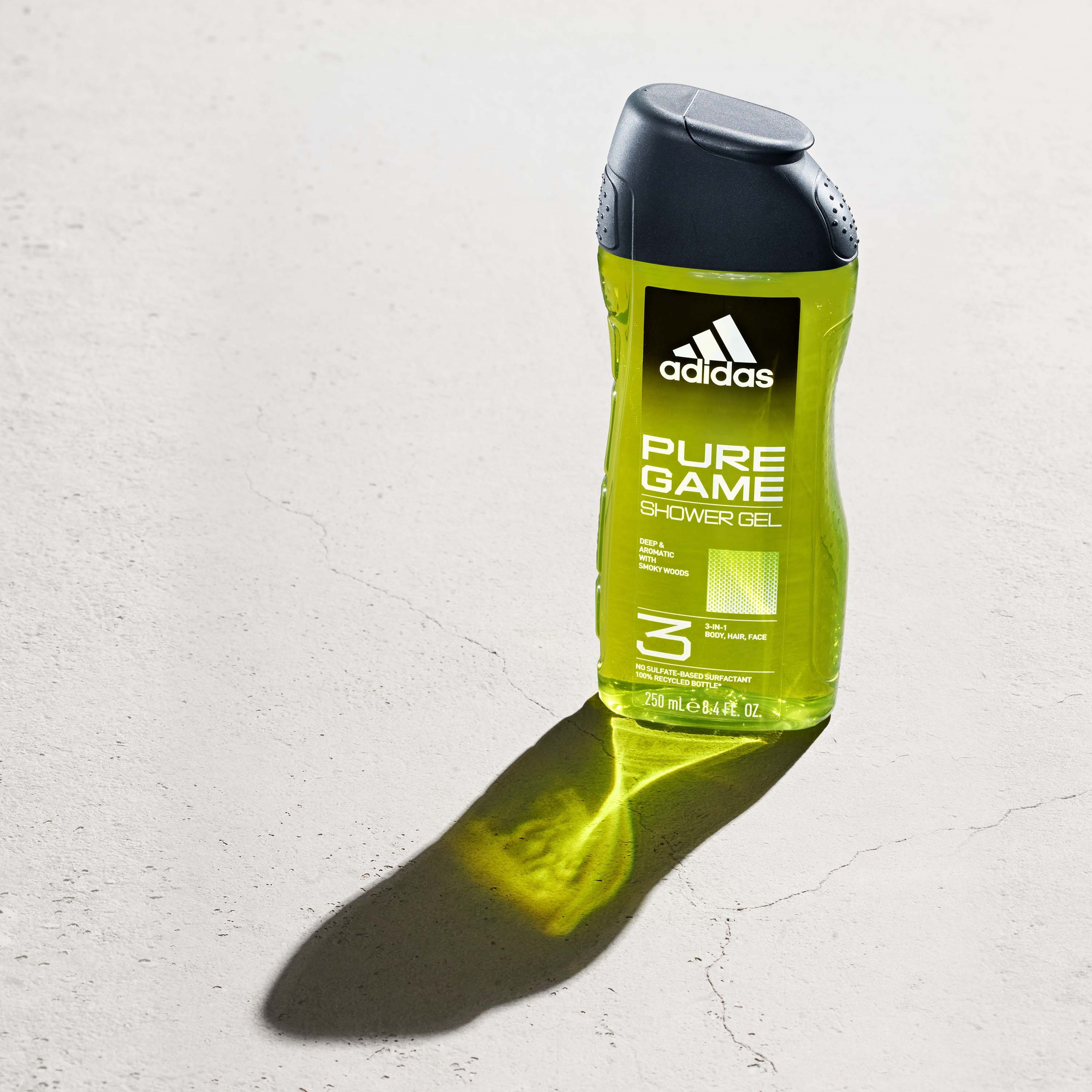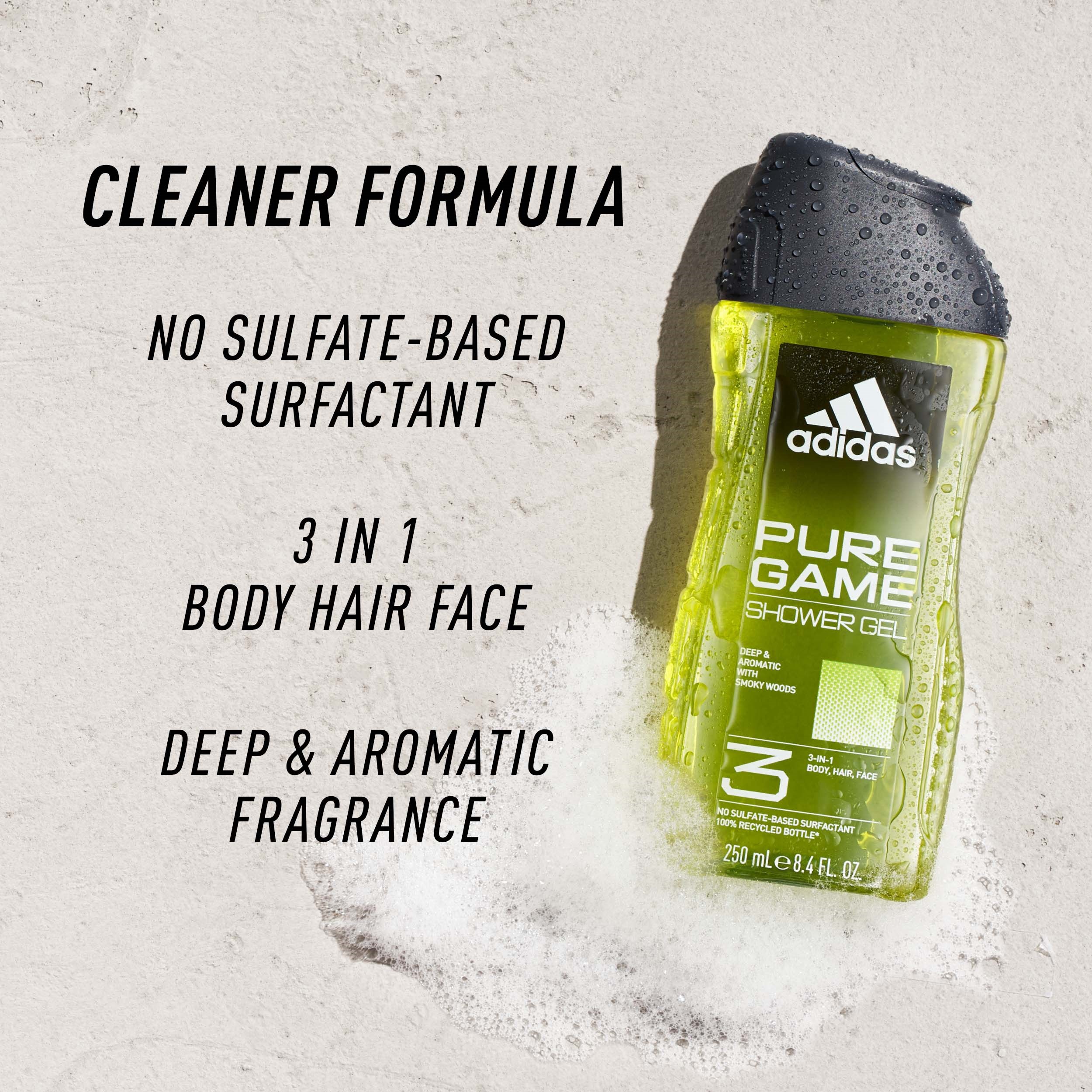 Żel pod prysznic Adidas Pure Game został zaprojektowany w oparciu o głębokie i aromatyczne nuty zapachowe. Formuła żelu pod prysznic 3 w 1 jest testowana dermatologicznie i wegańska. Opakowanie wykonane jest z butelki pochodzącej w 100% z recyklingu*