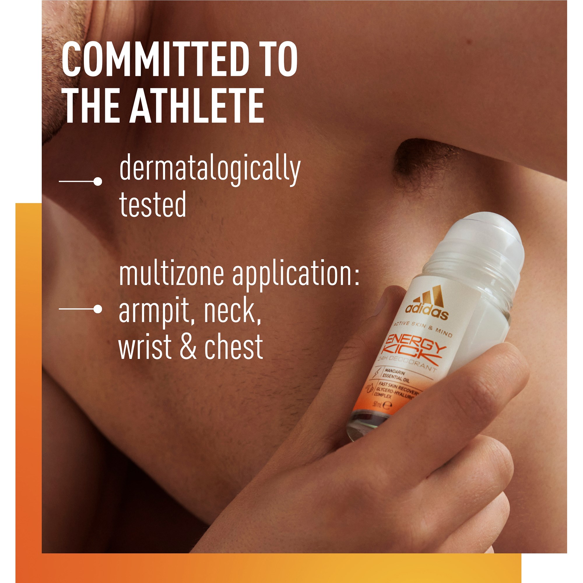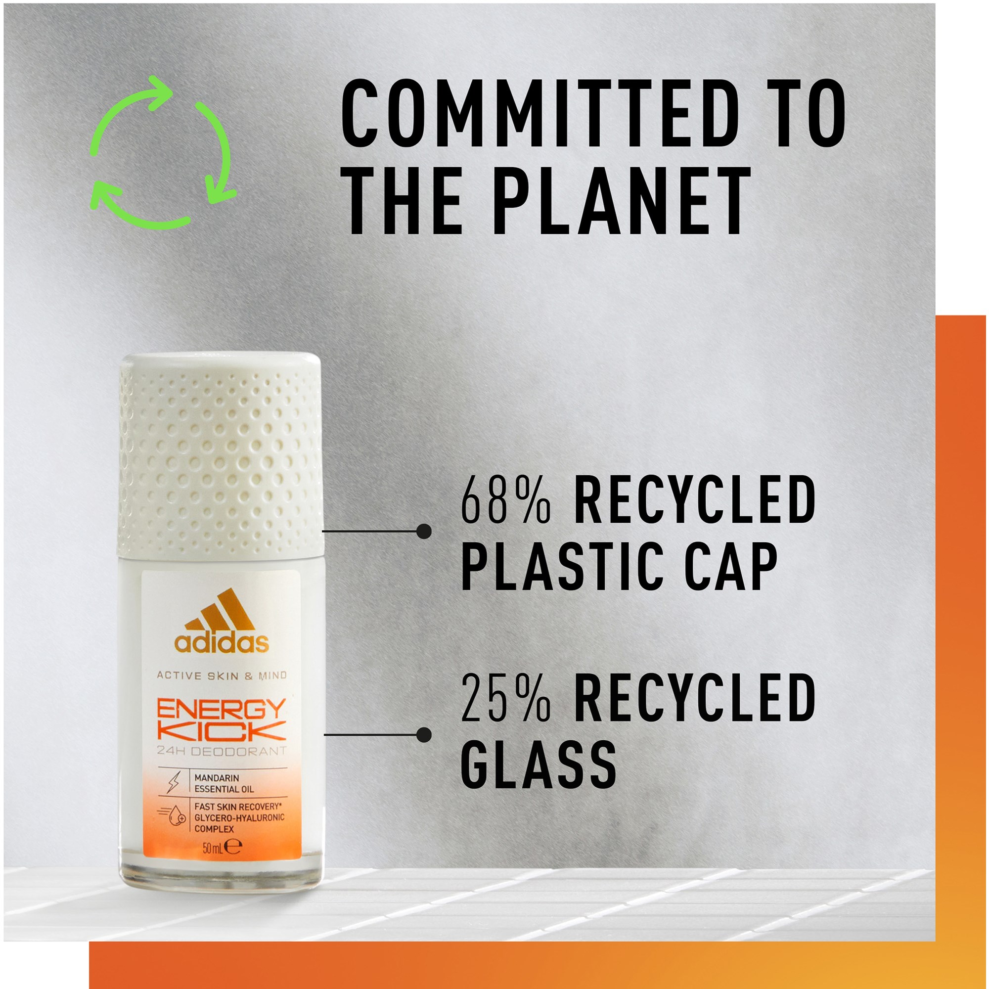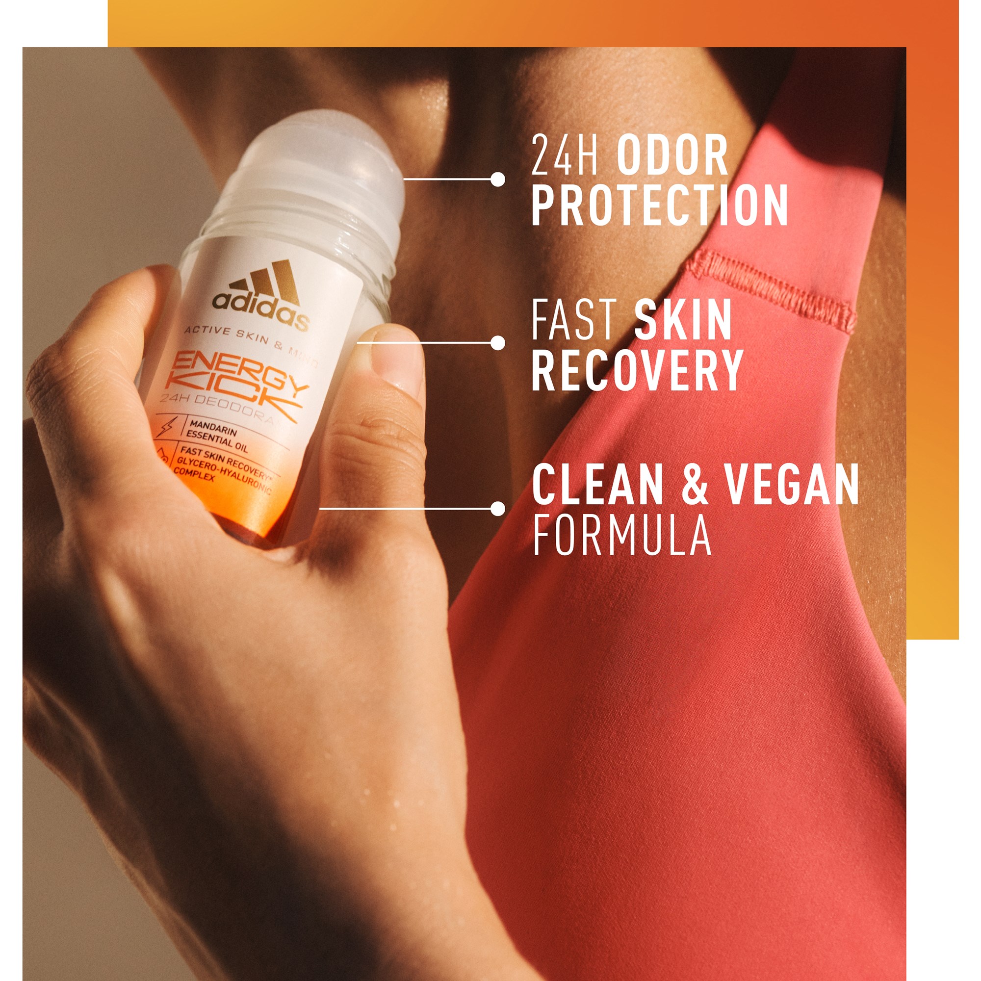 Dodaj energii swojej treningowej rutynie z dezodorantem w kulce Adidas Energy Kick z serii Active Skin & Mind. Produkt powstał we współpracy z naukowcami zajmującymi się sportem, a jego wysokoefektywna formuła* ma na celu zrewolucjonizowanie Twojej codziennej pielęgnacji skóry. – Dezodorant w kulce Active Skin & Mind Energy Kick zawiera eteryczny olejek mandarynkowy, który zapewnia 24-godzinne zabezpieczenie przed nieprzyjemnym zapachem, a także kompleks glicerynowo-hialuronowy dla szybkiego nawilżenia skóry.- Formuła bezalkoholowa i bez aluminium.- Może być stosowany w różnych miejscach: pod pachami, na szyi, nadgarstkach i klatce piersiowej.- Dla sportowców. Ten czysty i wegański dezodorant w kulce jest testowany dermatologicznie.- Dla planety. Opakowanie wykonane jest z co najmniej 25% szkła z recyklingu oraz 98% plastiku z recyklingu (zakrętka).*Stworzony dla szybkiego nawilżenia skóry.Sposób użycia:Aplikuj na czystą, suchą skórę. Spróbuj aplikować w różnych miejscach: pod pachami, na szyi, nadgarstkach i klatce piersiowej.