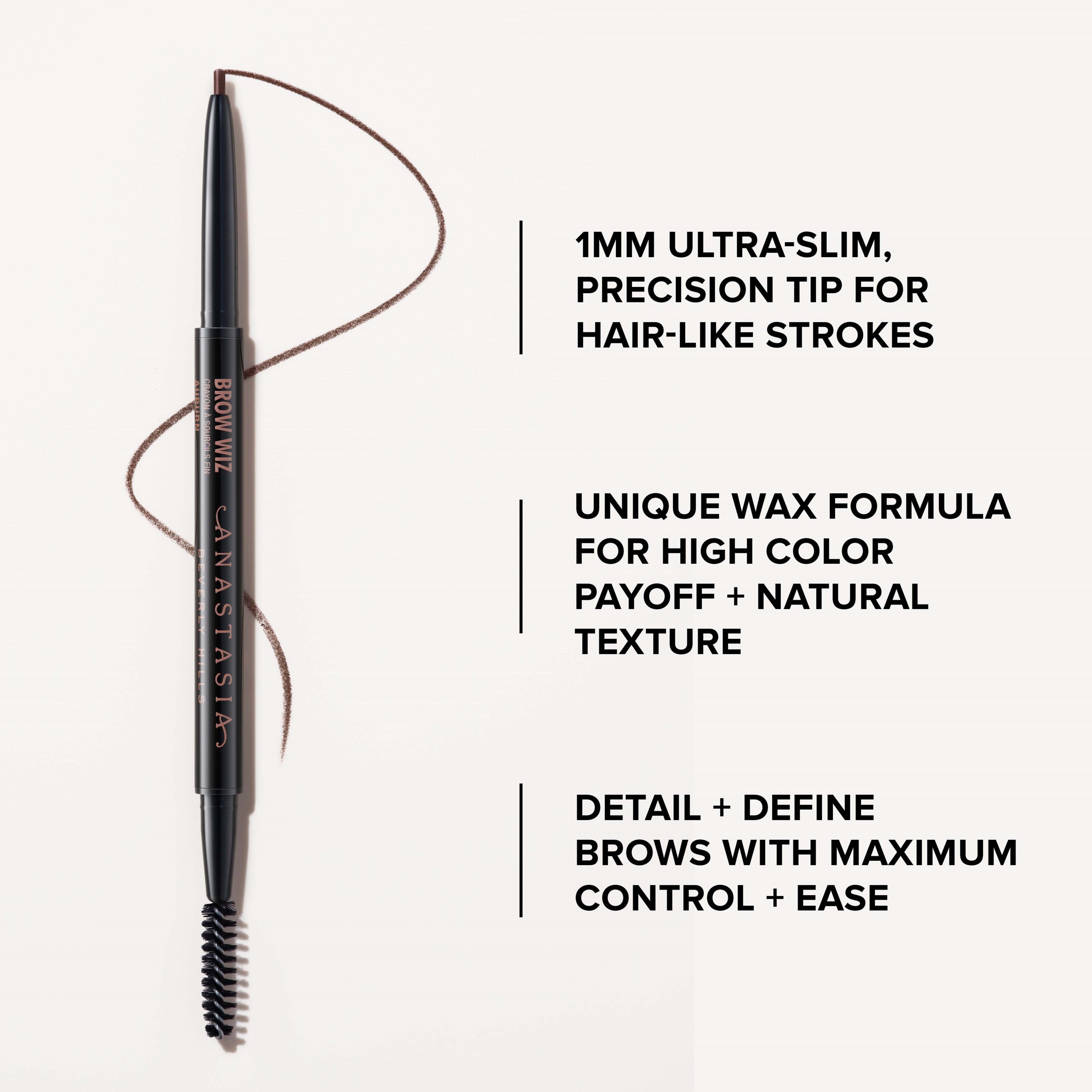 Anastasia Beverly Hills Brow Wiz Medium Brown to ultracienka, wysuwana kredka do brwi, która dodaje im definicji i precyzyjnie podkreśla kształt. Dostępna w 12 odcieniach. Unikalna woskowa formuła łączy kolor i wosk, zapewniając intensywny efekt i imitując włoski dla naturalnego efektu. Cienka końcówka 1 mm rysuje włoski, idealna na rzadkie miejsca, a szczoteczka rozciera produkt dla naturalnego wykończenia.Dlaczego ją pokochasz:- Idealna do modelowania i precyzyjnego podkreślania brwi.- Cienka kredka imituje włoski z maksymalną precyzją.- Formuła z woskiem i kolorem zapewnia intensywny efekt.- Dodaje naturalnej tekstury brwiom.- Zawiera szczoteczkę do rozcierania i tworzenia naturalnego wykończenia.- Cruelty-free i wegańska.- Dostępna w 12 odcieniach.Sposób użycia:Najpierw przeczesz włoski szczoteczką. Następnie obrysuj kontur brwi, zaczynając od najwyższego punktu łuku i kieruj się do końca brwi. Rozetrzyj szczoteczką dla naturalnego efektu.Następnie lekko naszkicuj początek brwi. Końcówką kredki narysuj włoski w rzadkich miejscach na całej długości brwi. Rozetrzyj szczoteczką dla naturalnego wykończenia. Dla pełniejszych brwi po prostu narysuj włoski w rzadkich miejscach w kierunku wzrostu włosków. Rozetrzyj szczoteczką dla naturalnego wykończenia.PRO TIP:Użyj Brow Wiz, aby naszkicować kształt brwi przed wypełnieniem.Wybierz odcień najbliższy naturalnemu kolorowi brwi.Stosuj lekki nacisk podczas aplikacji.Rozcieraj na bieżąco dla naturalnego wykończenia.Jeśli masz rzadkie brwi, najpierw użyj Brow Definer, aby je wypełnić.Użyj jaśniejszego odcienia, aby wypełnić brwi, a ciemniejszego, aby dodać detale. Aby uzyskać efekt włosków, trzymaj Brow Wiz pod kątem, lekko przyłóż końcówkę kredki do brwi, dociśnij u dołu, a następnie obróć nadgarstek.