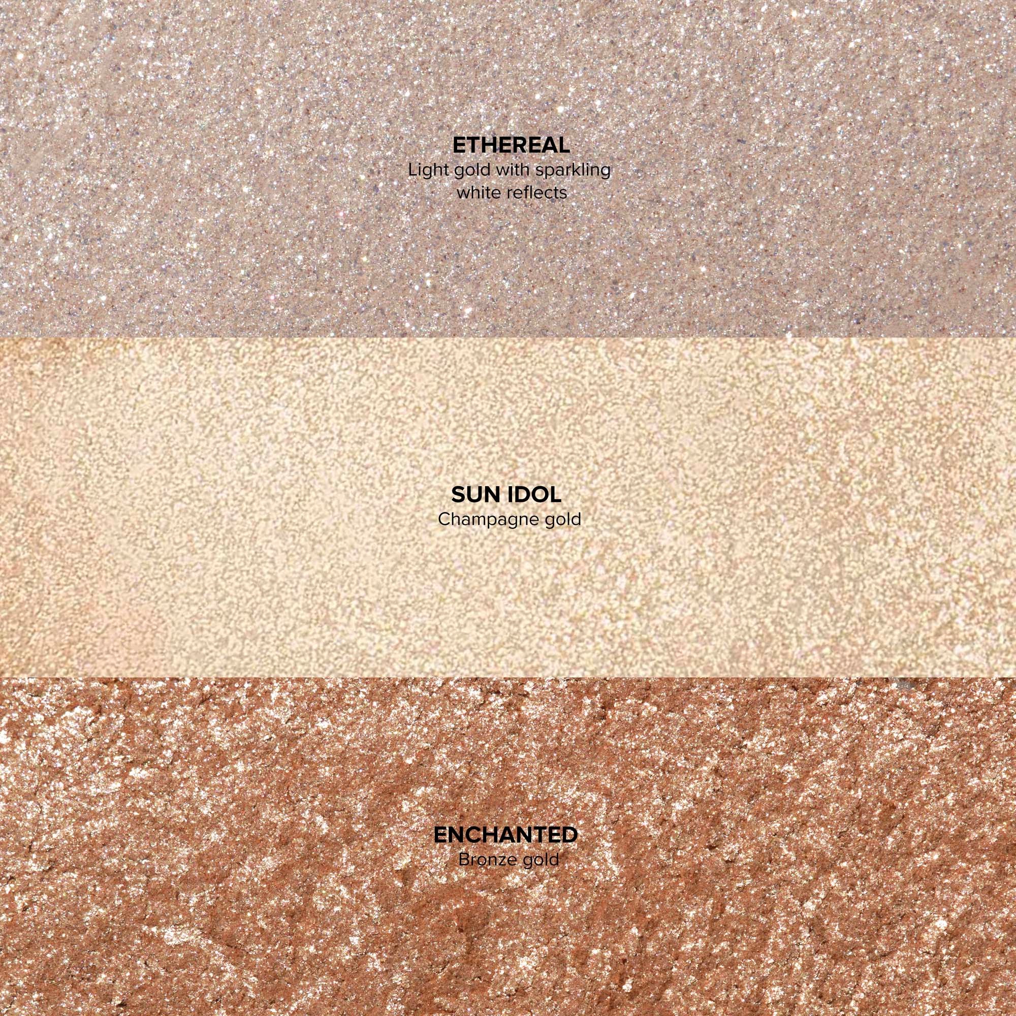 Glow Seeker HighlighterAnastasia Beverly Hills Glow Seeker Highlighter to rozświetlacz, który pasuje do wszystkich odcieni skóry i zapewnia efekt wow. Dzięki unikalnej formule żelowego pudru daje wielowymiarowy efekt dewy, łącząc blask płynnego rozświetlacza z lekkością pudru. Odcień Sun Idol jest uniwersalny i pozwala budować intensywność, podkreślając piękno skóry od subtelnego blasku po pełny efekt złotej szampana. Glow Seeker Highlighter można używać na twarzy, ciele, powiekach i ustach. Dlaczego go pokochasz: – Wielowymiarowy puder z efektem glow.- Ultralekka formuła wtapia się w skórę.- Możliwość budowania intensywności.- Uniwersalny odcień dla wszystkich odcieni skóry.- Ultrabłyszcząca formuła z efektem dewy.- Łatwy w aplikacji, można używać na twarz, powieki, ciało i usta.- Prasowany puder pozwala nabrać idealną ilość produktu.- Luksusowe opakowanie w kolorze różowego złota z lusterkiem w pokrywce.- Można używać na sucho lub z wilgotnym pędzlem.- Bez talku, zapachu i parabenów.- Wegański i cruelty-free.Odcienie:ETHEREAL: Jasne złoto z migoczącymi białymi refleksamiSUN IDOL: Złota szampanENCHANTED: Brązowe złotoSposób użycia:Delikatnie przesuń pędzlem A23 Pro Brush po Glow Seeker Highlighter, aby nabrać produkt.Nałóż rozświetlacz na wybrane obszary, takie jak górne kości policzkowe, grzbiet i czubek nosa, łuk kupidyna i obojczyk.Dla mocniejszego efektu nałóż kolejne warstwy, aby uzyskać pożądaną intensywność.PRO TIP:Użyj płaskiej strony pędzla Anastasia A23 Pro Brush, aby nałożyć produkt, a końcówki pędzla, aby go rozblendować. Spryskaj pędzel A23 Pro Brush sprayem Dewy Set Setting Spray, aby uzyskać bardziej intensywne wykończenie. Nałóż rozświetlacz na powieki, aby uzyskać promienny look.