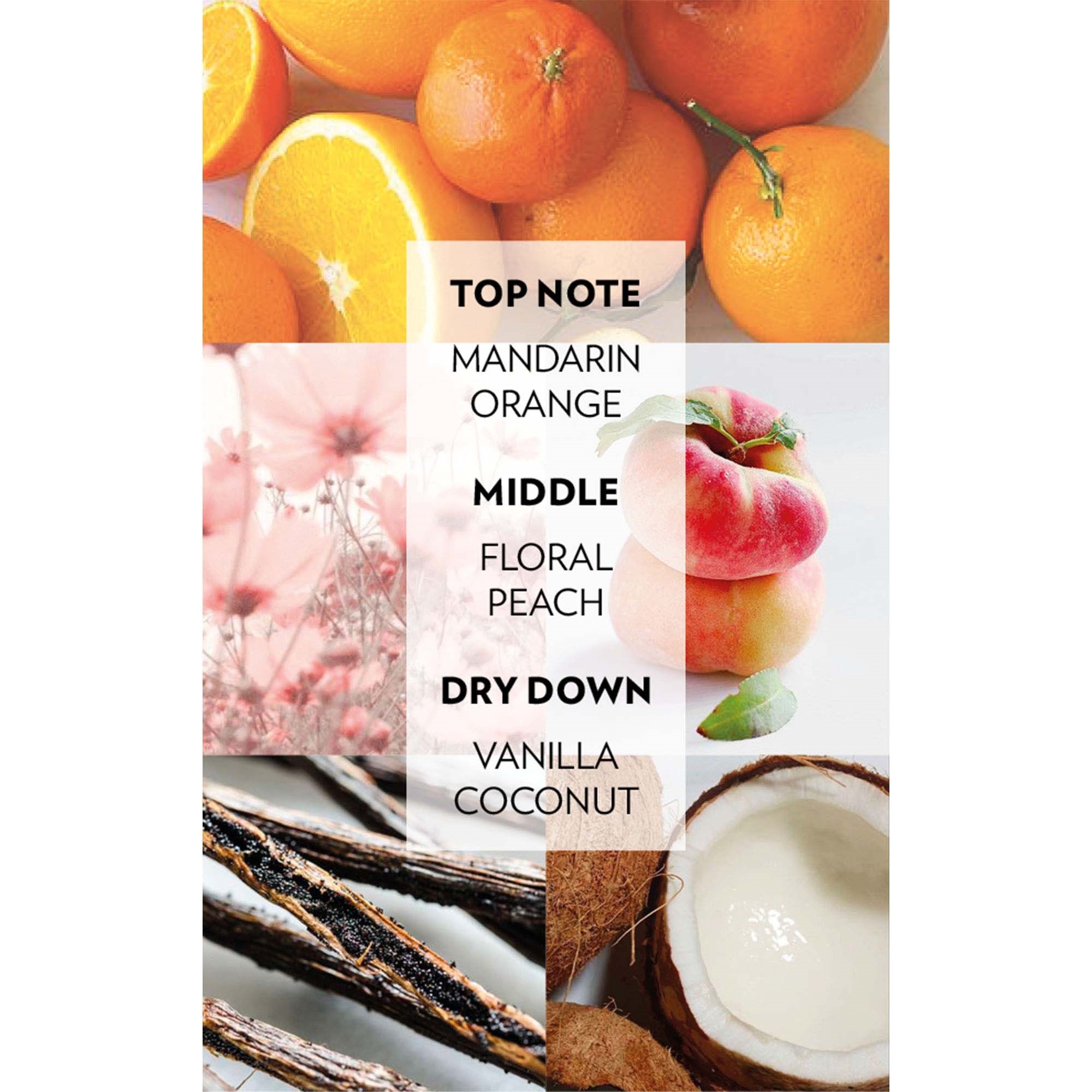 Odświeżająca mgiełka do włosów z filtrem UV, która chroni przed uszkodzeniami słonecznymi. Cudowny zapach mandarynki, kokosa i świeżo zerwanych kwiatów utrzymuje się przez cały dzień, dając efekt dopiero co umytych włosów. Pielęgnacyjne składniki odżywiają włosy, sprawiając, że stają się jedwabiście gładkie i pełne blasku. Lekka formuła szybko się wchłania, nie obciążając włosów. Spray jest idealny do torebki i świetnie uzupełnia działanie suchego szamponu.Sposób użycia:Spryskaj włosy, aby je odświeżyć.