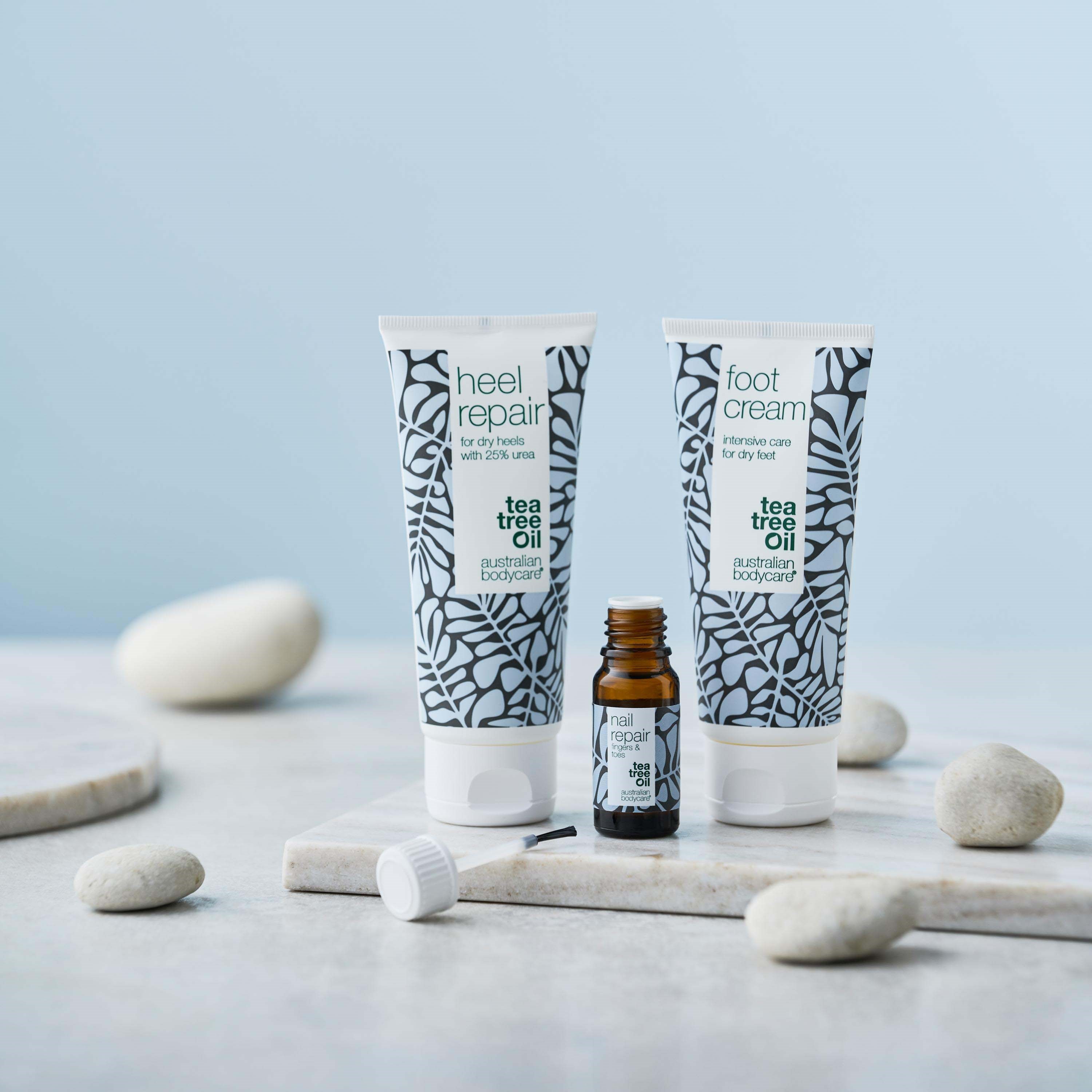 Jeśli chcesz zwalczyć i zapobiegać problemom z suchą i twardą skórą, pęknięciami pięt, zgrubieniami oraz przebarwionymi, żółtymi paznokciami, zestaw 3 codziennych produktów do pielęgnacji stóp to świetny wybór. Codzienna pielęgnacja stóp zmniejsza również problemy z nieprzyjemnym zapachem.Te 3 produkty mogą pomóc, jeśli sucha i twarda skóra już jest problemem, ale można je także stosować profilaktycznie, aby uniknąć pęknięć pięt i zgrubień.Produkty do stóp – krem do stóp, maść na pięty i olejek do paznokci – można stosować w codziennej pielęgnacji, aby utrzymać stopy i paznokcie w doskonałej kondycji i zdrowym poziomie nawilżenia.Krem do stóp oparty jest na naturalnym oleju z drzewa herbacianego, znanym z działania przeciwbakteryjnego, które może pomóc w walce z nieprzyjemnym zapachem stóp. Krem zawiera również 10% mocznika – znanego jako karbamid – co zapewnia miękkie i nawilżone stopy.Maść na pięty z 25% mocznika jest szczególnie odpowiednia dla bardzo suchych obszarów skóry na stopach, lub jeśli zmagasz się z zgrubieniami i pęknięciami pięt. Mocznik rozpuszcza twardą skórę, sprawiając, że stopy stają się gładkie, miękkie i piękne.Olejek do paznokci z olejem z drzewa herbacianego pomaga w przypadku przebarwionych i szorstkich paznokci. Żółte paznokcie można zredukować dzięki codziennemu stosowaniu olejku, który utrzymuje paznokcie w dobrej kondycji, wolne od pęknięć i bruzd. Olejek zawiera witaminę E, która jest kluczowa dla utrzymania zdrowych i mocnych paznokci. Produkt może być również stosowany w celu pielęgnacji grzybicy paznokci.Wszystkie produkty są oczywiście dermatologicznie testowane i uznawane za odpowiednie dla wszystkich typów skóry.Sposób użycia:Powinieneś używać 3 produktów do stóp z zestawu codziennie, aby uzyskać optymalne rezultaty, najlepiej 2 razy dziennie (rano i wieczorem).Nałóż krem do stóp na czyste stopy i dokładnie wmasuj go w całą stopę. Następnie rozprowadź maść na pięty na bardzo suchych obszarach skóry, takich jak pięty i podeszwy.Zakończ nałożeniem odżywczego olejku do paznokci na wszystkie paznokcie lub na te, które są przebarwione, popękane lub mają nierówną powierzchnię.Daj kremom i olejkowi chwilę na wyschnięcie, zanim założysz skarpetki i buty lub położysz się spać.10,100,100 ml