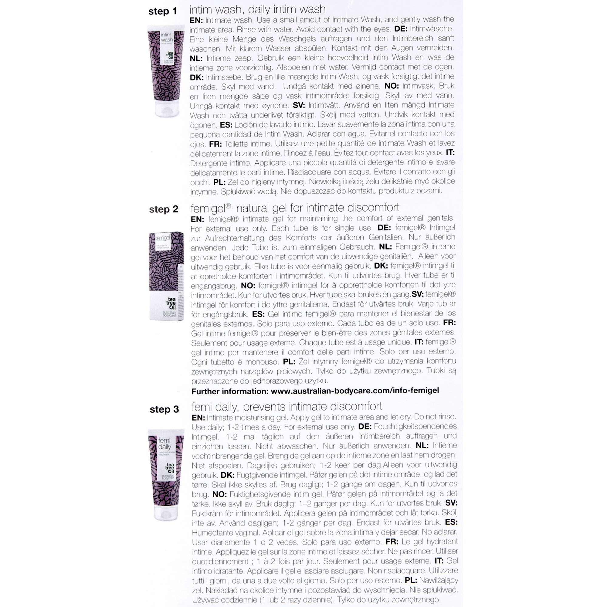 3 produkty do pielęgnacji intymnej łagodzą swędzenie, suchość i niepożądany zapach. Intim Wash, Femigel i Femi Daily zawierają olejek z drzewa herbacianego i zapobiegają dyskomfortowi intymnemu.Sposób użycia:Codziennie myj okolice intymne za pomocą Intim Wash, aby usunąć bakterie, które mogą powodować niepożądane zapachy i swędzenie. Zwróć szczególną uwagę na otwór pochwy, w którym często gromadzą się bakterie.W przypadku poważnych problemów intymnych należy stosować Femigel 1-2 razy dziennie, aż do zmniejszenia lub ustąpienia dolegliwości intymnych. Nakładaj produkt bezpośrednio z tubki na okolice intymne, gdzie odczuwasz dyskomfort.Następnie możesz profilaktycznie stosować Femi Daily, nakładając żel na okolice intymne 1-2 razy dziennie lub według potrzeb. Femigel i Femi Daily nie powinny być spłukiwane.