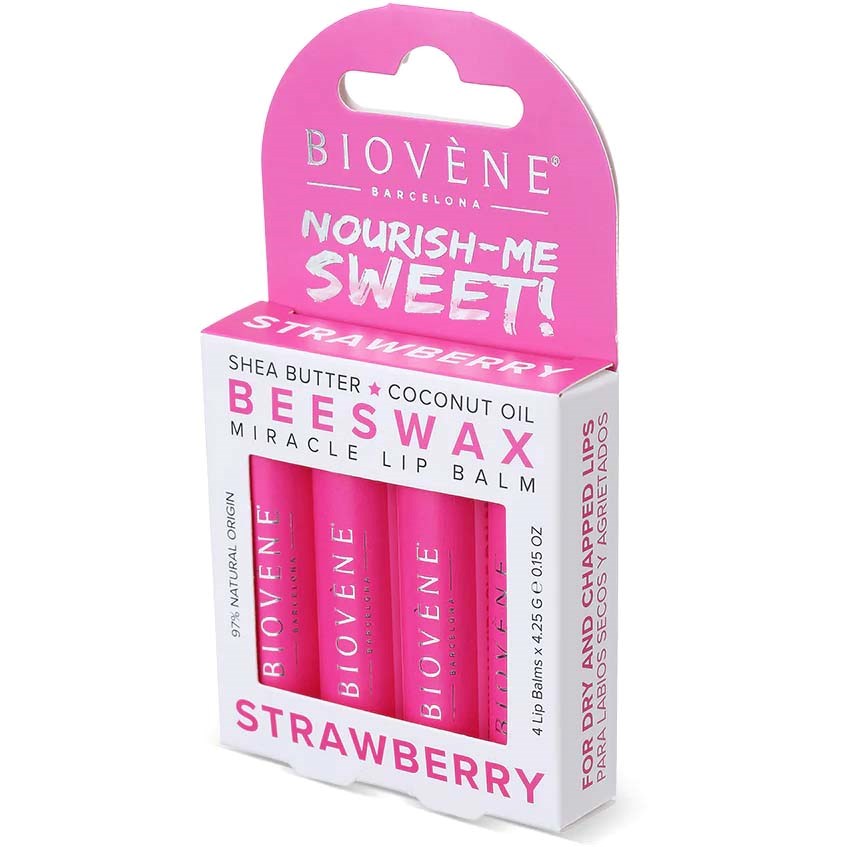 Biovene Lip Care Beeswax Strawberry 4 × 4,25 g Extra nawilżający balsam do ust dla suchych i spierzchniętych ust, 4 szt. Sposób użycia: Nałóż na czyste usta. Stosuj codziennie.