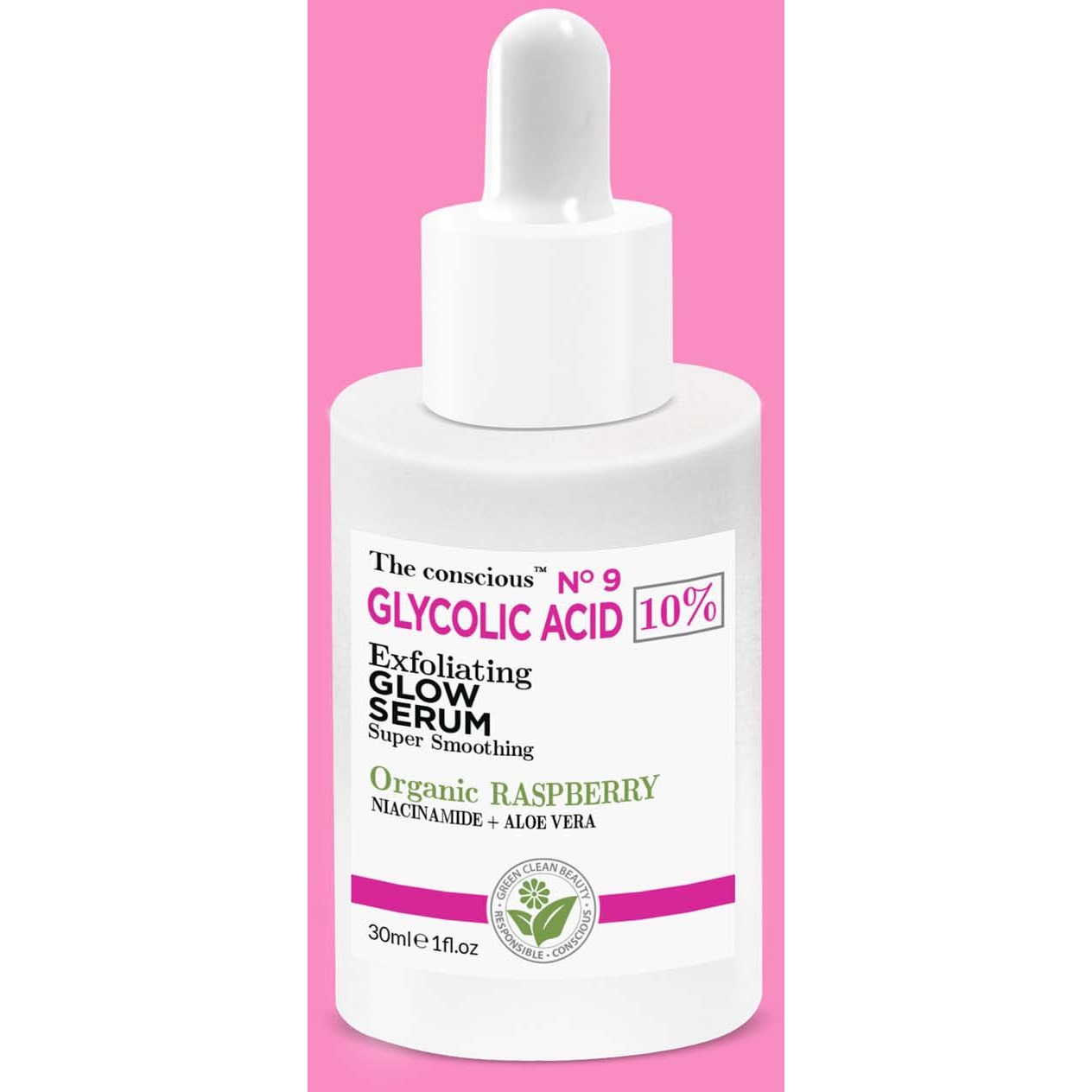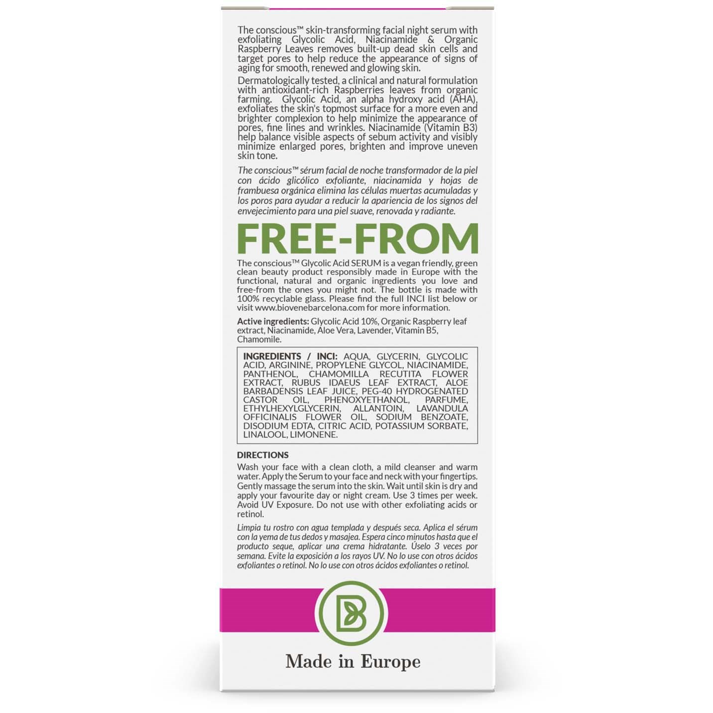 The conscious™ Glycolic Acid Exfoliating Glow SerumZALETY:ZłuszczaWygładzaUsuwa martwe komórki naskórkaEliminuje szarośćThe conscious™ serum złuszczające z kwasem glikolowym, niacynamidem i ekologicznymi liśćmi malin skutecznie usuwa warstwy martwych komórek naskórka i koncentruje się na porach, aby pomóc zredukować widoczność oznak starzenia, zapewniając gładką, odnowioną i promienną cerę.Dermatologicznie testowana, kliniczna i naturalna formuła z antyoksydacyjnymi liśćmi malin z ekologicznych upraw. Kwas glikolowy, alfa-hydroksykwas (AHA), złuszcza zewnętrzną warstwę skóry, zapewniając jej gładszy i jaśniejszy wygląd oraz pomaga zminimalizować widoczność porów, drobnych linii i zmarszczek. Niacynamid (witamina B3) pomaga zrównoważyć widoczne aspekty produkcji sebum, minimalizując widoczność rozszerzonych porów, rozjaśniając i poprawiając nierówny koloryt skóry.AKTYWNE SKŁADNIKI: Kwas glikolowy 10 %, ekstrakt z ekologicznych liści malin, niacynamid, aloes, lawenda, witamina B5, rumianek.CLEAN BEAUTY + BEZ + PRZYJAZNY DLA PLANETYZrównoważona produkcja w Europie z efektywnymi, naturalnymi i ekologicznymi składnikami, które pokochasz, wolne od tych, które mogą Ci się mniej podobać. Butelka wykonana jest w 100% z materiałów nadających się do recyklingu.Wegańskie.Cruelty FreeDermatologicznie testowane.Odpowiednie dla wszystkich typów skóry: idealne dla skóry normalnej do tłustej.The conscious™Razem z naturą. Z misją, aby zmienić Twoją skórę i naszą planetę.Clean Beauty: odpowiedzialne zakupy i formuły bez składników, które są znane lub mogą być podejrzewane o potencjalne szkodliwości dla zdrowia ludzi i/lub środowiska.Wyprodukowano w Europie z mniejszą ilością materiałów opakowaniowych, odpowiedzialnymi zakupami i bardziej zrównoważonymi opcjami, aby zmniejszyć wpływ na środowisko i odpady. Zmiana opakowań na nadające się do recyklingu i odnawialne opcje nie tylko chroni zasoby kopalne, ale także pomaga zredukować emisję dwutlenku węgla. SPOSÓB UŻYCIA:1. Umyj twarz czystą ściereczką, delikatnym środkiem czyszczącym i ciepłą wodą.2. Nałóż serum na twarz opuszkami palców.3. Delikatnie wmasuj serum w skórę.4. Nałóż krem na dzień lub na noc, gdy skóra wyschnie.Używaj trzy razy w tygodniu. Unikaj ekspozycji na UV. Nie stosuj razem z kwasami ani retinolem. Zalecamy wykonanie testu płatkowego przed dodaniem nowych produktów do swojej rutyny.The conscious™ to znak towarowy produkowany odpowiedzialnie przez Biovène Barcelona (Biovene Cosmetics SL).