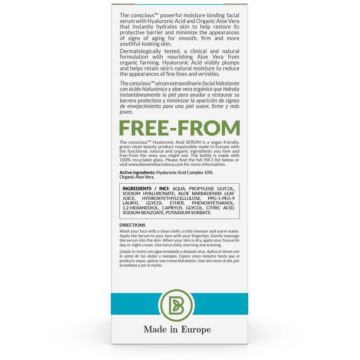 The conscious™ Hyaluronic Acid Ultra-Hydrating Super SerumZALETY:Intensywnie nawilżaZatrzymuje wilgoćRegenerujeUjędrniaThe conscious™ Ultra-Nawilżające Super Serum z nawilżającym kwasem hialuronowym i ekologicznym aloesem, które natychmiast nawilża skórę, pomagając odbudować barierę ochronną i zminimalizować widoczne oznaki starzenia, aby uzyskać gładką, jędrną i bardziej młodzieńczą cerę.Dermatologicznie testowana, kliniczna i naturalna formuła z odżywczym aloesem z ekologicznych upraw. Kwas hialuronowy widocznie wypełnia skórę i pomaga jej zachować naturalną wilgoć, aby widocznie zredukować drobne linie i zmarszczki.AKTYWNE SKŁADNIKI: Kompleks kwasu hialuronowego 10 %, ekologiczny aloesCLEAN BEAUTY + BEZ + PLANET POSITIVEZrównoważona produkcja w Europie z efektywnymi, naturalnymi i ekologicznymi składnikami, które pokochasz, oraz bez tych, które mogą Ci się mniej podobać. Butelka wykonana jest w 100 % z recyklingowanego szkła.Produkt wegański.Cruelty FreeProdukt dermatologicznie testowany.Odpowiedni dla wszystkich typów skóry: idealny dla skóry normalnej do suchej.The conscious™Razem z naturą. Z misją, aby zmienić Twoją skórę i naszą planetę.Clean Beauty: odpowiedzialne zakupy i formuły bez składników, które są znane lub mogą być podejrzewane o potencjalne szkodliwości dla zdrowia ludzi i/lub środowiska.Wyprodukowano w Europie z mniejszą ilością materiałów opakowaniowych, odpowiedzialnymi zakupami i bardziej zrównoważonymi opcjami, aby zmniejszyć wpływ na środowisko i odpady. Zmiana opakowań na recyklingowe i odnawialne opcje to nie tylko dobry krok w kierunku ochrony zasobów kopalnych, ale także pomaga w redukcji emisji dwutlenku węgla.SPOSÓB UŻYCIA:1. Umyj twarz czystą ściereczką, łagodnym środkiem czyszczącym i ciepłą wodą.2. Nałóż serum na twarz opuszkami palców.3. Delikatnie wmasuj serum w skórę.4. Nałóż krem na dzień lub na noc, gdy skóra wyschnie.Stosuj dwa razy dziennie, rano i wieczorem. Nie stosować razem z kwasami ani witaminą C. Zalecamy wykonanie testu płatkowego przed dodaniem nowych produktów do swojej rutyny.The conscious™ to znak towarowy produkowany odpowiedzialnie przez Biovène Barcelona (Biovene Cosmetics SL).