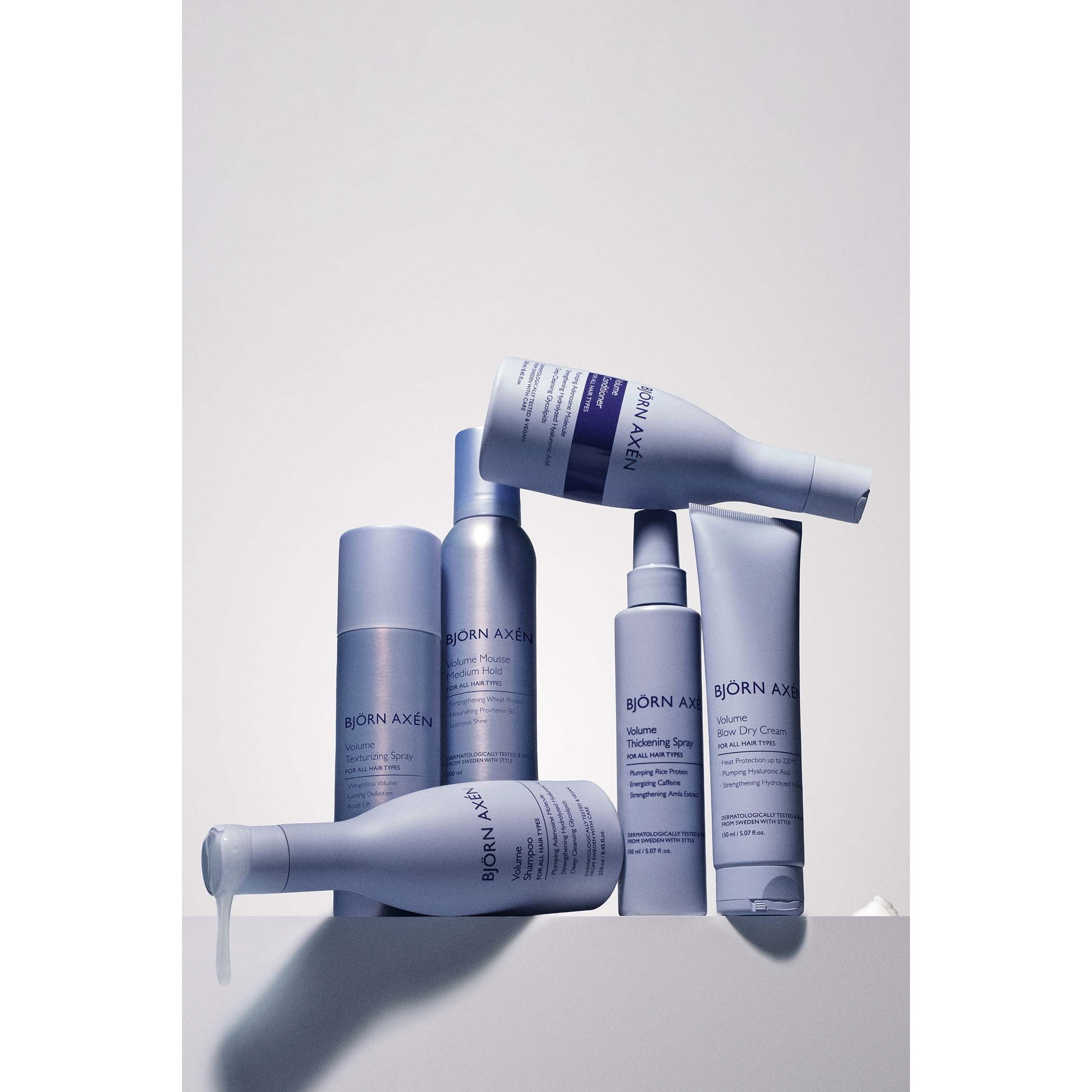 Ten lekki spray zagęszczający dodaje włosom objętości bez ich obciążania. Wzbogacony o Proteiny Ryżu, Kofeinę i Ekstrakt Amla, które wypełniają włosy nawilżeniem, zwiększają ich gęstość i objętość, chroniąc je przed uszkodzeniami zewnętrznymi. Zapewnia długotrwałą objętość od nasady aż po końce, pozostawiając włosy miękkie, lekkie i pełne objętości.Zapach: Orzeźwiający, zielony zapach z nutami ogórka, frezji i amberRodzaj włosów: Produkt nadaje się do wszystkich rodzajów włosów. Produkt testowany dermatologicznie i wegański• 99% badanych zauważyło widoczny wzrost objętości włosów po zastosowaniu rutyny Björn Axén Volume*• 91% badanych zauważyło, że ich włosy stały się wyraźnie grubsze po zastosowaniu rutyny Björn Axén Volume*• 96% badanych zauważyło wyraźne uniesienie włosów u nasady po zastosowaniu rutyny Björn Axén Volume*• 85% badanych zauważyło długotrwały efekt zwiększenia objętości włosów po zastosowaniu rutyny Björn Axén Volume*• 90% badanych zauważyło, że ich włosy były nawilżone po zastosowaniu rutyny Björn Axén Volume**Przetestowano na 120 konsumentach po 14 dniach stosowania. Rutyna: Volume Shampoo, Volume Conditioner, Volume Thickening Spray oraz Volume Blow Dry Cream. Sposób użycia: Nakładać na osuszone ręcznikiem lub suche włosy, koncentrując się na nasadzie, aby uzyskać dodatkową objętość. Rozczesać włosy grzebieniem, aby równomiernie rozprowadzić produkt. Ułożyć według uznania. Dla uzyskania najlepszych rezultatów aktywować ciepłem poprzez suszenie. Łączyć z innymi produktami z serii Björn Axén Volume, aby wzmocnić efekt zwiększenia objętości.