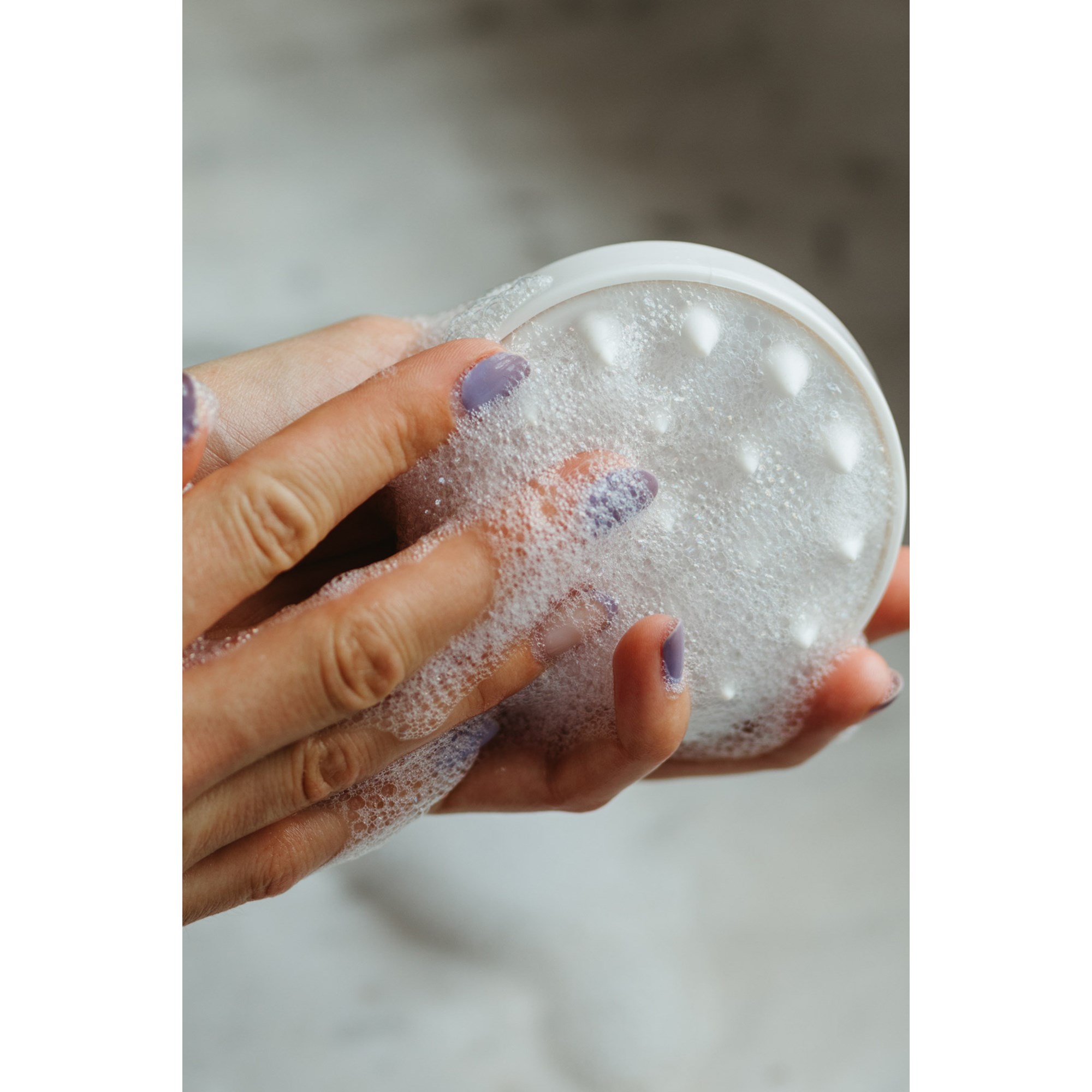 Masująca szczotka do włosów z miękkimi silikonowymi końcówkami przeznaczona jest głównie do mokrych włosów. Jest ona wielofunkcyjna: służy do masażu skóry głowy i wspomaga złuszczanie, ale także wspomaga głębsze wnikanie produktów pielęgnacyjnych do włosów. Masująca szczotka do włosów jest delikatniejszą i skuteczniejszą alternatywą dla paznokci. Zaproś przyjemne uczucie masażu skóry głowy wprost z salonu fryzjerskiego pod własny prysznic. Materiał: tworzywo sztuczne i silikon. Wymiary: średnica 8 cm, wysokość 6,5 cm.