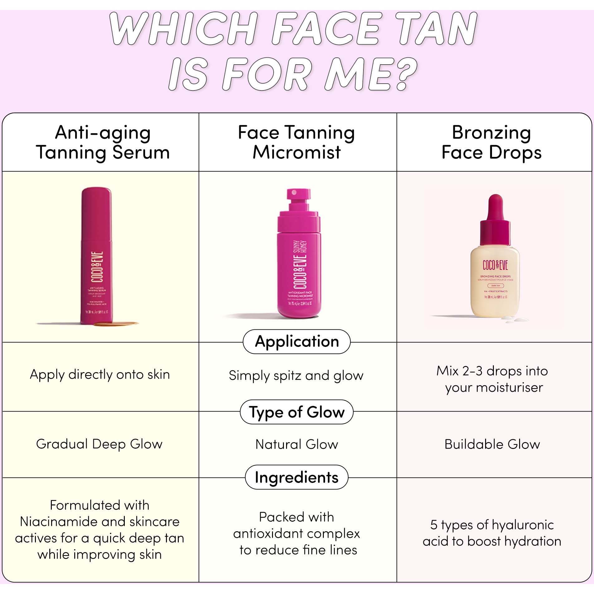 Chwyć stopniowo opaleniznę i zadbaj o skórę z ultranawilżającymi kroplami samoopalającymi do twarzy. Wzbogacone kwasem hialuronowym, ekstraktem z pitai i roślinami z Bali intensywnie nawilżają, ujędrniają i wygładzają drobne linie, dodając młodzieńczego blasku. Lekka, wodna formuła łatwo miesza się z codziennym kremem do twarzy, stając się częścią rutyny pielęgnacyjnej.Pełne wody kokosowej i ekstraktu z banana ujędrniają i nawilżają, a antyoksydanty z pitai sprawiają, że skóra staje się miękka, sprężysta i promienna na kilka dni. Dostosuj opaleniznę według uznania – użyj więcej kropli, aby uzyskać głębszy brąz, lub mniej, aby uzyskać subtelny blask. Dostępne w dwóch odcieniach: Medium Glow dla jaśniejszych odcieni skóry, dla naturalnego efektu muśnięcia słońcem, i Dark dla jasnych i średnich odcieni skóry, dla ciemniejszego efektu, jak po powrocie z wakacji.Ta bezalkoholowa formuła nie wysusza skóry i zapewnia równomierne krycie z dodatkowymi korzyściami pielęgnacyjnymi, sprawiając, że to coś więcej niż samoopalacz do twarzy. Przetestowana dermatologicznie i niekomedogenna, bezpieczna do codziennego użytku, nie zatyka porów i zapewnia naturalny, zdrowy blask za każdym razem.Sposób użycia:Dodaj 2–3 krople do kremu do twarzy. Dokładnie wymieszaj i nałóż równomiernie na twarz, szyję i dekolt. Dokładnie umyj ręce po użyciu.