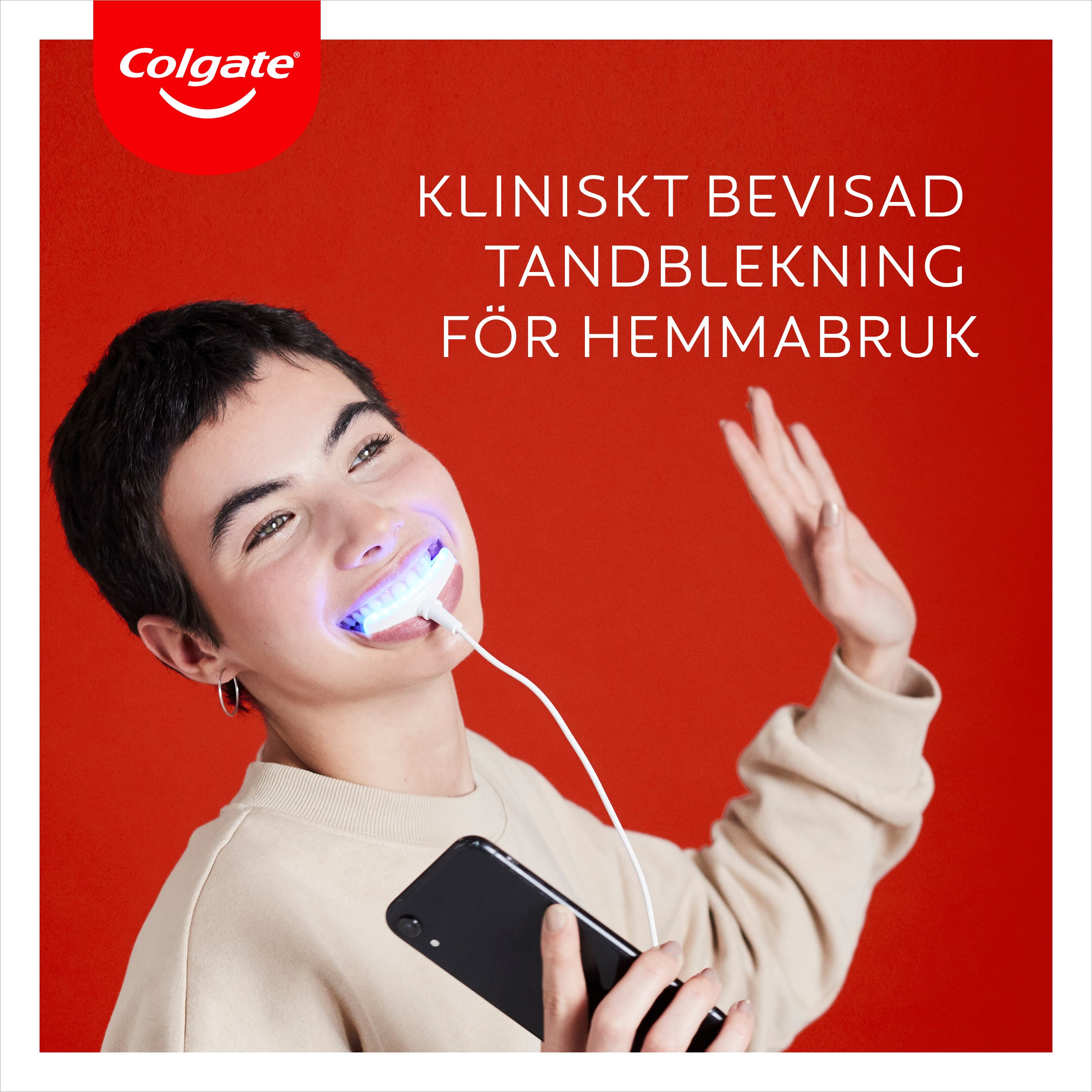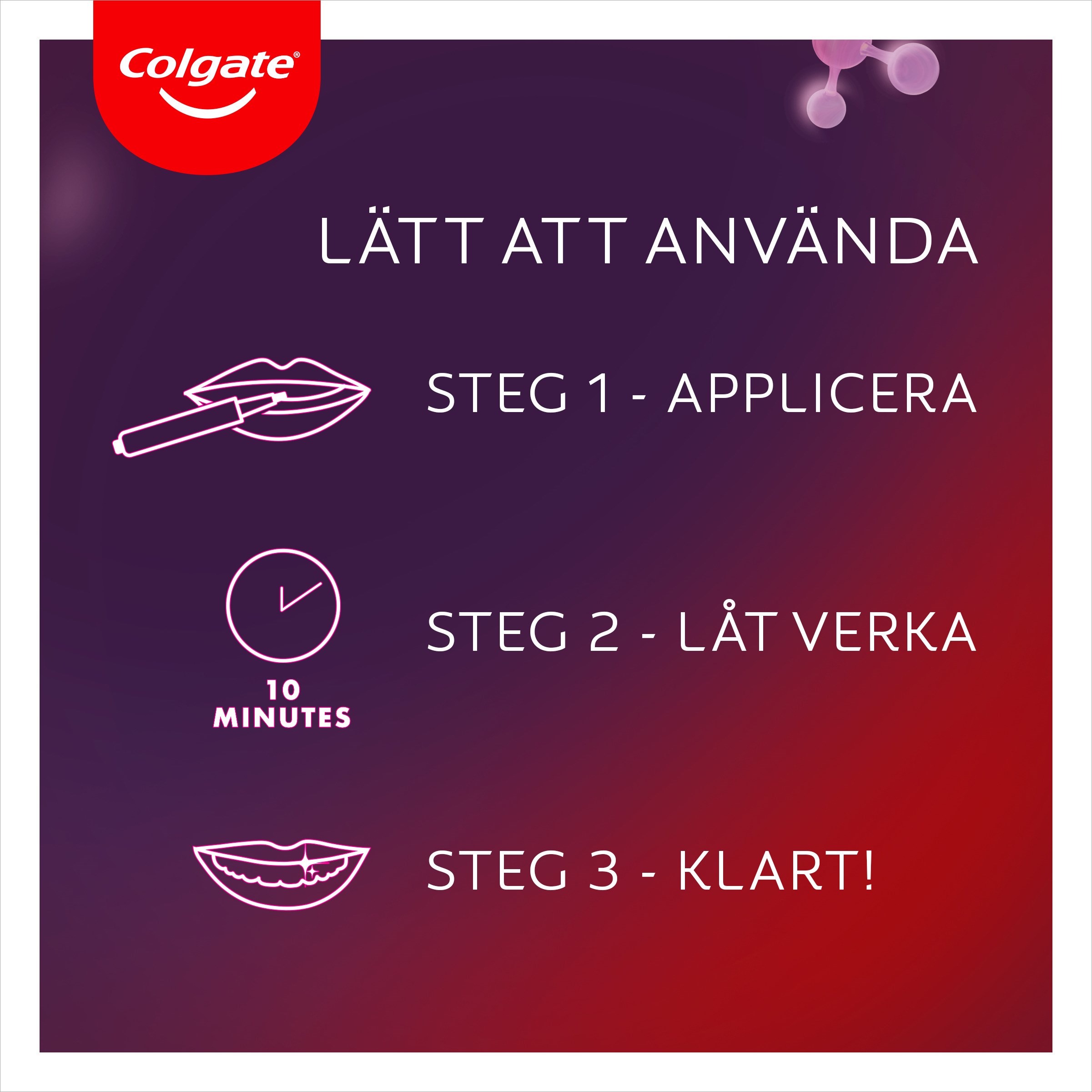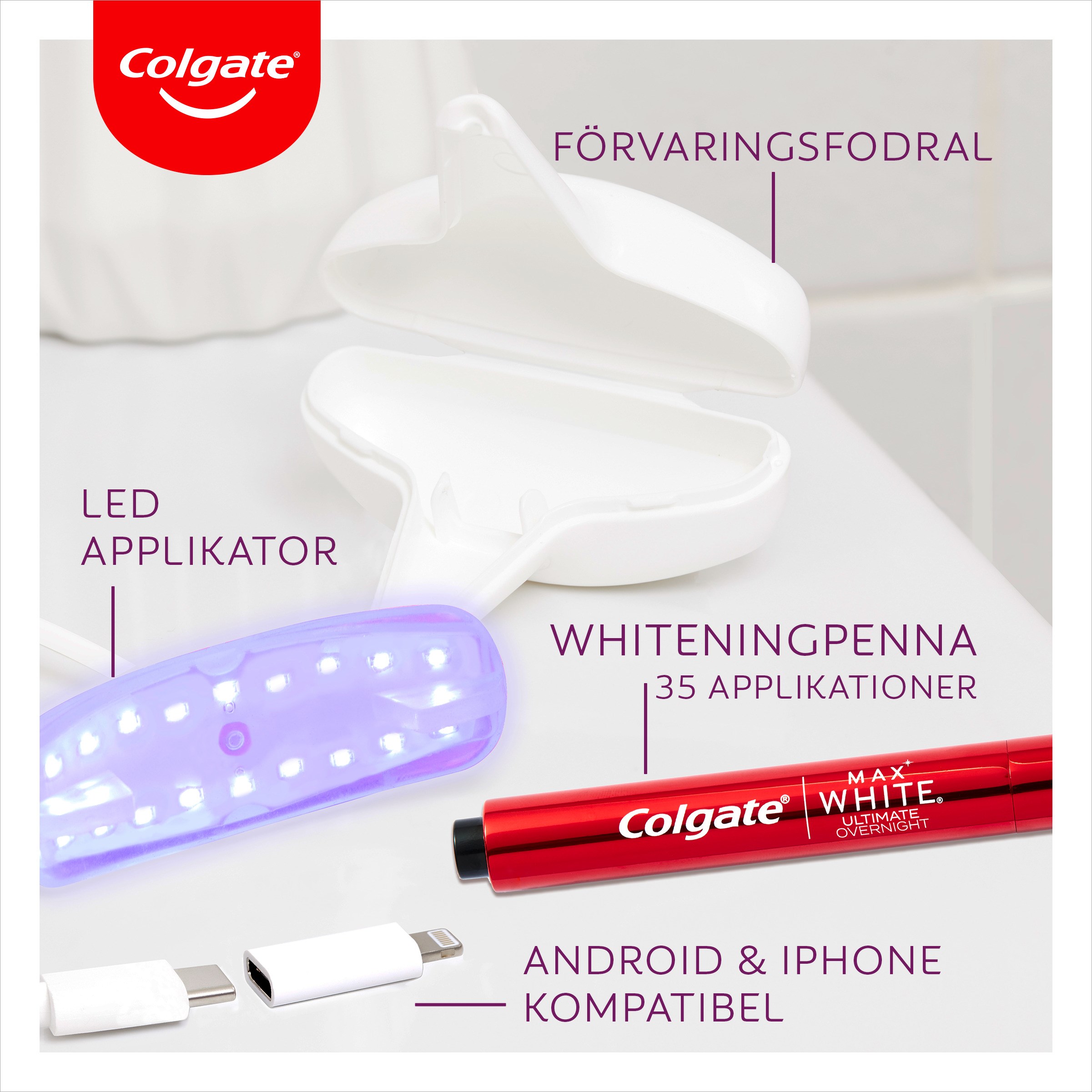 Odkryj naukę i przywróć biel zębów sprzed 20 lat* z naszym zestawem do wybielania Colgate Max White Ultimate LED Whitening Kit! Nasz zestaw do wybielania LED jest bezpieczny dla szkliwa i został opracowany przez ekspertów stomatologicznych, aby zapewnić Ci olśniewający, jaśniejszy uśmiech. Jest bardzo prosty w użyciu, dzięki naszej wybielającej kredce Max White Overnight Whitening Pen, która jest wyposażona w lampę LED z dopasowaniem ComfortFit, zasilaną z telefonu. W zaledwie 3 krokach i 10 minutach będziesz cieszyć się szerokim i białym uśmiechem w mgnieniu oka. Colgate Max White Overnight Whitening Pen wystarcza na 35 zabiegów i można ją kupić osobno jako uzupełnienie. Sposób użycia: 1. APLIKACJAPo umyciu zębów osusz górną linię ZĘBÓW chusteczką papierową.Naciśnij przycisk na końcu kredki, aby przygotować ją do pierwszego użycia. Może być konieczne naciśnięcie kilka razy (do 20), aby pierwsza kropla pojawiła się na pędzelku. Następnie przetrzyj pędzelek chusteczką papierową, aby usunąć nadmiar serum przed rozpoczęciem.Nałóż cienką warstwę serum na każdy ząb w górnej linii (1–2 naciśnięcia wystarczą na maksymalnie 4 zęby) i poczekaj 10–15 sekund, aż serum wyschnie i utworzy przezroczystą powłokę. Osusz zęby w dolnej linii i powtórz proces.Jeśli poczujesz lekkie podrażnienie, unikaj kontaktu z dziąsłami podczas aplikacji produktu.2. WYBIELANIEGdy Twoje zęby są pokryte wyschniętym serum, włóż urządzenie LED do ust. Podłącz urządzenie LED do swojego telefonu (jest kompatybilne z telefonami iPhone i Android oraz tabletami za pomocą dołączonego adaptera). Naciśnij przycisk zasilania na przewodzie, aby uruchomić urządzenie LED. Światło aktywuje serum wybielające.Oświetl przez maksymalnie 10 minut. Urządzenie wyda dźwięk po 5 minutach i dwa dźwięki oraz automatycznie się wyłączy po 10 minutach. Wyjmij urządzenie LED z ust i odłącz je od telefonu lub tabletu.3. GOTOWEUsuń wyschnięte serum, szczotkując zęby wodą** i ciesz się jaśniejszym, bielszym uśmiechem!Wybielaj przez 10 minut, 2 razy dziennie. Powtarzaj przez 14 dni, a następnie w razie potrzeby, aby utrzymać efekty.WSKAZÓWKA"Użyj Max White ULTIMATE Overnight Whitening Pen jako UZUPEŁNIENIE. Dla OPTYMALNEGO WYBIELANIA W DOMU używaj pasty do zębów Max White ULTIMATE codziennie. "**Unikaj jedzenia i picia przez 30 minut. Gdy serum wyschnie na Twoich zębach, pozostanie tam przez cały czas trwania zabiegu.CZYSZCZENIEKREDKA: przetrzyj włosie kredki suchą chusteczką papierową po każdym użyciu. Nie używaj wody! Dobrze zamknij korek, aż usłyszysz kliknięcie, aby uniknąć wyschnięcia końcówki. Jeśli końcówka wyschnie, nie płucz jej wodą. Naciśnij przycisk na końcu kredki 2–3 razy, aby nowe serum zmiękczyło włosie.LED: przepłucz końcówkę ciepłą wodą – jest wodoodporna. Nie zanurzaj złącza kabla w wodzie. Utrzymuj urządzenie w czystości i suchości do następnego użycia.*plamy spowodowane jedzeniem i piciem przy 2 tygodniach ciągłego stosowania 2 razy dziennie.