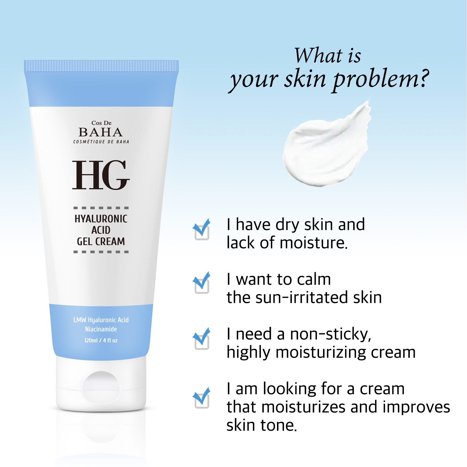 Hyaluronic Acid Gel CreamWiemy, że picie wody i porządny sen to klucz do pięknej skóry. Ale kto ma na to czas? W zabieganym świecie to prawie niemożliwe. Niektóre badania pokazują, że trzeba pić co najmniej 2–3 l wody, by utrzymać nawilżenie skóry. Kto ma na to czas? Dla tych, którzy są ciągle w biegu, kwas hialuronowy to wybawienie dla suchej skóry. Cos De BAHA stworzyło rozwiązanie, które pomaga zabieganym ludziom nawilżyć skórę szybciej i łatwiej. Ciesz się nawilżoną skórą każdego dnia!GŁĘBOKIE NAWILŻENIE! Kwas hialuronowy sprawia, że skóra staje się miękka i gładka jak po użyciu kremu. Stosuj dwa razy dziennie przez kilka tygodni, a poczujesz się kilka lat młodsza!FORMUŁA PRZECIW STARZENIU DLA MŁODZIEŃCZEGO BLASKU! Skóra niemowlaka jest tak miękka dzięki kwasowi hialuronowemu. Przywróć sobie odrobinę tej miękkości, nakładając kwas hialuronowy na skórę!NATURALNIE I ZDROWO! Kwas hialuronowy to łagodny kwas naturalnie występujący w organizmie. Mamy go w skórze, włosach, oczach i stawach. Stosowanie naturalnych składników, które organizm już zna, to najzdrowszy sposób, by wyglądać młodziej i piękniej!Informacje o bezpieczeństwie:Produkty Cos De BAHA zawierają wysokie stężenia składników. W zależności od produktu możesz doświadczyć reakcji alergicznej i pieczenia twarzy, jeśli masz wrażliwą skórę. Przetestuj pod brodą przed użyciem.Sposób użycia:Stosuj codziennie po oczyszczeniu i toniku. Nałóż odpowiednią ilość i delikatnie wmasuj dla lepszego wchłaniania.Dla najlepszych efektów stosuj rano i wieczorem, aby uzyskać miękką, gładką i piękną skórę.
