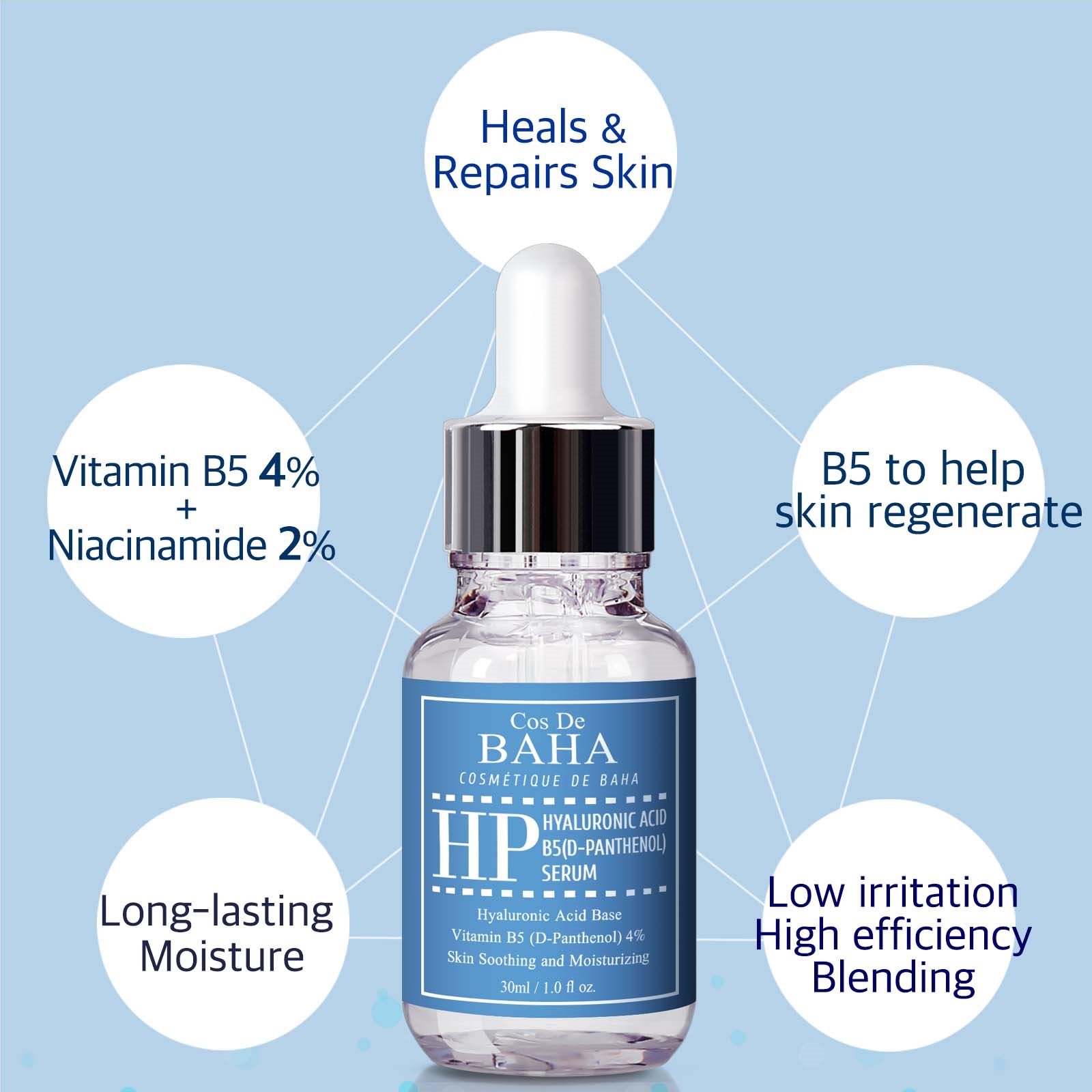 Jednym z najgorętszych produktów na rynku jest witamina B5. Serum z witaminą B5 to mnóstwo korzyści dla skóry: nawilża, koi, wyrównuje koloryt i zwiększa elastyczność. Z wiekiem skóra traci wilgoć, co prowadzi do powstawania zmarszczek i linii. Dlatego warto dostarczać jej jak najwięcej nawilżenia. Serum z witaminą B5 to jeden z najlepszych sposobów na nawilżenie.Działanie przeciwzmarszczkowe: witamina B5 przywraca naturalną barierę skóry, zapobiegając utracie wilgoci.Naprawa zmarszczek: witamina B5 nawilża skórę, przyciągając wilgoć z powietrza.D-Panthenol: tylko D-Panthenol przekształca się w witaminę B5, w przeciwieństwie do L-Panthenolu.Pamiętaj, że wszystkie sera mogą czasem powodować podrażnienia u osób z bardzo wrażliwą skórą lub nietypowymi alergiami. Zawsze przetestuj produkt na małym obszarze, najlepiej za uchem lub pod brodą. Poczekaj 24 godziny, aby sprawdzić, czy skóra zareaguje.Informacje o bezpieczeństwieProdukty Cos De BAHA zawierają wysokie stężenia składników. W zależności od produktu osoby z wrażliwą skórą mogą doświadczyć reakcji alergicznej i pieczenia twarzy. Przetestuj pod brodą przed użyciem.Sposób użycia:Stosuj codziennie po oczyszczeniu i przed nałożeniem kremu i makijażu. Nałóż odpowiednią ilość na skórę i wklep dla lepszego wchłaniania. Dla najlepszych efektów stosuj rano i wieczorem, aby uzyskać miękką, gładką i piękną skórę.