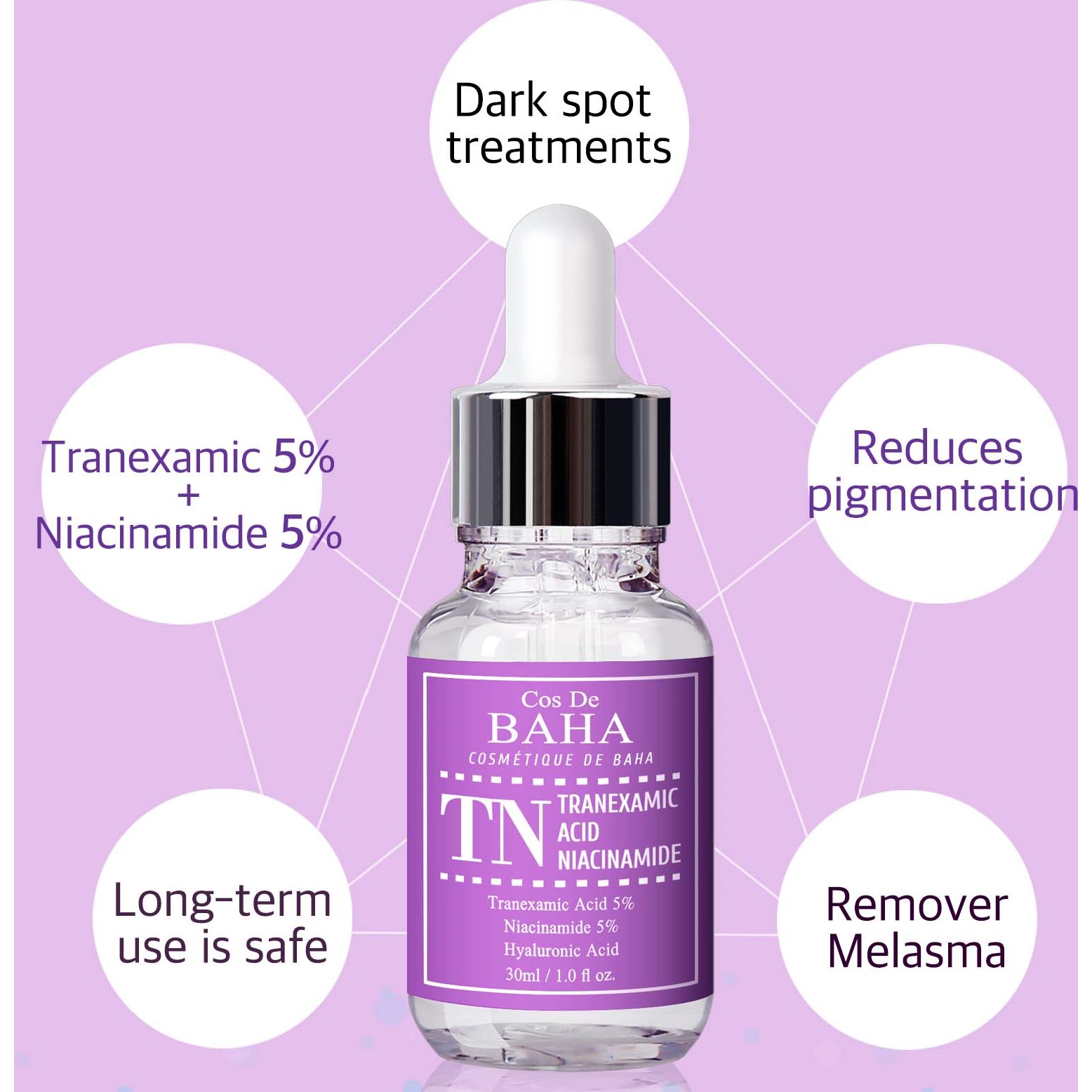 Masz dość ciemnych plam i blizn po trądziku? To serum z kwasem traneksamowym i niacynamidem rozjaśnia przebarwienia i ciemne plamy. Zielona herbata koi i chroni skórę, a ekstrakt z aloesu i hialuronian sodu zapewniają nawilżenie. Bez siarczanów i olejów mineralnych, odpowiednie dla wrażliwej skóry.Korzyści:Serum, które skutecznie zwalcza przebarwienia.Kwas traneksamowy to jeden z najpopularniejszych składników rozjaśniających skórę.Zapobiega pozapalnym przebarwieniom.Zmniejsza wrażliwość skóry na promienie UV.Bez 8 szkodliwych składników, w tym siarczanów i olejów mineralnych.Pomaga rozjaśnić uporczywe blizny po trądziku.Informacje o bezpieczeństwieProdukty Cos De BAHA zawierają wysokie stężenia składników. W zależności od produktu możesz doświadczyć reakcji alergicznej i pieczenia twarzy przy wrażliwej skórze. Przetestuj pod brodą przed użyciem.Sposób użycia:Stosuj codziennie po oczyszczeniu i przed nałożeniem kremu i makijażu. Nałóż odpowiednią ilość na skórę i wklep dla lepszego wchłaniania. Dla najlepszych efektów używaj rano i wieczorem, aby uzyskać miękką, gładką i piękną skórę.