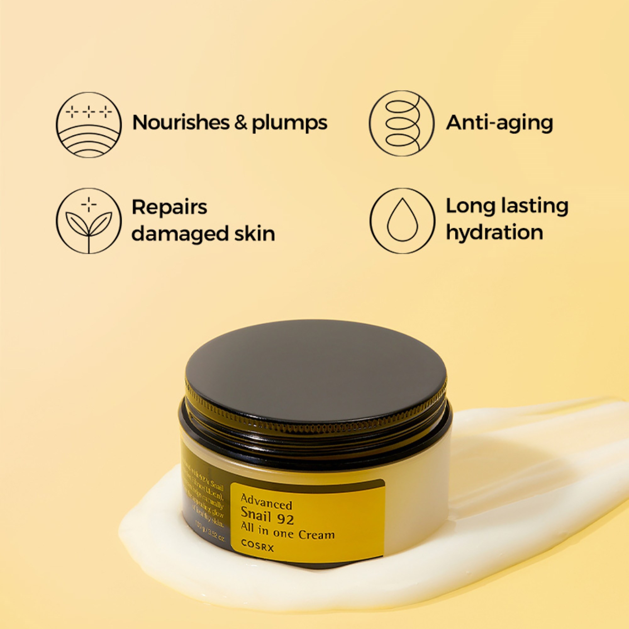 Bogata formuła kremu zawierająca 92% śluzu ślimaka. Pomaga zachować naturalny blask i zdrowy wygląd skóry poprzez odżywienie i nawilżenie skóry.