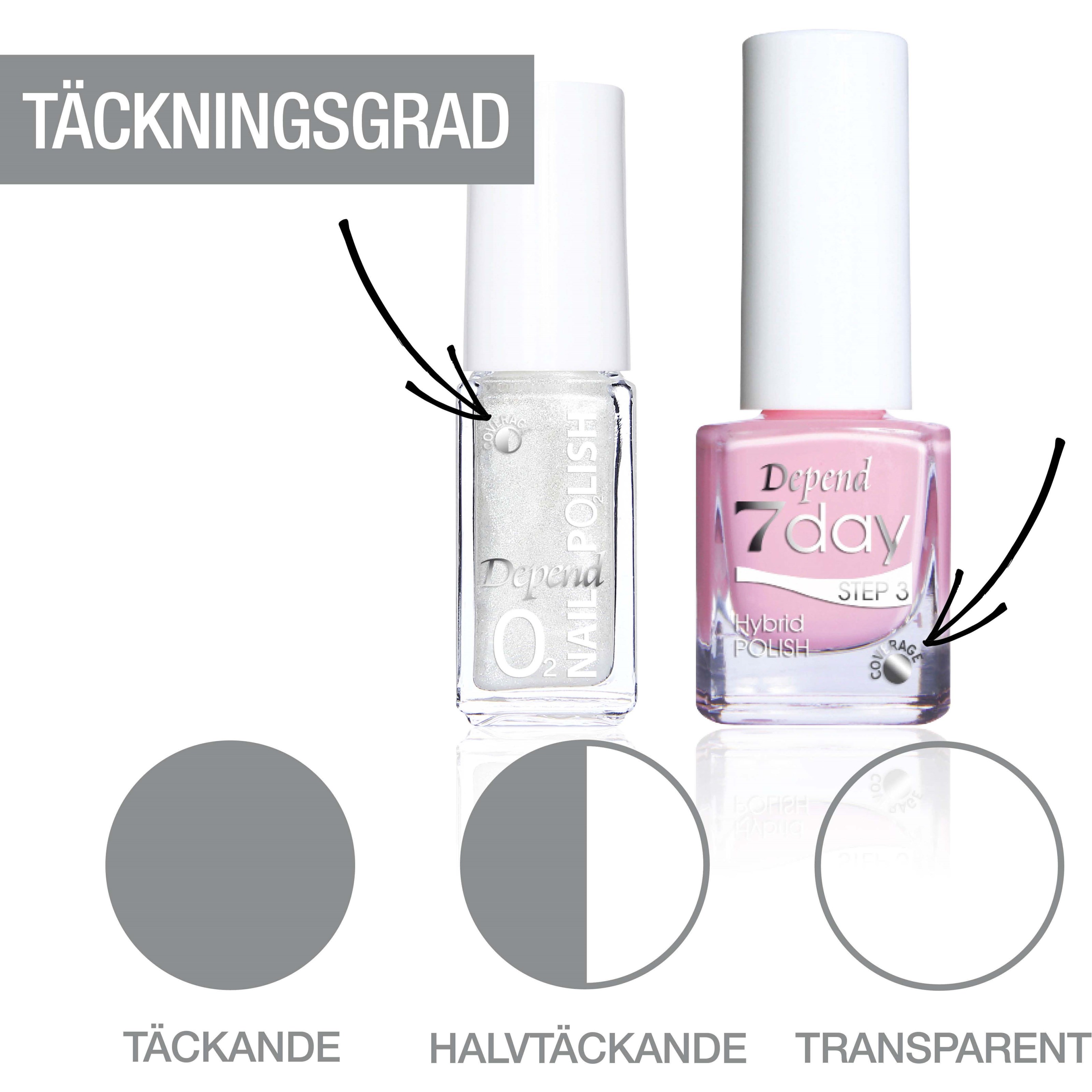 Depend 7day to system lakierów dla tych, którzy szukają lakieru o superpołysku, wysokiej trwałości i efekcie „żelu”. Ta hybrydowa formuła utrzymuje się do tygodnia, jest łatwa w aplikacji, a zmywanie lakieru to bułka z masłem dzięki zmywaczowi Depend. Nie potrzebujesz lampy LED/UV, ponieważ system lakierów utwardza się w normalnym świetle dziennym lub lampowym. Butelka jest oznaczona symbolami, które pokazują stopień krycia lakieru: kryjący, półkryjący lub transparentny.