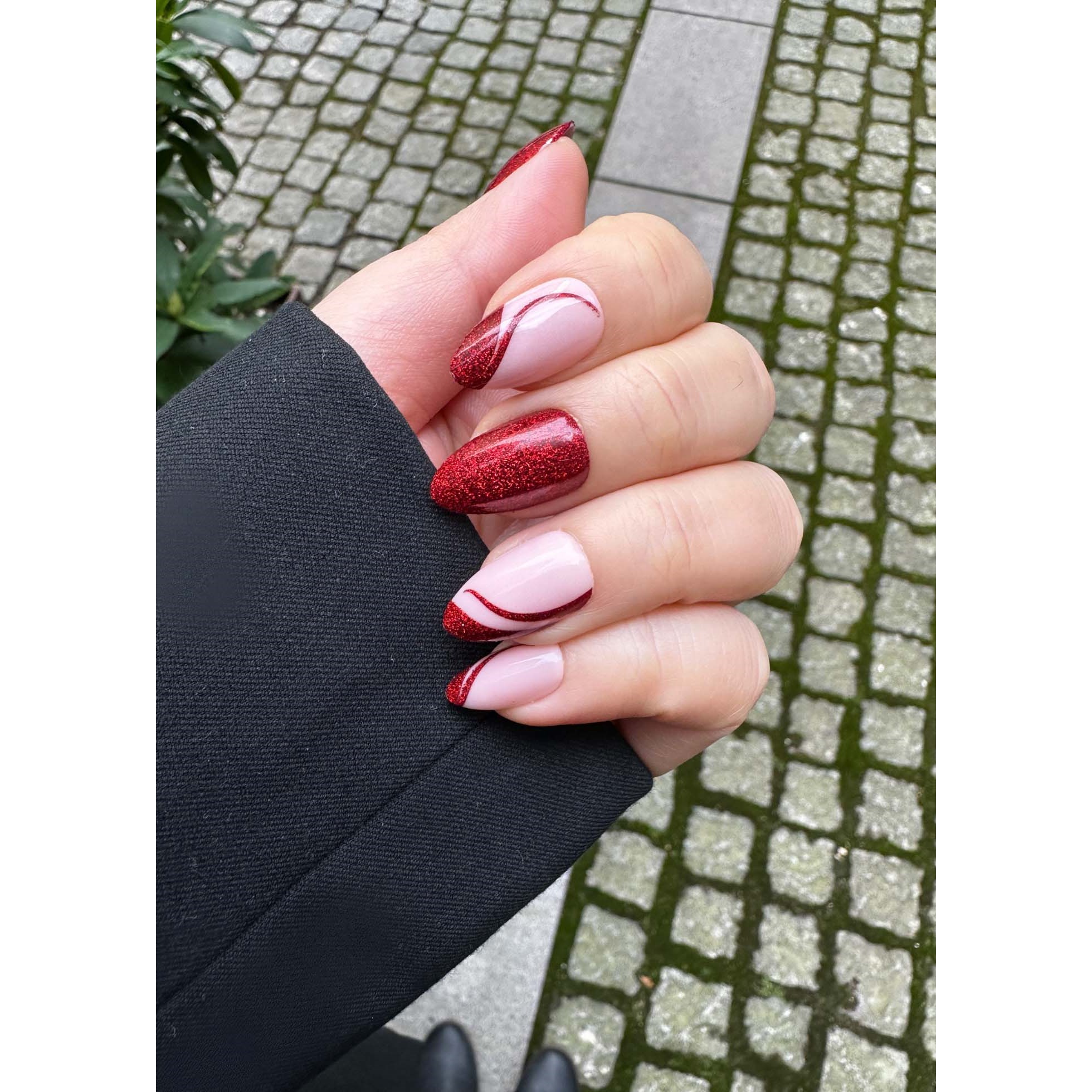 DUFFBEAUTY Instant Pro Press-On Manicure Space Cherry to imprezowy i zabawny zestaw, który przyciąga wzrok lśniącą czerwienią. Eleganckie wiry dodają paznokciom kreatywnego twistu, idealne, gdy chcesz dodać stylizacji paznokci to „coś” ekstra.Zestaw zawiera:- 30 paznokci w 15 rozmiarach, pilnik, klej do paznokci, chusteczka nasączona alkoholem i drewniany patyczekSposób użycia:1. Nałóż na czyste, suche paznokcie.2. Odsuń skórki drewnianym patyczkiem i delikatnie spiłuj paznokcie. Przetrzyj chusteczką nasączoną alkoholem.3. Wybierz paznokieć, który najlepiej pasuje do każdego palca. Upewnij się, że numer jest skierowany w stronę końcówki naturalnego paznokcia.4. Nałóż klej na naturalny paznokieć i poczekaj 20–30 s, aż paznokcie staną się lepkie.5. Umieść sztuczny paznokieć pod skórką i dociśnij kciukiem. Przytrzymaj paznokieć 40–60 s.Jak usunąć:Mocz paznokcie w ciepłej wodzie z mydłem przez 30–40 min, a następnie delikatnie podważ sztuczny paznokieć z boku. Aby uniknąć uszkodzeń, nigdy nie odrywaj paznokci na siłę.