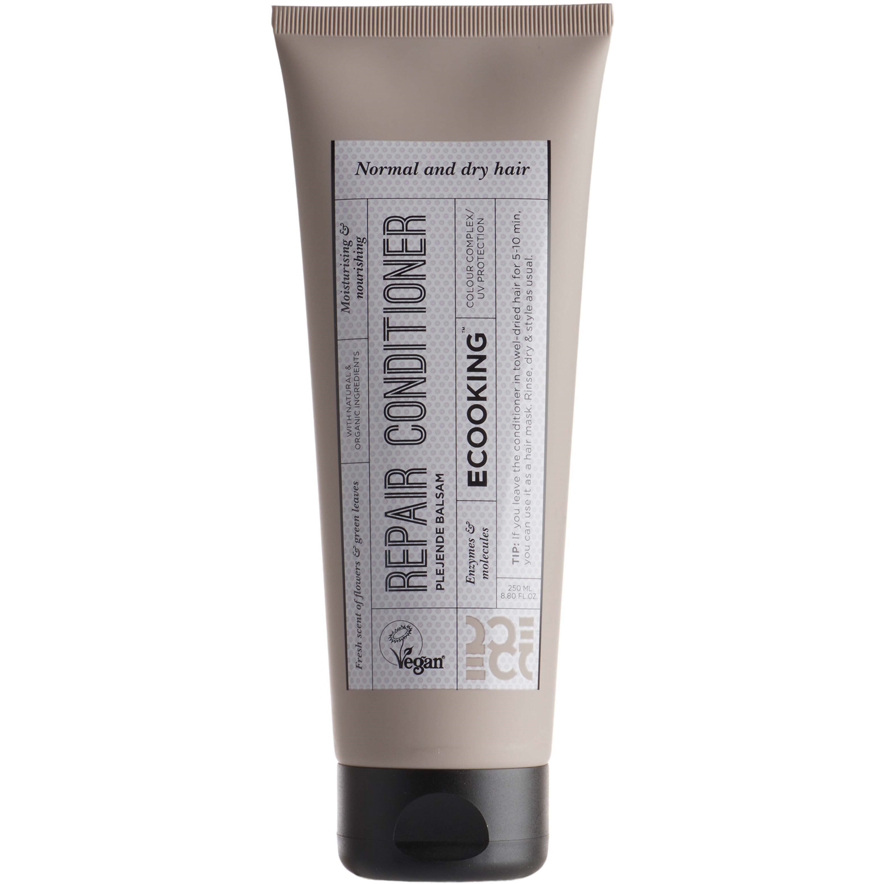 Odżywka do włosów normalnych i suchych o świeżym zapachu kwiatów i zielonych liści. Nowa odżywka Ecooking Repair Conditioner nawilża i odżywia suche włosy. Odżywka zawiera kompleks nawilżający, który zapewnia pasmom nawilżenie nawet przez 72 godziny, ma również działanie kondycjonujące, które wzmacnia włosy i nadaje im jedwabistą gładkość. Ponadto w jej składzie znajduje się kompleks koloryzujący oraz ochrona przed promieniowaniem UVA i zanieczyszczeniami, które chronią włosy i ich kolor – zarówno naturalne, jak i farbowane – m.in. przed słońcem, wodą, powietrzem i zanieczyszczeniami.