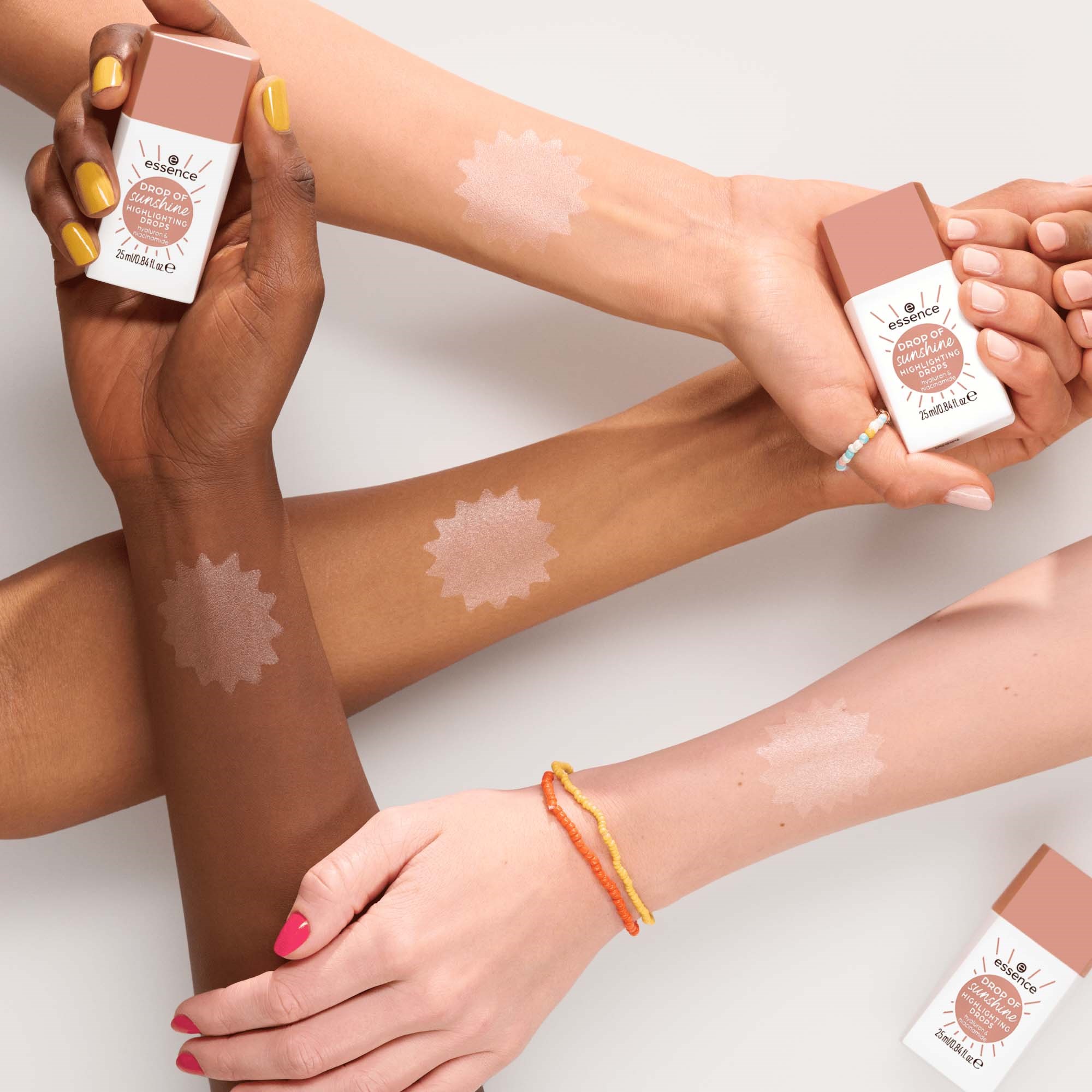 Podkręć glow z essence Drop Of Sunshine Highlighting Drops. Uniwersalny odcień wtapia się w skórę, dodając jej blasku. Krople z kwasem hialuronowym i niacynamidem sprawiają, że skóra staje się miękka i nawilżona. Użyj solo dla naturalnego efektu lub dodaj do kremu, bazy lub podkładu, by uzyskać pełne rozświetlenie. Wstrząśnij opakowaniem przed użyciem i ciesz się promiennym wykończeniem.