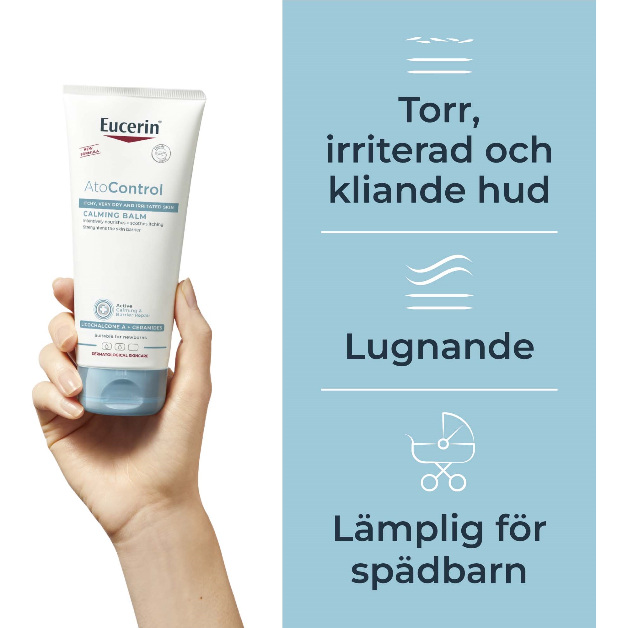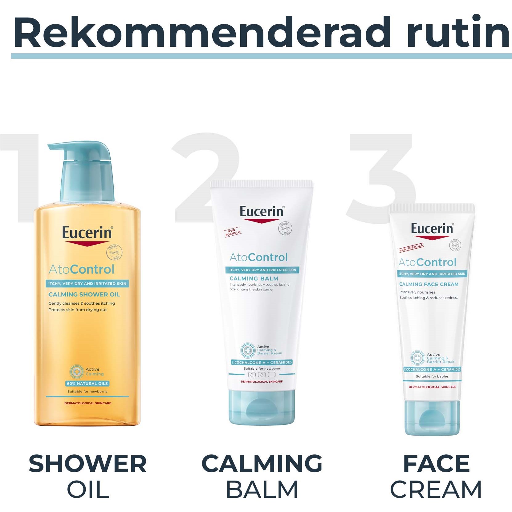 Eucerin AtoControl Calming Balm to balsam do twarzy i ciała, który pielęgnuje i koi podrażnioną, suchą skórę. Głęboko nawilża i ma ultralekką formułę, która szybko się wchłania. Poprawia kondycję skóry przy regularnym stosowaniu.Formuła wzbogacona kojącą licochalconą A (ekstrakt z korzenia lukrecji), lipidami (kwasy omega-3 i 6 oraz ceramidy) i masłem shea wzmacnia barierę ochronną skóry.Badania kliniczne i dermatologiczne potwierdzają: świetne działanie i przyjazność dla skóry, nawet bardzo wrażliwej.Bezzapachowy. Odpowiedni dla niemowląt (także w okolicach pieluszkowych) od 1. miesiąca życia.- Intensywnie pielęgnuje i koi podrażnioną, suchą skórę. Odpowiedni dla bardzo wrażliwej skóry.- Lekka tekstura szybko się wchłania- Intensywnie nawilża- Poprawia kondycję skóry przy regularnym stosowaniu- Bezzapachowy, odpowiedni dla niemowląt Sposób użycia: Stosuj tak często, jak potrzebujesz. Dla najlepszych efektów używaj z Eucerin AtoControl Calming Shower Oil.