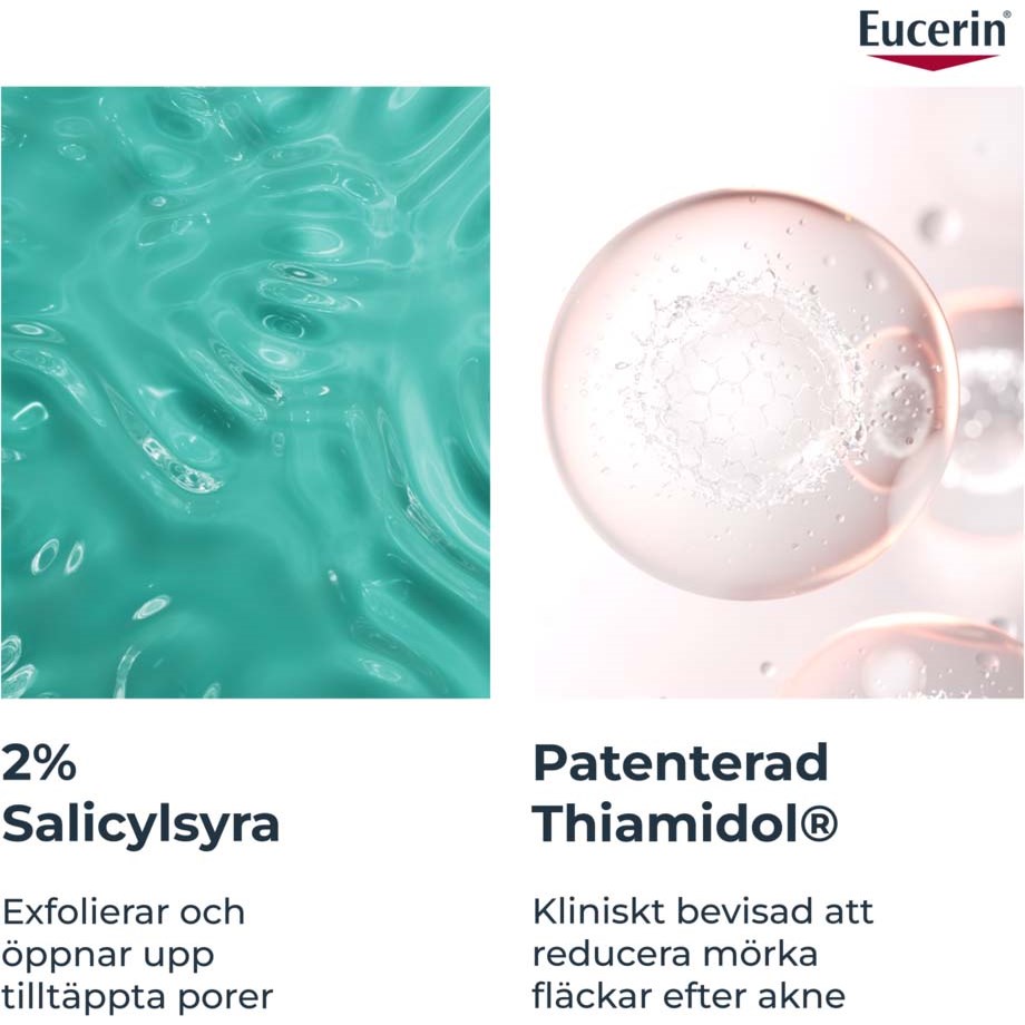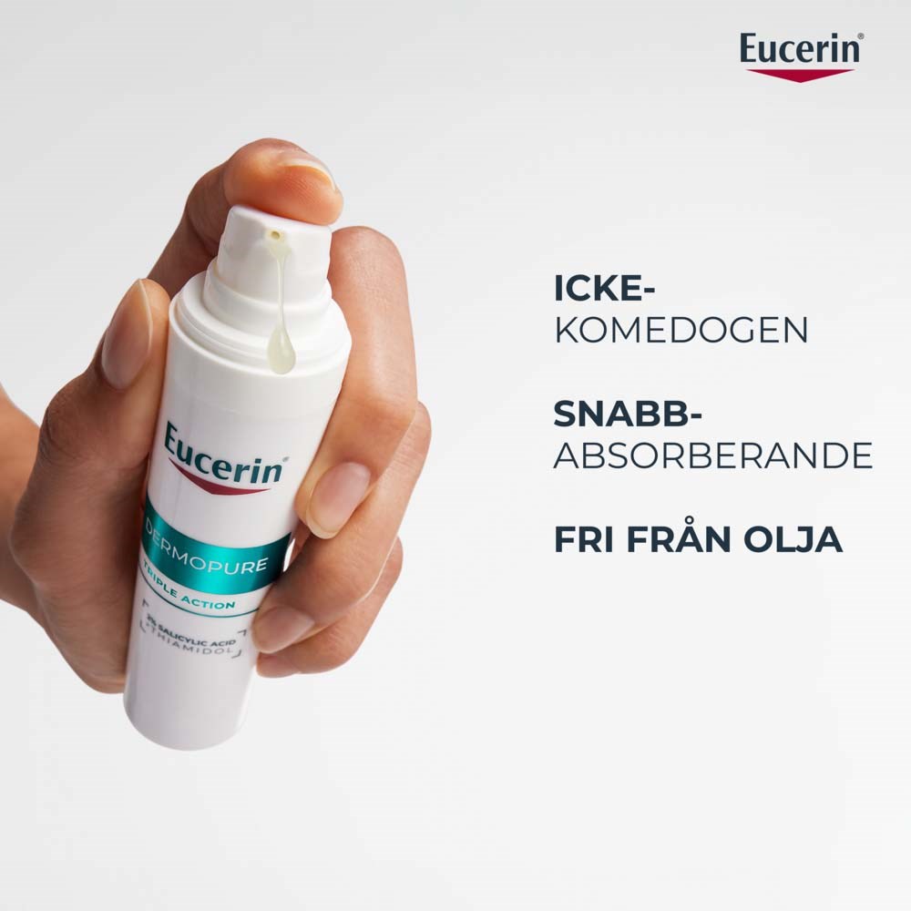 Eucerin DermoPure Triple Action Serum to potrójnie działające serum bez oleju, które widocznie redukuje niedoskonałości, zaskórniki i ciemne plamy po trądziku. Polecane do tłustej i trądzikowej skóry, zawiera unikalne połączenie składników aktywnych: 2% kwasu salicylowego, który złuszcza skórę i redukuje plamy, oraz Thiamidol®, który zmniejsza ciemne plamy po trądziku.Serum jest klinicznie testowane, aby zachować mikrobiom skóry i działa już od pierwszego dnia. Odpowiednie dla wszystkich rodzajów skóry od 12. roku życia.- Serum bez oleju do tłustej i trądzikowej skóry- Redukuje niedoskonałości i zaskórniki- Zmniejsza ciemne plamy po trądziku- Klinicznie testowane, zachowuje mikrobiom skóry- NawilżaStosuj 2 razy dziennie na suchą skórę po użyciu DERMOPURE Cleanser. Unikaj kontaktu z oczami. Może wystąpić lekkie mrowienie. Nie nakładaj na mocno zaognione wypryski. Nie używaj z innymi produktami zawierającymi Thiamidol®.