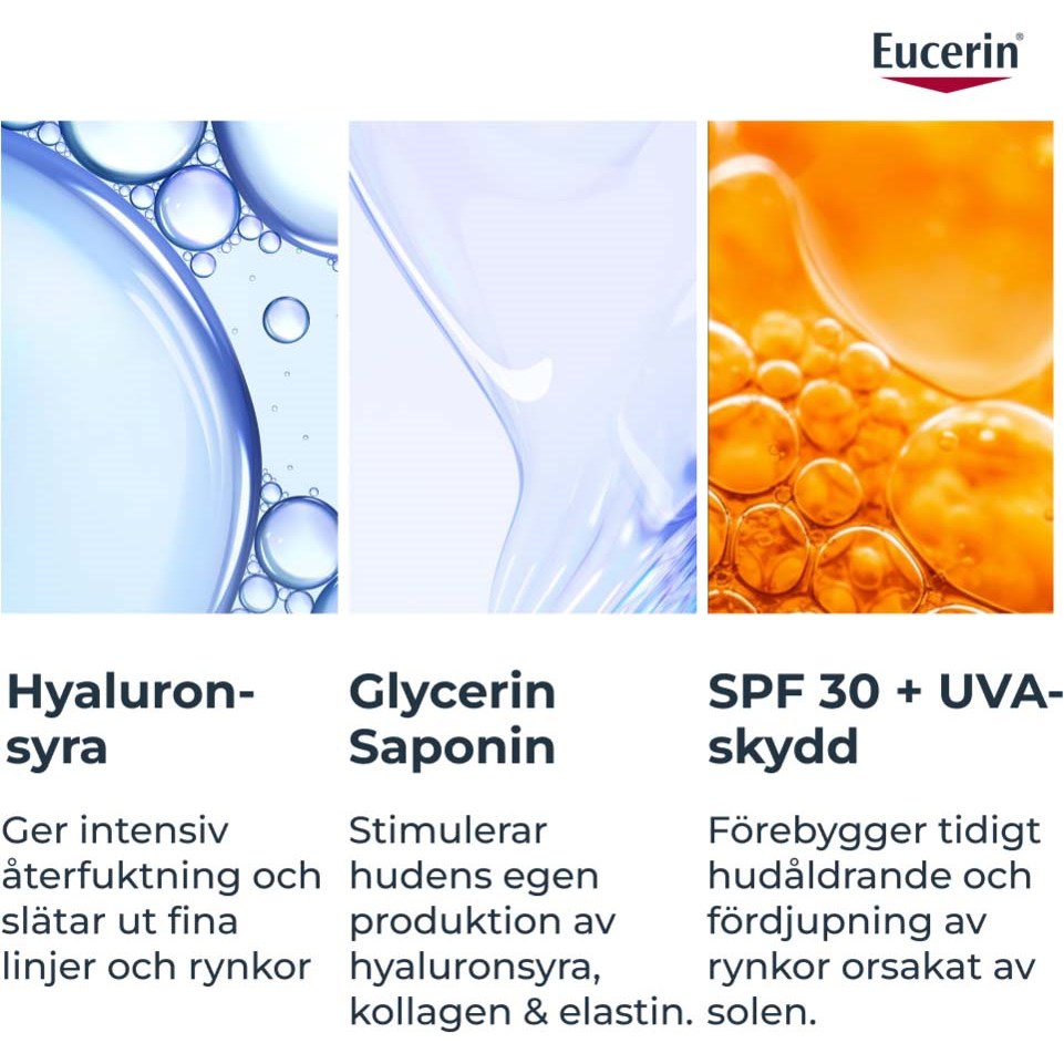 Eucerin Hyaluron-Filler +3x Effect Day Cream SPF30 Refill to krem do twarzy z SPF w opakowaniu refill. Z wiekiem naturalna produkcja kwasu hialuronowego w skórze maleje, co prowadzi do powstawania zmarszczek i sprawia, że skóra wygląda na starszą. Innowacyjna formuła z potrójnym działaniem pomaga przeciwdziałać tym procesom. Krem z wysokocząsteczkowym i niskocząsteczkowym kwasem hialuronowym nawilża i wypełnia zmarszczki. Przeciwutleniacz saponina aktywuje naturalną produkcję kwasu hialuronowego nawet o 256% i chroni skórę przed wolnymi rodnikami. Enoksolon zmniejsza rozkład kwasu hialuronowego o ponad 50%. Ten nawilżający krem, odpowiedni dla wszystkich rodzajów skóry, zawiera SPF 30, ochronę UVA i saponinę, które skutecznie przeciwdziałają fotostarzeniu, pogłębianiu się zmarszczek i chronią skórę przed wolnymi rodnikami. Efekt to widocznie młodsza, gładsza i promienna cera. Ekologiczne opakowanie zawiera 90% mniej plastiku niż standardowy słoiczek Hyaluron-Filler. Pomagasz zmniejszyć ilość odpadów i przyczyniasz się do bardziej zrównoważonego cyklu życia produktu. Kompatybilny ze wszystkimi słoiczkami Eucerin. Sposób użyciaNałóż rano na oczyszczoną twarz, szyję i dekolt. Delikatnie wmasuj w skórę. Nie przechowuj w temperaturze powyżej 25°C. Unikaj kontaktu z oczami.