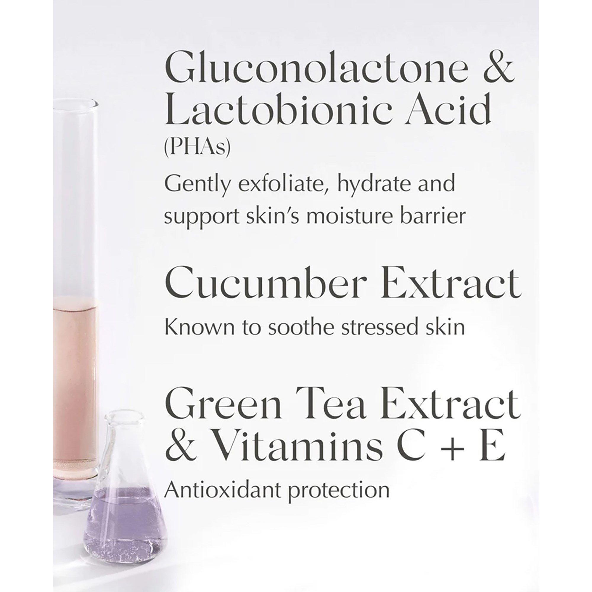 Rozjaśniające i delikatnie złuszczające płatki, które jednocześnie stymulują odnowę komórek i intensywnie nawilżają. Płatki nasycone są obfitą mieszanką kwasu owocowego PHA, który wzmacnia barierę ochronną skóry i przeciwdziała oznakom starzenia. Witaminy C i E, w połączeniu z ekstraktem z zielonej herbaty, wzmacniają silną ochronę antyoksydacyjną. Wyciąg z ogórka zapewnia cudowne uczucie odświeżenia.