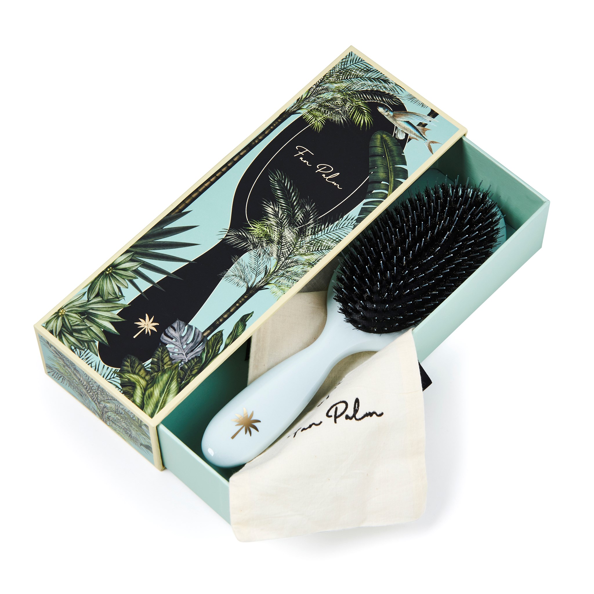 Fan Palm Medium Jungle Brush z włosiem i nylonem dodaje włosom blasku i miękkości. Nylonowe włosie delikatnie stymuluje skórę głowy i ułatwia rozczesywanie, a naturalne włosie rozprowadza sebum. Szczotka pobudza krążenie krwi w mieszkach włosowych, a wiele osób zauważa, że mogą myć włosy co 3–4 dni. Produkt zapakowany w stylowe pudełko ze złotymi detalami.Sposób użycia:Zacznij szczotkowanie od końcówek. Delikatnie rozczesz splątane pasma, a następnie kieruj się w górę.