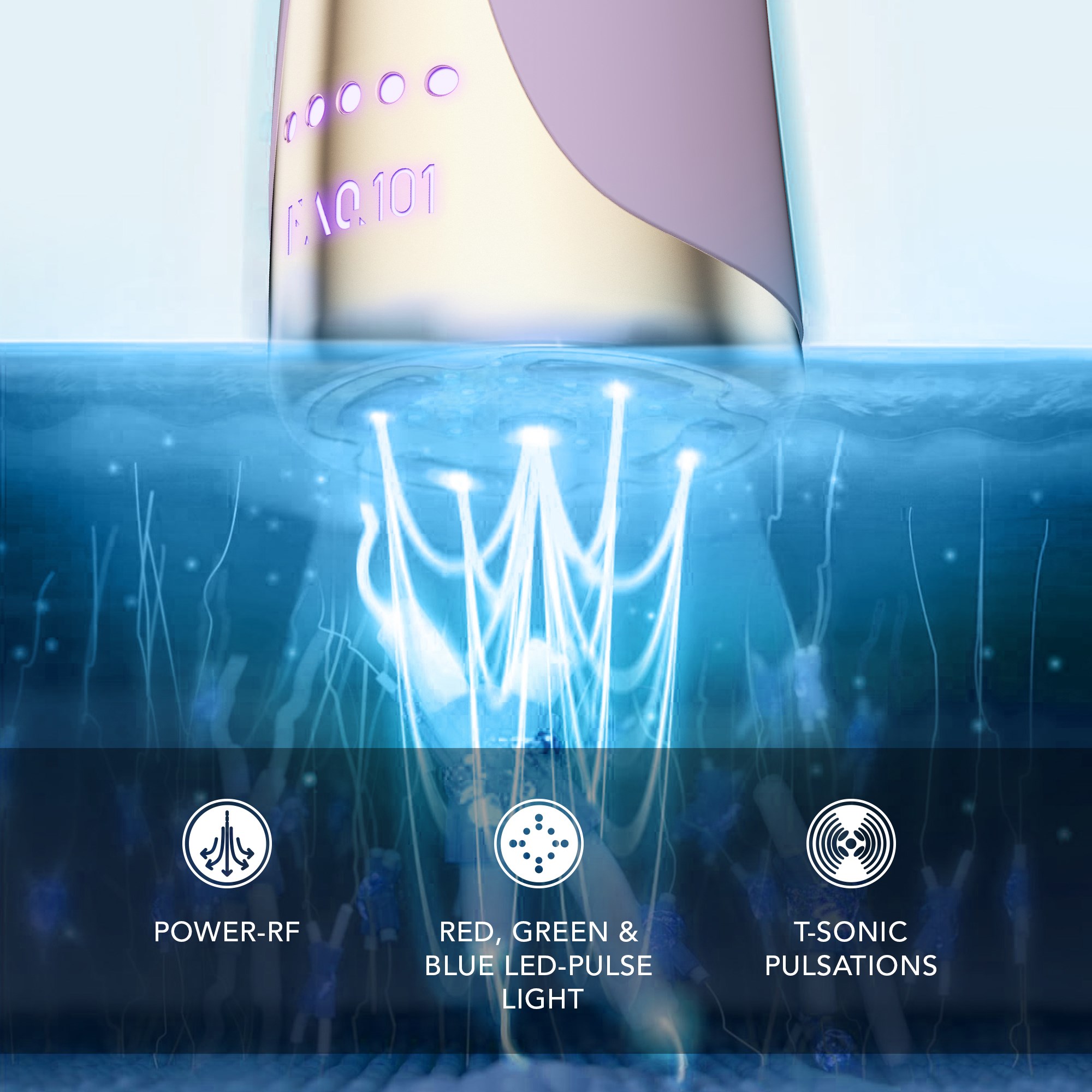 Wkrocz w niezbadane obszary klinicznego anti-aging. FAQ™ 101 jest idealnym wstępem do zabiegów power-RF & LED-pulse pro. Urządzenie jest wyposażone w podgrzewane fale o częstotliwości radiowej i pulsujące czerwone, zielone i niebieskie światła LED oraz pulsacje T-Sonic™.