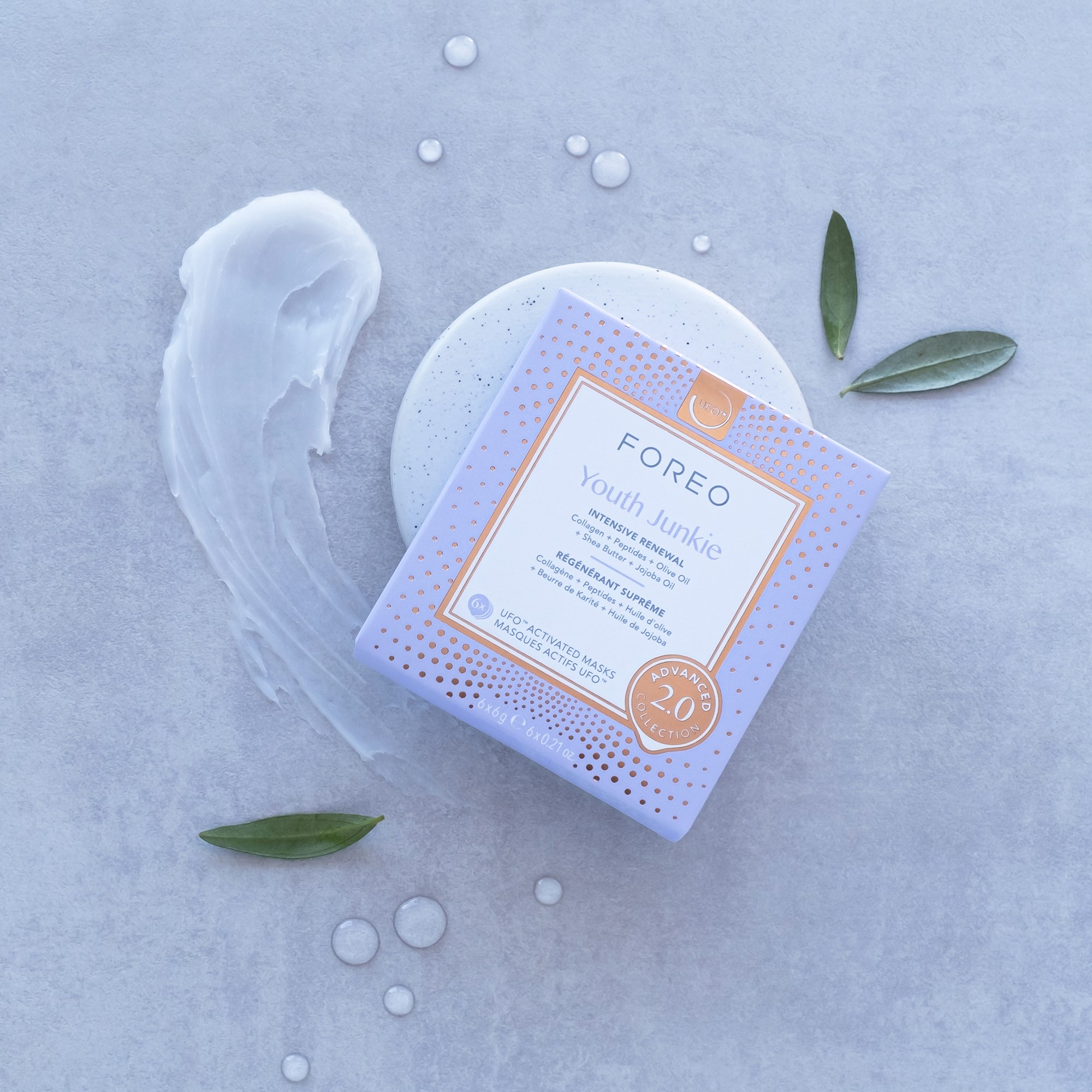 Idealne uzupełnienie dla Twojego FOREO UFO™!Youth Junkie 2.0 to intensywnie regenerująca maska stworzona specjalnie dla suchej skóry z drobnymi liniami, aby poprawić elastyczność, teksturę i odporność skóry. Naprawcze peptydy chronią i wzmacniają barierę skórną, działają przeciwzapalnie i wyrównują koloryt cery. Maska zapewnia zwiększoną elastyczność i jędrność, dając efekt młodszej i bardziej sprężystej skóry. Jej moc antyoksydacyjna chroni przed uszkodzeniami spowodowanymi wolnymi rodnikami, jednocześnie nawilżając i wygładzając suchą oraz dojrzałą skórę, przywracając równowagę nawilżenia. Idealna dla osób z drobnymi liniami, uszkodzeniami od wolnych rodników, suchością i utratą elastyczności.Składniki i korzyści:- Kolagen odbudowuje skórę, redukuje drobne linie oraz poprawia elastyczność i odporność- Peptydy wzmacniają barierę skórną, działają przeciwzapalnie i wyrównują koloryt cery. Chronią również przed bakteriami, promieniowaniem UV i toksynami- Oliwa z oliwek działa jako potężny antyoksydant, chroniąc przed starzeniem i wolnymi rodnikami- Masło shea ma właściwości przeciwzapalne, głęboko nawilża i tworzy ochronną barierę- Olej jojoba reguluje produkcję sebum, zapewnia głębokie nawilżenie i zawiera antyoksydanty, które zwalczają wolne rodnikiDermatologicznie testowana, wegańska i przyjazna dla zwierząt. Każde opakowanie zawiera 6 masek.Sposób użycia:1. Zdejmij pierścień z UFO™, nałóż maskę na urządzenie i przymocuj ją, klikając z powrotem pierścień z logo FOREO do góry.2. Wybierz zabieg stworzony specjalnie dla maski lub dostosuj własny zabieg za pomocą aplikacji FOREO For You.3. Wmasuj maskę w czystą skórę okrężnymi ruchami na twarzy, aż zabieg się zakończy i Twoje UFO™ wyłączy się. Delikatnie wklep nadmiar serum palcami lub rozpocznij kolejny zabieg.