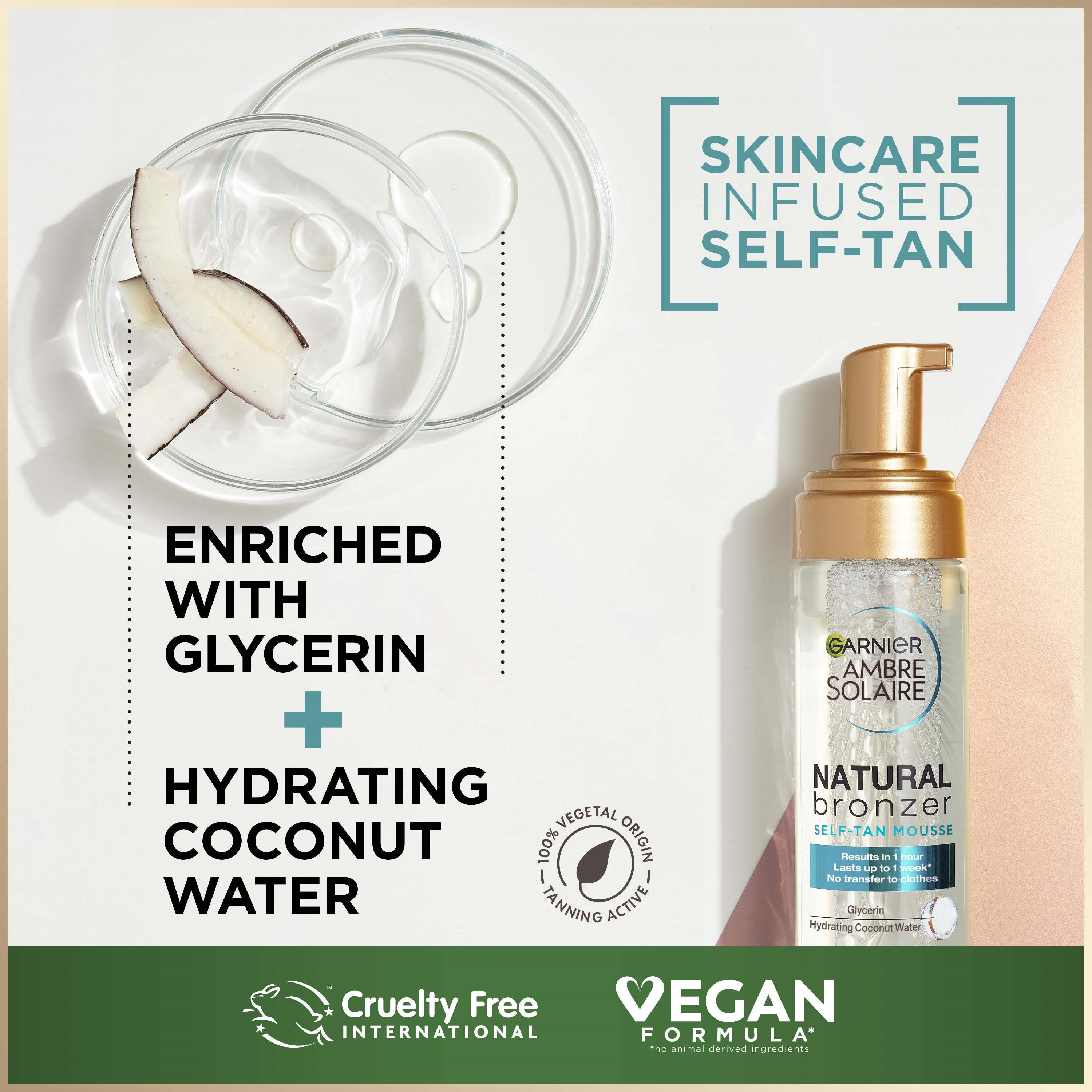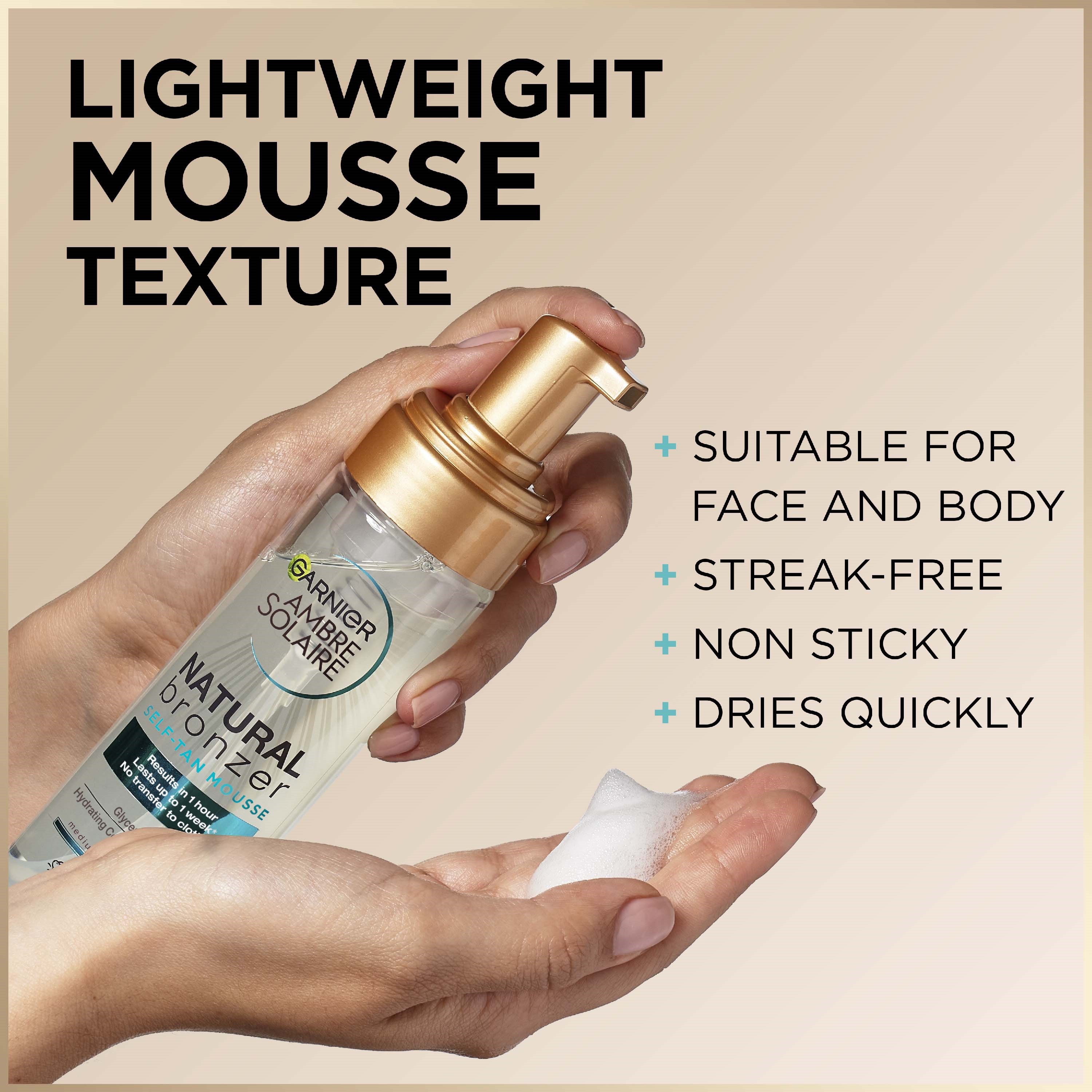 Garnier Ambre Solaire Natural Bronzer Self Tan Mousse ma wegańską formułę** z 92% składników pochodzenia naturalnego. Mus błyskawicznie się wchłania, pozostawiając piękną, naturalnie wyglądającą opaleniznę już po pierwszej aplikacji. Efekt utrzymuje się do tygodnia*. *Test instrumentalny. **Bez składników ani produktów ubocznych pochodzenia zwierzęcego.Sposób użycia:1. Złuszcz skórę. 2. Aplikuj równomiernie na skórę. 3. Dokładnie umyj ręce po każdej aplikacji.- Unikaj kontaktu z odzieżą. Produkt nie chroni skóry przed promieniowaniem UV. W razie kontaktu z oczami natychmiast przepłucz je dużą ilością wody.