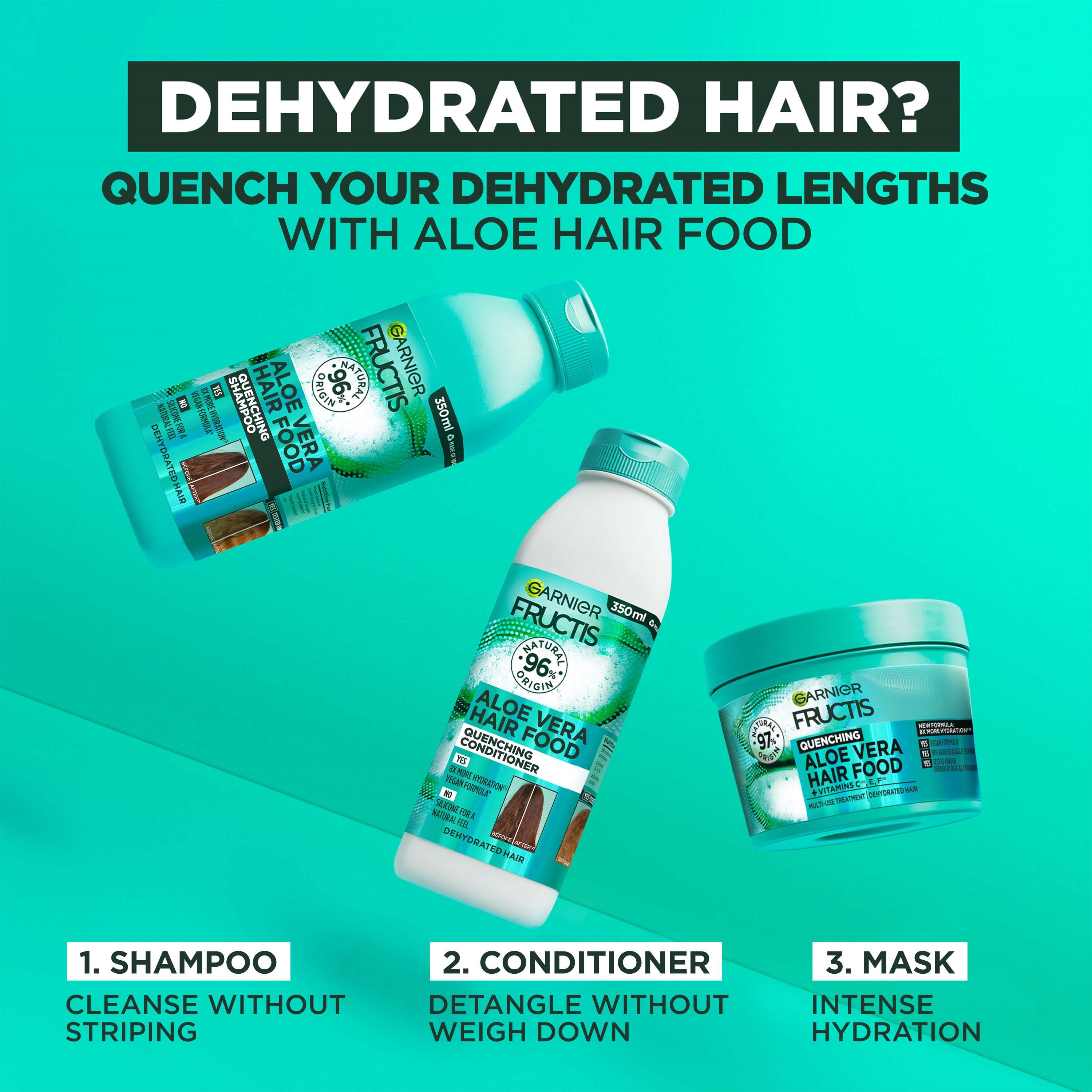 Garnier Fructis Hair Food Aloe Vera Quenching Conditioner to odżywka do suchych włosów, która nawilża, wzmacnia włókna włosów i sprawia, że są one aż 8 razy bardziej nawilżone*. Wegańska formuła** bez silikonów, która daje naturalne uczucie, wzbogacona o kwasy omega 3, 6 i 9 oraz 4% kwasów tłuszczowych.- 8 razy bardziej nawilżone włosy*- Intensywne nawilżenie- Wzmacnia włókna włosów- Wegańska formuła**- 97% składników pochodzenia naturalnego i 98% biodegradowalna***- Garnier zatwierdzone przez Cruelty Free International w ramach programu Leaping Bunny- Butelka w 100% z recyklingowanego plastiku****, która jest również poddawana recyklingowi* Test instrumentalny po użyciu szamponu + odżywki **Brak składników pochodzenia zwierzęcego ***Zgodnie z testem OECD 301 lub równoważnym testem ISO ****Z wyjątkiem nakrętki, barwników i dodatkówSposób użycia:Po umyciu szamponem: Nałóż na wilgotne długości i końcówki. Spłucz. Uzupełnij swoją rutynę o szampon Fructis Hair Food Aloe Vera i wielofunkcyjną maskę do włosów.