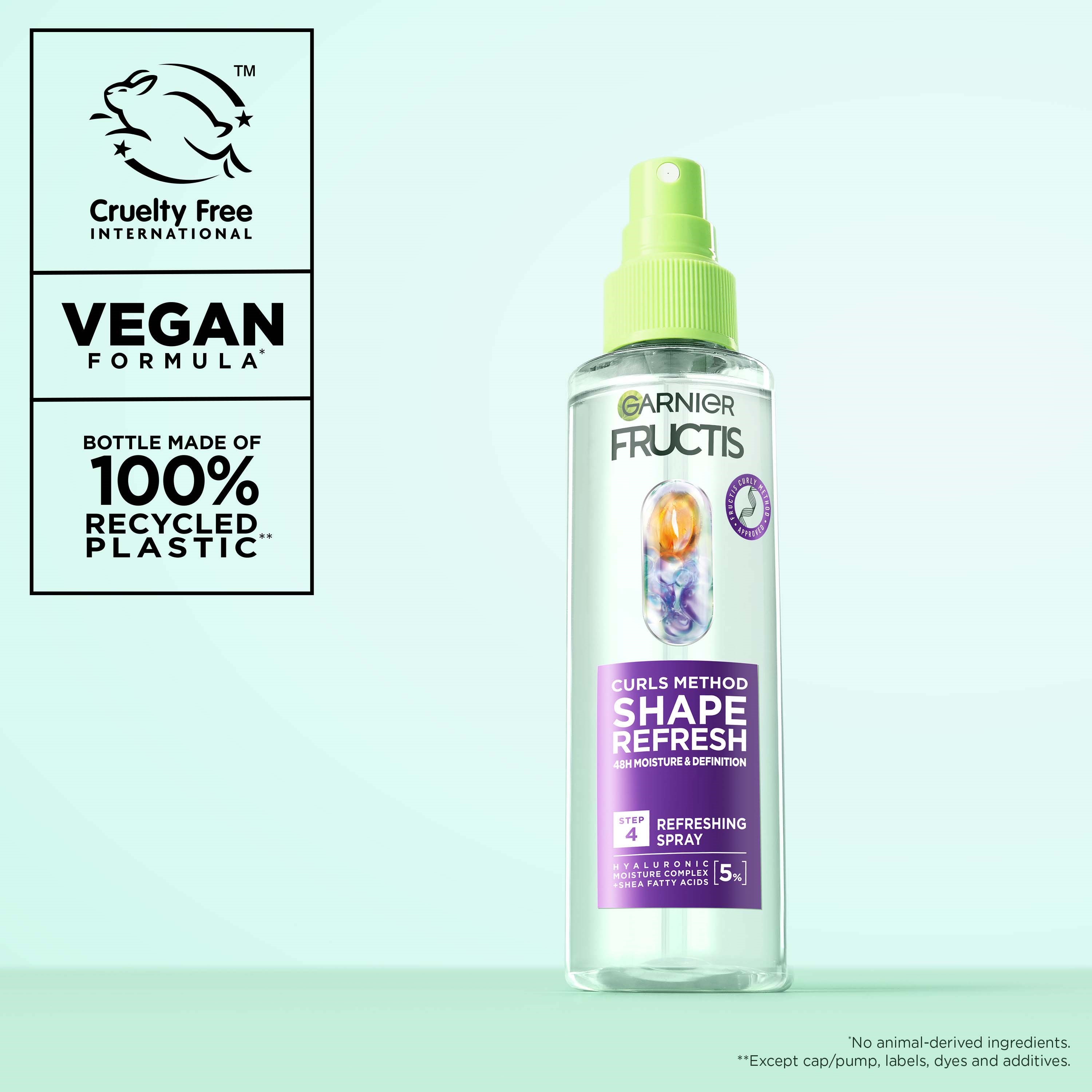 Garnier Fructis Method for Curls Spray to idealne rozwiązanie dla osób, które pragną zadbać o swoje kręcone włosy. Produkt stanowi ostatni krok w rutynie Method for Curls, który odświeża loki, zapewniając im nawilżenie i podkreślenie skrętu na 48 godzin*. Formuła wzbogacona jest o 5% kompleks nawilżający z kwasem hialuronowym i kwasami tłuszczowymi z masła shea. Działa na wszystkich typach kręconych włosów. Uzupełnij swoją rutynę o Fructis Method for Curls N°0 nawilżający pre-szampon, n°1 delikatny szampon oraz n°2 nawilżającą maskę do włosów. – Krok N°3 w rutynie Method for Curls – Odświeża loki, zapewniając nawilżenie i podkreślenie skrętu na 48 godzin*. – 5% kompleks nawilżający z kwasem hialuronowym i kwasami tłuszczowymi z masła shea- Testowany na wszystkich typach kręconych włosów- Wegańska formuła, bez składników pochodzenia zwierzęcego- Garnier zatwierdzony przez Cruelty Free International w ramach programu Leaping Bunny- Używaj z Fructis Method for Curls Pre-Shampoo, szamponem i maską do włosów.*Test użytkowników, 74 osoby.Sposób użycia:Stosuj po nałożeniu maski Fructis Method for Curls, aby odświeżyć loki i nadać im definicję. Możesz używać na dwa sposoby: 1) Tego samego dnia, gdy umyjesz włosy: Użyj jako ostatniego kroku w swojej rutynie pielęgnacyjnej, aby nadać lokom definicję. Spryskaj wilgotne włosy, wmasuj i pozostaw do wyschnięcia.2) W dni między myciem włosów: Spryskaj suche włosy, wmasuj i pozostaw do wyschnięcia.