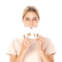 Rozłóż maseczkę w płachcie od Garnier. Ostrożnie nałóż tkaninę białą, gładką stroną na czystą skórę. Niebieska warstwa ochronna powinna być widoczna na zewnątrz. Ściągnij niebieską warstwę ochronną. Dopasuj maseczkę do konturów twarzy. Pozostaw na 15 minut. Maseczka w płachcie idealnie przylega do twarzy, więc możesz poświęcić ten czas na co zechcesz. Zdejmij maseczkę. Pozostałości formuły wmasuj w skórę lub zmyj ją za pomocą wacika.
