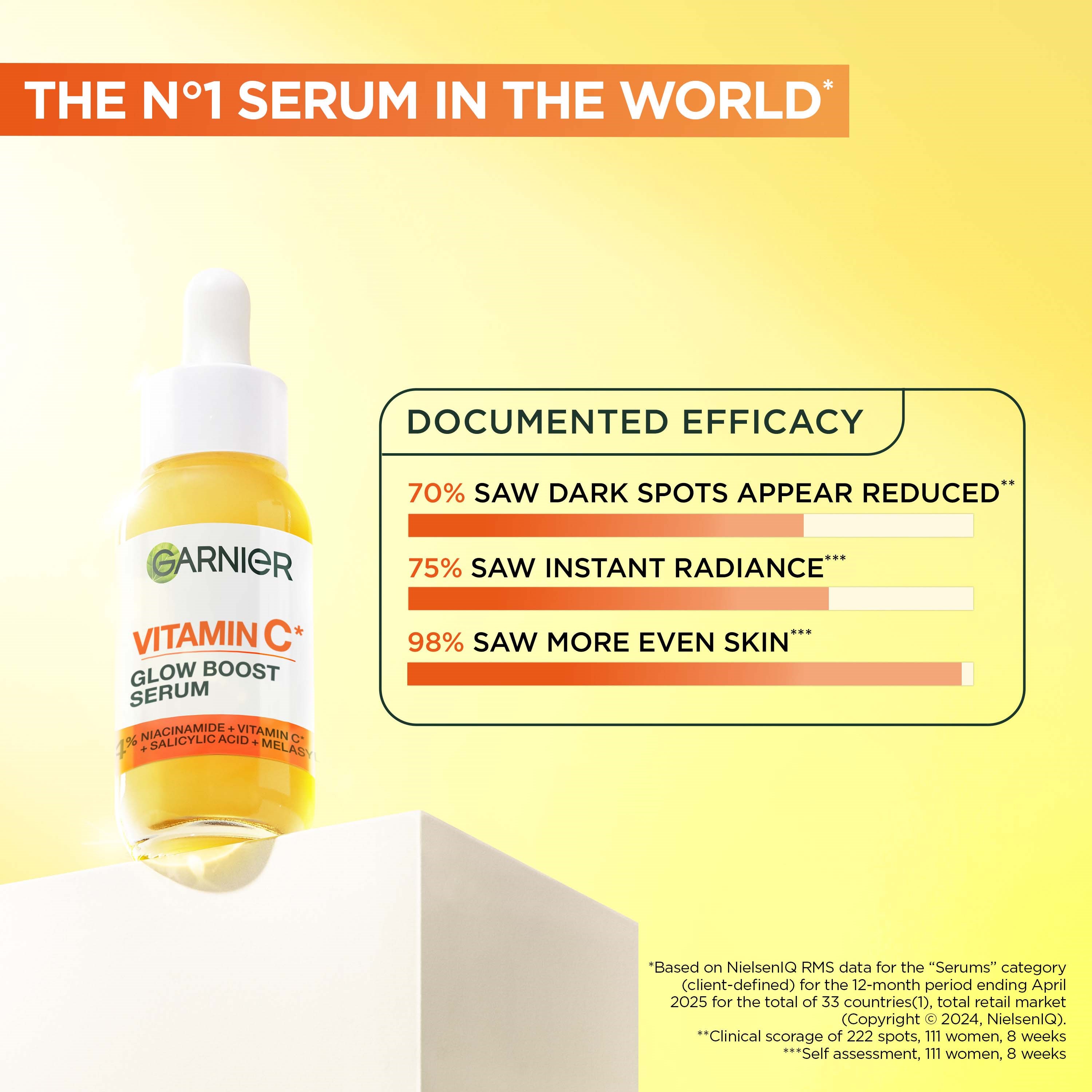 Zmęczona, szara cera? Dodaj jej blasku z serum Garnier Skinactive Vitamin C* Glow Boost Serum 30 ml! To potężna formuła z [3,5%] witaminy C*, niacynamidem i kwasem salicylowym, stworzona specjalnie, aby zredukować widoczność ciemnych plam i nadać skórze promienny wygląd. Wzbogacona ekstraktem z cytryny Super Citrus, składnikiem, który przyczynia się do uzyskania olśniewającego efektu na tonie skóry. Lekka i nietłusta konsystencja, która delikatnie wchłania się w skórę rano i wieczorem, pozostawiając ją świeżą i promienną!- Serum wzbogacone witaminą C*, które dodaje blasku. – Nadaje promienność i zmniejsza widoczność ciemnych plam.- Wzbogacone kwasem salicylowym, który współpracuje z kojącym niacynamidem.- Ekstrakt z cytryny Super Citrus przyczynia się do promiennego kolorytu skóry.*Pochodne witaminy C.Sposób użycia:1. Stosuj rano i wieczorem na oczyszczoną skórę. Napełnij pipetę i nałóż na całą twarz. Delikatnie wmasuj formułę w skórę. 2. Następnie użyj swojego ulubionego kremu na dzień lub na noc.