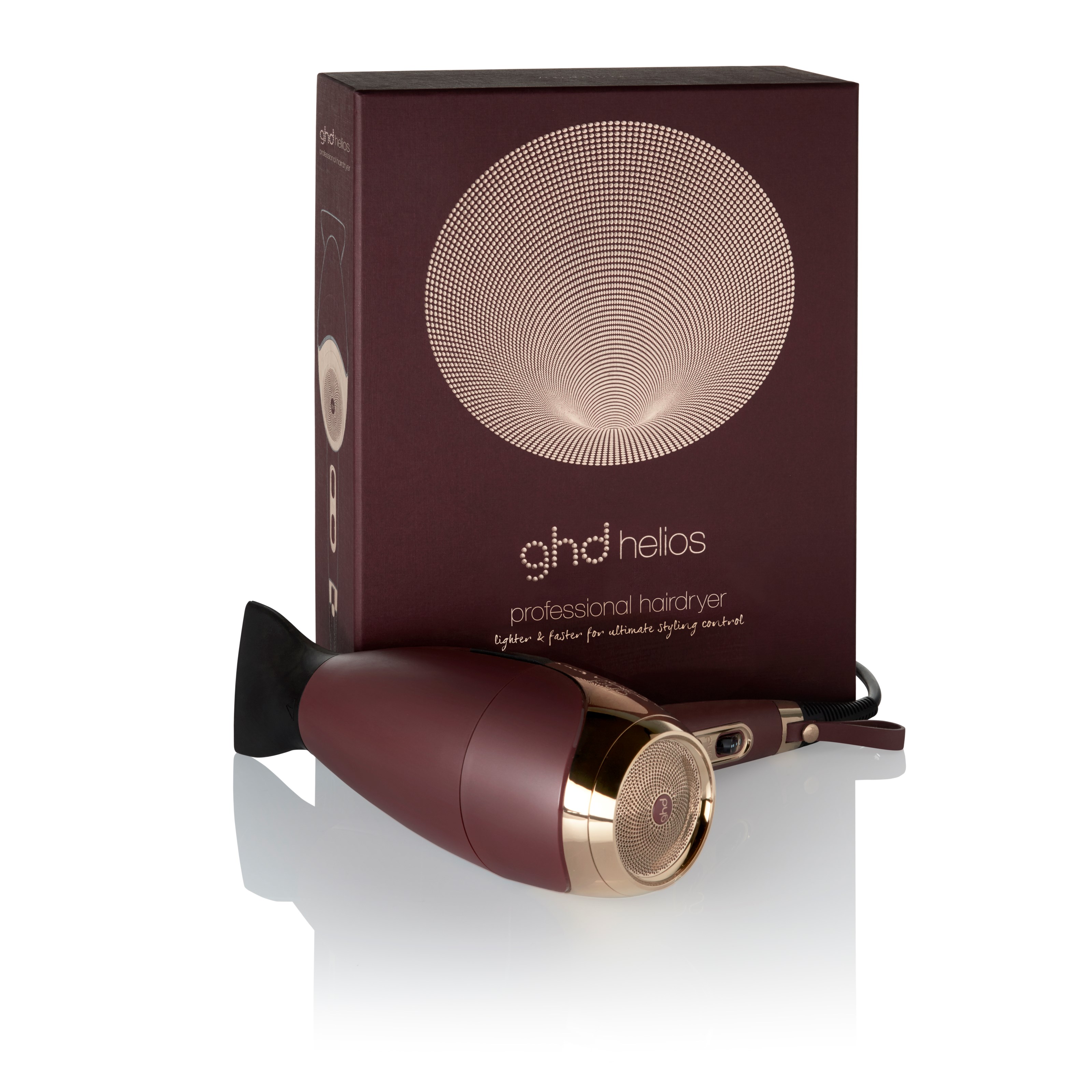 Suszarka do włosów ghd, wyposażona w opracowaną na indywidualne zamówienie technologię Aeroprecis™, łączącą zaawansowaną wewnętrzną aerodynamikę w celu skoncentrowania strumienia powietrza o dużej mocy z precyzyjnie wyprofilowaną dyszą zapewniającą równomierne rozprowadzanie ciepła. Jest wzorem do naśladowania dla lepszej kontroli stylizacji, co potwierdza 8/10 użytkowników*. Lekki, bezszczotkowy silnik tworzy potężny strumień powietrza o prędkości 120km/h, który radykalnie przyspiesza stylizację, dzięki czemu masz więcej czasu na podbój świata. Ergonomicznie zrównoważony dla lżejszej stylizacji i wykończony w głębokim, nasyconym śliwkowym kolorze z eleganckimi złotymi akcentami, ghd helios™ to mistrzowski model o jakości salonowej jak nigdy dotąd.