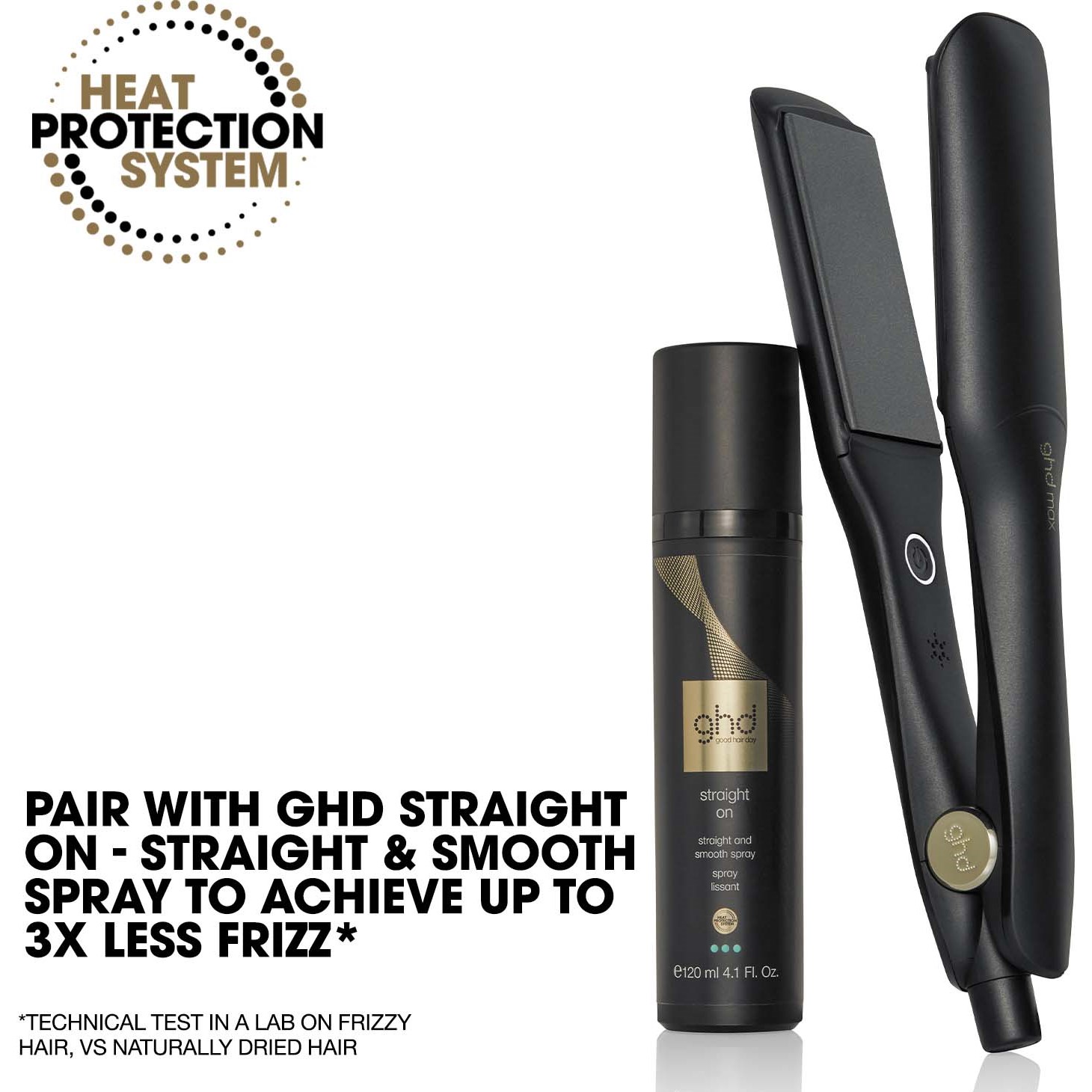Prostownica ghd max z szerokimi płytkami pozwoli Ci uzyskać gładkie i lśniące, długotrwałe rezultaty na długich, grubych lub kręconych włosach. Aby uzyskać do 3x mniej puszenia się włosów††, połącz prostownicę ghd max ze sprayem ghd straight on – straight & smooth.