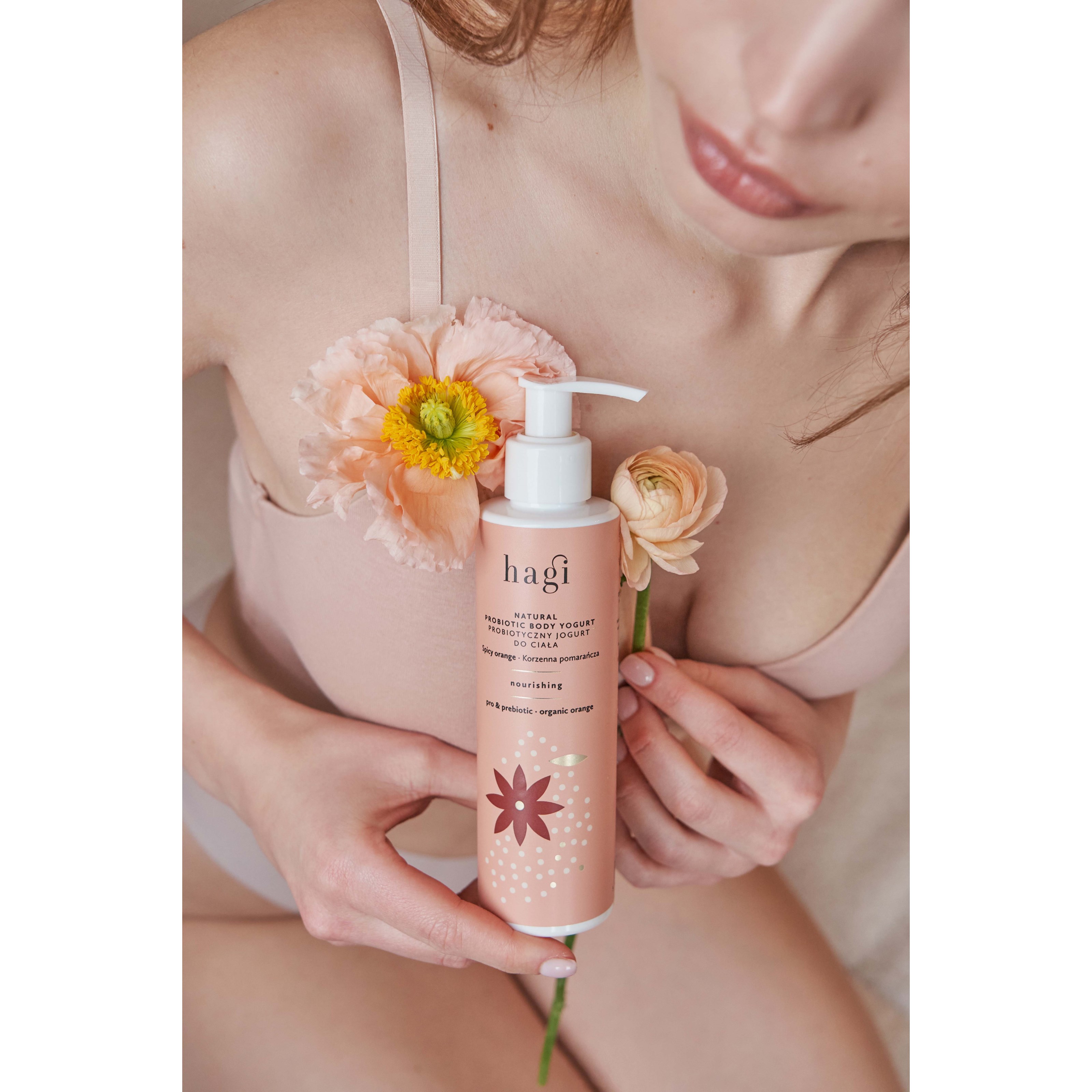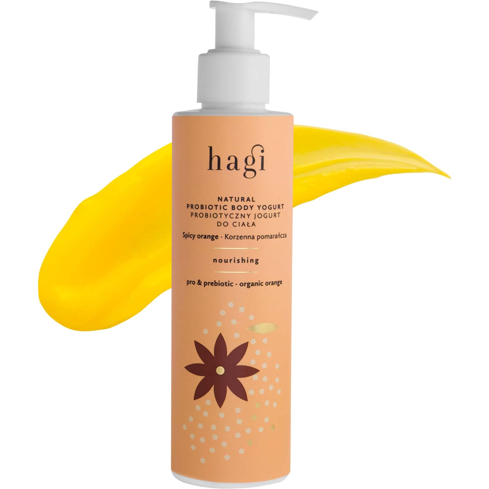 Czy lato sprawia, że czujesz się pełna energii, aktywna i cieszysz się bliskością natury? Czy często spędzasz czas na świeżym powietrzu, korzystając z kąpieli słonecznych i wodnych? Nasz lekki jogurt do ciała Hagi został stworzony, aby sprostać cyklicznym potrzebom Twojej skóry.Jogurt do ciała ma żelowo-kremową konsystencję, która intensywnie nawilża i wspiera naturalną równowagę bariery hydrolipidowej. Nasze mleczko do ciała Korzenna Pomarańcza to kompozycja składników, które chronią skórę przed szkodliwym działaniem wolnych rodników i regenerują skórę narażoną na podrażnienia, np. po długich kąpielach słonecznych i morskich. Odkryj słodko-korzenny zapach, który umili Ci aplikację i pozostanie z Tobą na dłużej. Ten kosmetyk jest idealny dla osób aktywnych fizycznie i dla miłośników kąpieli słonecznych i morskich.Ciekawostka: nasze jogurty do ciała testowały kobiety w wieku od 24 do 58 lat! Po pierwszym użyciu 95% z nich potwierdziło, że kosmetyk dostarczył uczucie nawilżenia i nawodnienia skóry! Po tygodniu regularnego stosowania jogurtu 90% testerek zauważyło ogólną poprawę kondycji skóry.W składzie naszego produktu znajdziesz co najmniej 97% składników pochodzenia naturalnego, takich jak:●Probiotyki wspierające mikrobiom naskórka,●Łagodzący pantenol, który działa jak opatrunek, ●Sok z aloesu wspomagający procesy regeneracyjne,●Antyoksydacyjny ekstrakt z rokitnika, który przyspiesza odnowę komórkową, ●Olej z rokitnika, bogaty w rozświetlającą witaminę C i uelastyczniający skórę, ●Organiczną wodę z pomarańczy, która odświeża i nawilża.Sposób użyciaNanieś na suchą i czystą skórę, rozprowadź aż do wchłonięcia. Naciesz się jedwabistym odczuciem i zmysłowym zapachem. Nie stosuj w przypadku alergii na którykolwiek ze składników.