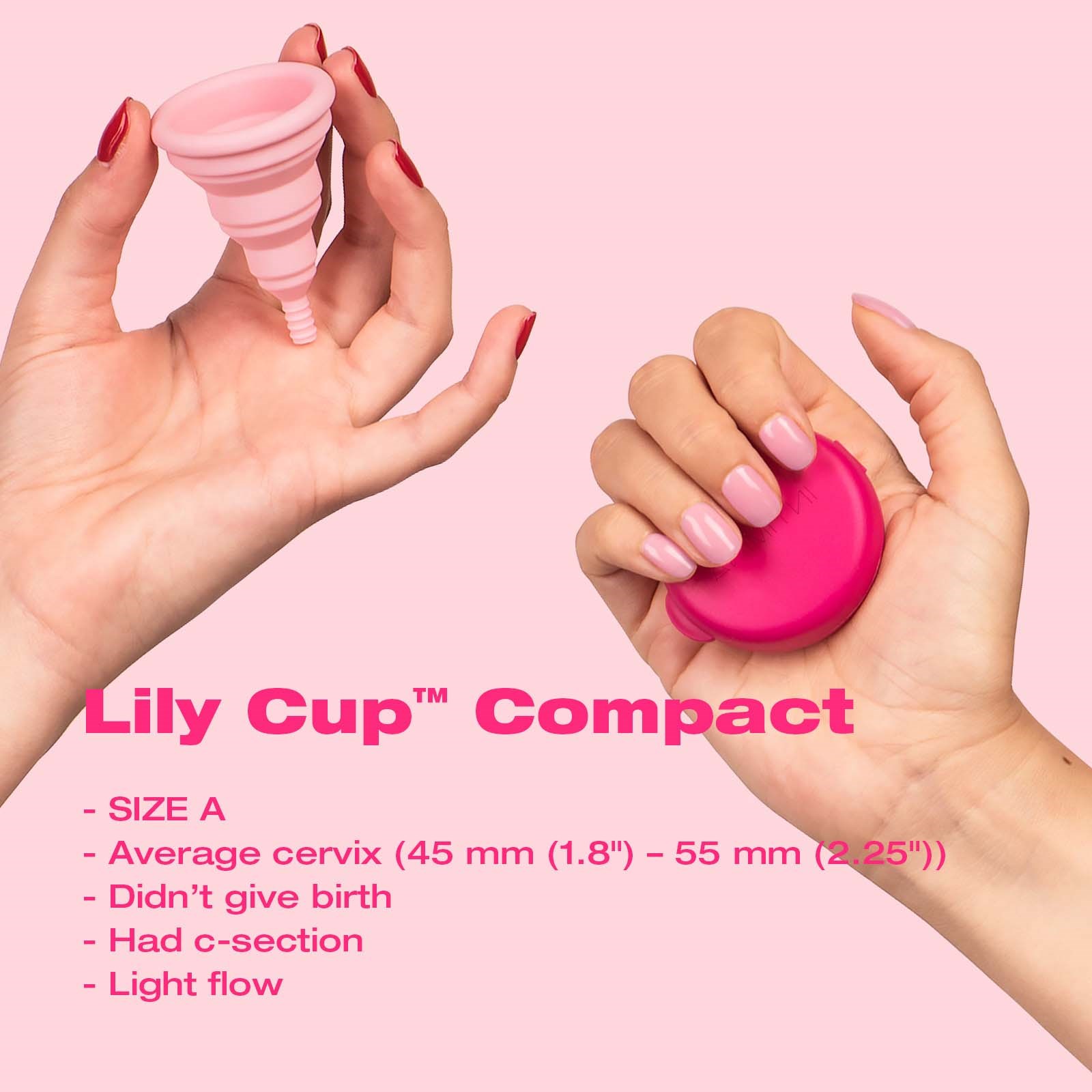 Lily Cup Compact – rozmiar ARozmiar A jest polecany kobietom, które nie rodziły dzieci lub rodziły przez cesarskie cięcie. Pierwszy na świecie składany kubeczek menstruacyjny! Teraz wielorazowy kubeczek, który jest praktyczny i przynosi korzyści zdrowotne, dostępny jest w kompaktowej wersji, którą możesz zabrać wszędzie. Lily Cup™ Compact to pierwszy kubeczek menstruacyjny, który można złożyć całkowicie płasko, idealnie mieszczący się w etui. Kubeczek zbiera menstruacyjne wydzieliny, zamiast je wchłaniać, co szanuje Twoje zdrowie intymne, eliminując suchość, którą często powodują tampony. Lily Cup™ Compact wykonany jest z medycznego silikonu, który jest tak cienki i lekki, że nawet nie poczujesz, że go masz w sobie. Oferuje 8 godzin bezproblemowej ochrony – zarówno w dzień, jak i w nocy. A ponieważ Lily Cup™ Compact jest wielokrotnego użytku, jest zarówno przyjazny dla środowiska, jak i ekonomiczny.W zestawie znajduje się 1 etui oraz szczegółowa instrukcja użytkowania.Lily Cup™ Compact dostępny jest również w rozmiarze B, który jest polecany kobietom, które rodziły drogą naturalną lub zdiagnozowano u nich osłabione dno miednicy.Lily Cup™ Compact występuje w 2 rozmiarach, abyś mogła znaleźć najwygodniejsze dopasowanie:Rozmiar A jest polecany kobietom, które nie rodziły dzieci lub rodziły przez cesarskie cięcie.Rozmiar B jest polecany kobietom, które rodziły drogą naturalną lub zdiagnozowano u nich osłabione dno miednicy.Zalety