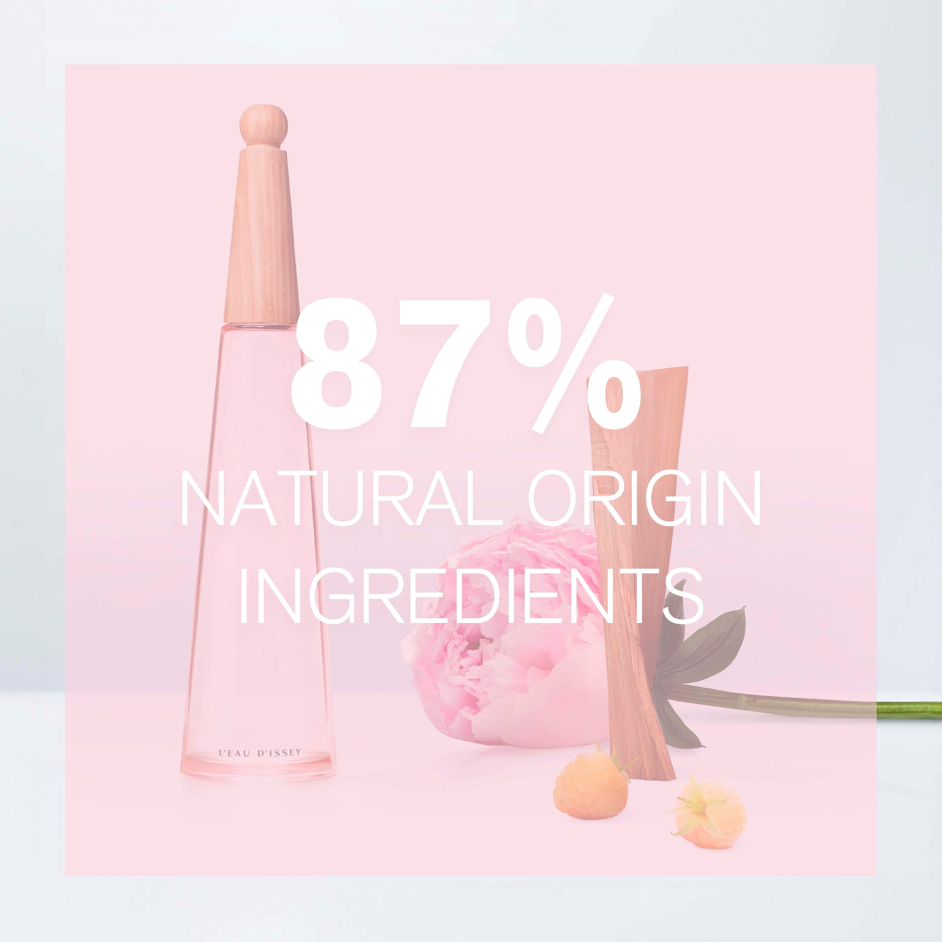 Z L'Eau d'Issey Pivoine, Issey Miyake oferuje nową interpretację kultowego flakonu perfum marki, nadając mu różowy odcień, który przypomina płatki piwonii. Elegancki flakon perfum z szkła kontrastuje z bogatą, nagą szarością, symbolizując spotkanie absolutnej czystości wody i zmysłowej, autentycznej natury drewna.