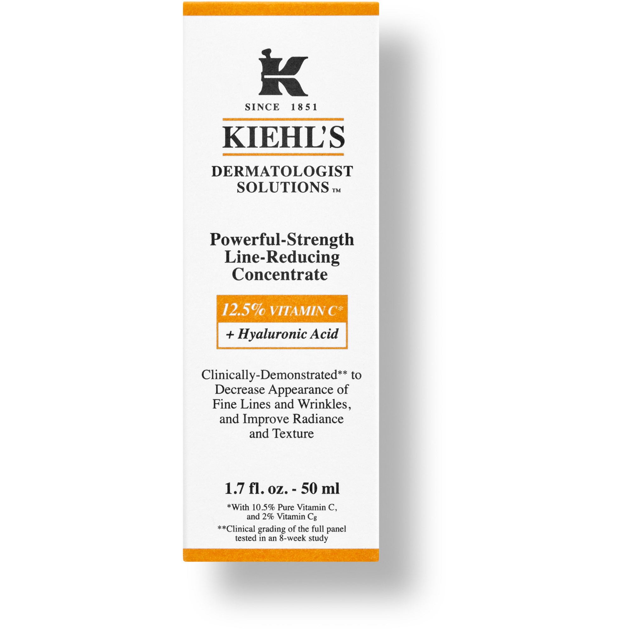 Naukowe osiągnięcie chemików Kiehl’s, serum przeciwzmarszczkowe zawiera czystą witaminę C o stężeniu 10,5% (kwas L-askorbinowy), witaminę Cg o stężeniu 2% oraz kwas hialuronowy.