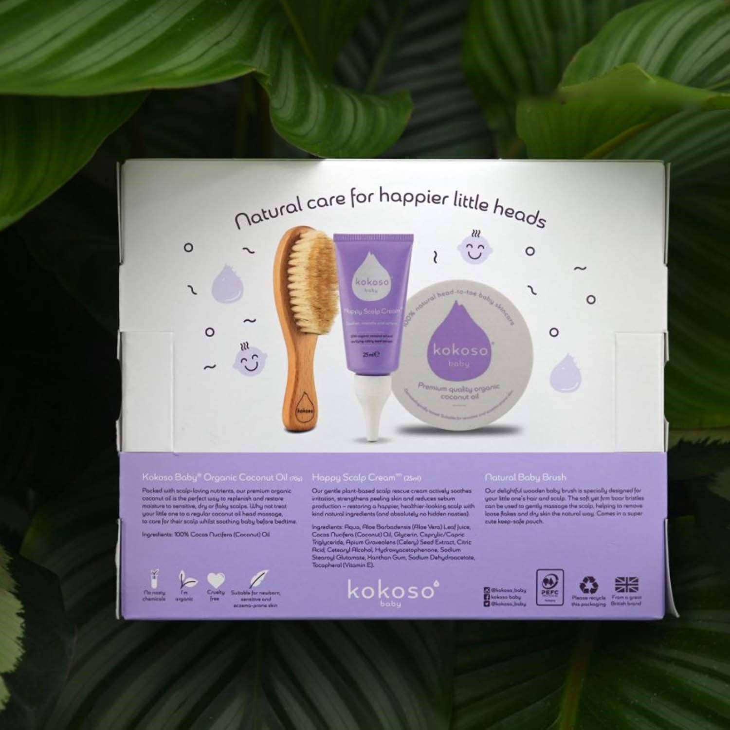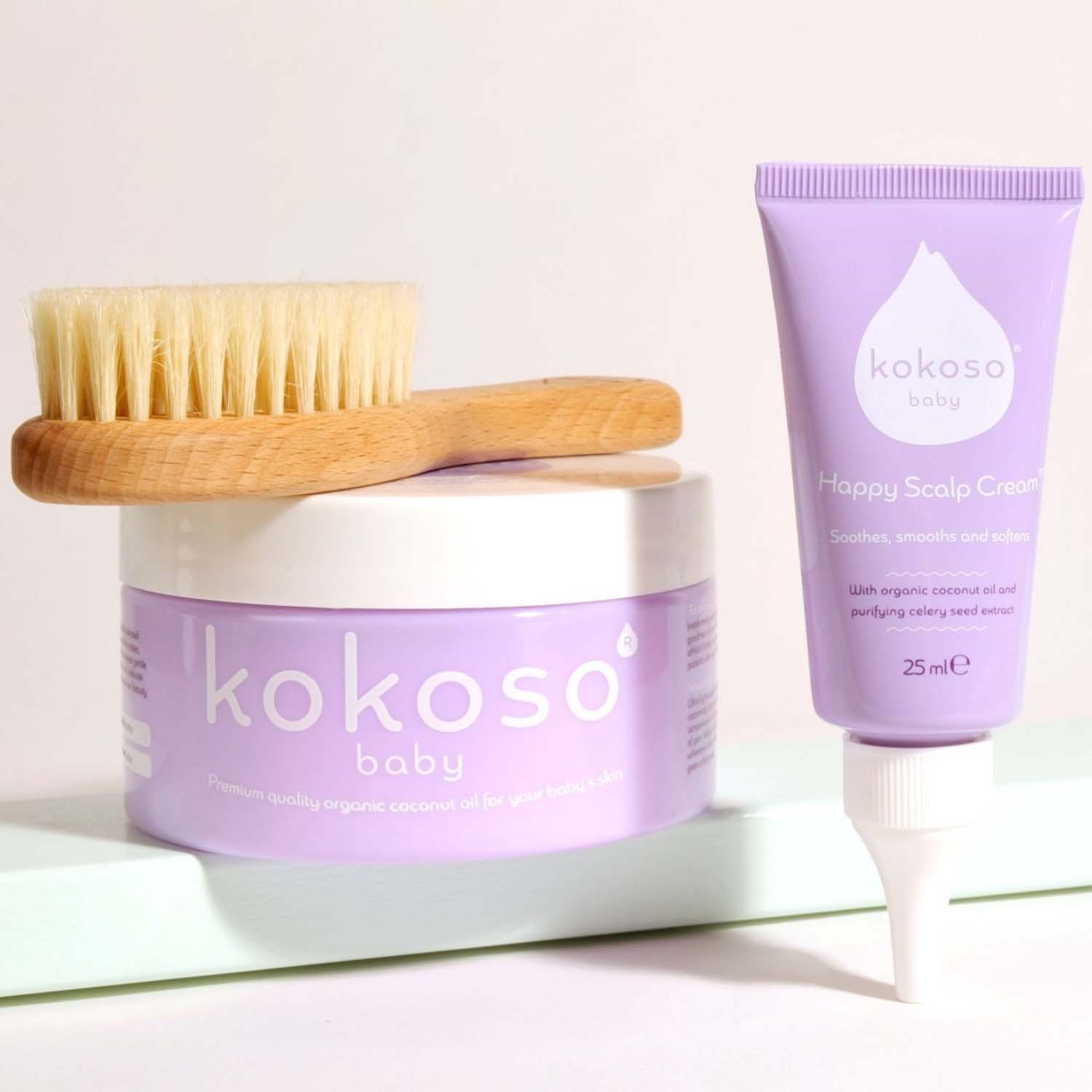 Zestaw Sensitive Scalp Set zawiera trzy najlepsze produkty stworzone specjalnie w celu pozbycia się ciemieniuchy, zmiękczenia i łagodzenia podrażnień skóry głowy. W zestawie: Kokoso Baby Coconut Oil (70g), Kokoso Baby Happy Scalp Cream (25ml), Kokoso Baby Natural Baby Hairbrush.Sposób użycia:Coconut Oil:Do stosowania na: Skóra sucha i podrażniona, wysypka mleczna, skóra głowy, egzema.Happy Scalp Cream:Nakładaj bezpośrednio na skórę głowy za pomocą aplikatora w tubce i lekko wmasuj. Stosuj rano i wieczorem tak długo, jak potrzebujesz. Nie spłukuj.Natural Baby Hairbrush:Ułatwia delikatne rozczesywanie włosów dziecka.