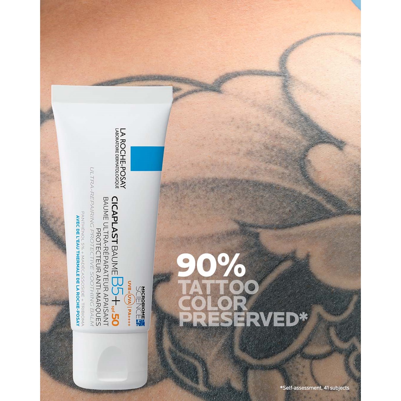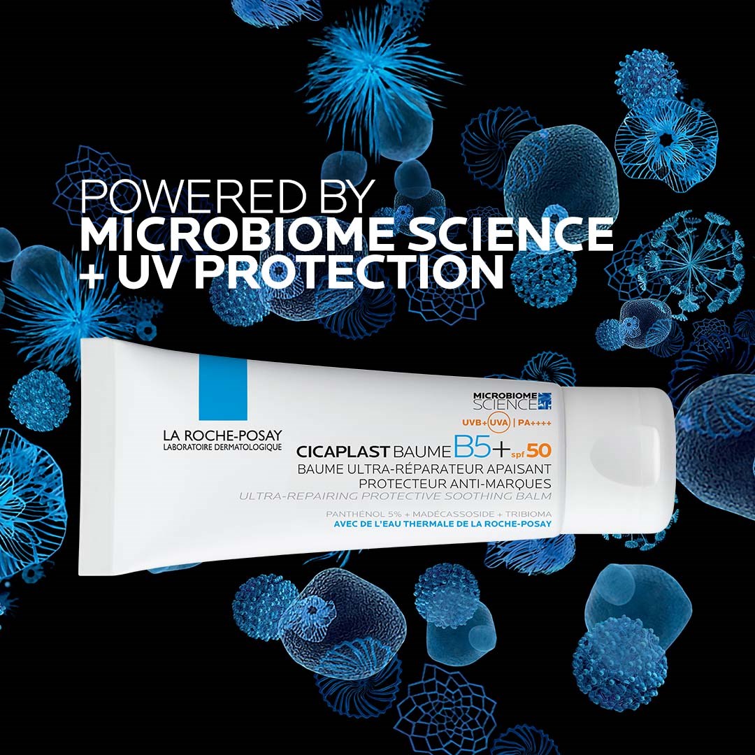Kojący, regenerujący i ochronny balsam z filtrem przeciwsłonecznym SPF 50, idealny dla wszystkich typów wrażliwej i podrażnionej skóry. Balsam pomaga zmniejszyć widoczność blizn i jest szczególnie polecany do skóry podrażnionej po zabiegach dermatologicznych (takich jak laser czy peeling) lub jako pielęgnacja po zabiegach tatuażu. Dla dorosłych i dzieci od 3. roku życia. PANTENOL, znany również jako witamina B5, to składnik aktywny znany ze swoich kojących i wzmacniających właściwości. MADECASSOSIDE, wyjątkowy ekstrakt z wąkroty azjatyckiej, znany ze swojego kojącego i pielęgnacyjnego działania na podrażnioną skórę.TRIBIOMA to unikalny kompleks prebiotyczny, który pomaga zrównoważyć mikrobiom skóry.PROCERAD, ceramid, który pomaga zachować poziom lipidów w skórze i wzmacnia barierę skórną.69% osób zauważa, że ich blizny są mniej widoczne po 1 miesiącu stosowania* 90% osób zauważa, że kolor ich tatuaży został zachowany**100% osób zauważa, że suche obszary skóry są mniej szorstkie***100% osób zauważa, że skóra wydaje się odbudowana****Samodzielna ocena, 95 uczestników, po 14 dniach stosowania**Samodzielna ocena, 41 użytkowników, po 14 dniach stosowania***Samodzielna ocena, 44 użytkowników, po 14 dniach stosowaniaSposób użycia:Aplikuj na czystą i suchą skórę codziennie. Może być stosowany na ciało, twarz i usta. Unikaj okolic oczu i otwartych ran.