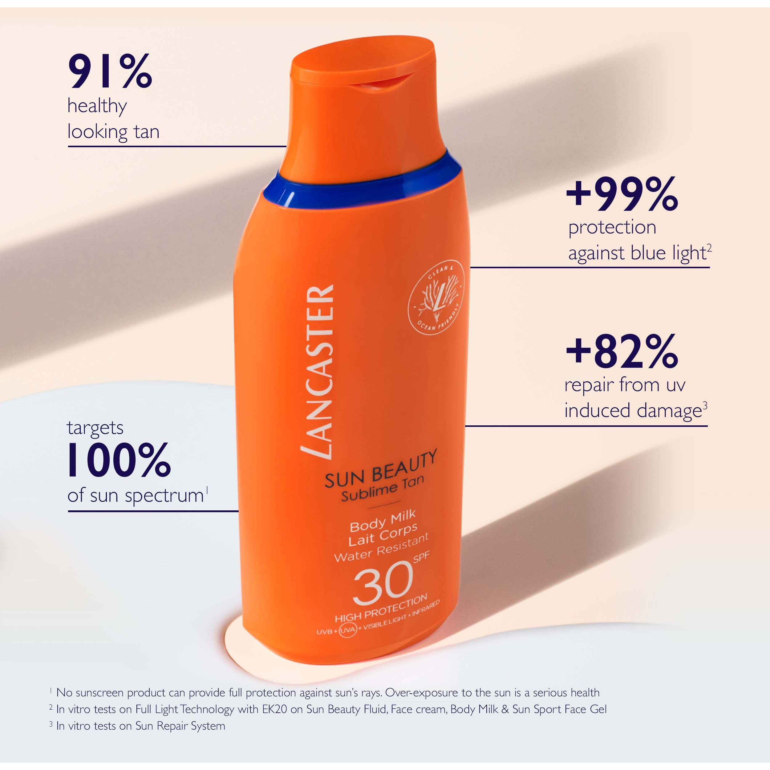 Otul ciało lekkim mleczkiem do ciała z SPF 30, które zapewnia mocną ochronę przed słońcem. Produkt wychwytuje 100% spektrum promieniowania słonecznego* i naprawia uszkodzenia skóry spowodowane słońcem. Unikalna formuła jest ultralekka, nietłusta i natychmiast niewidoczna na skórze. Zapewnia zdrową, złotą opaleniznę przy dwukrotnie krótszym czasie ekspozycji na słońce.**