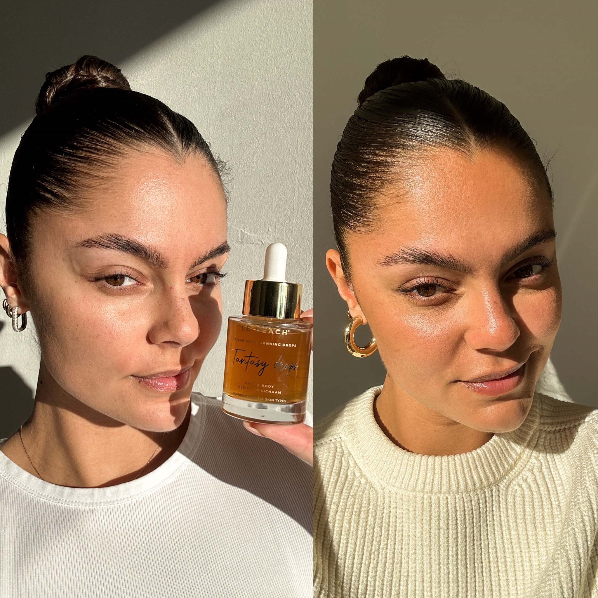 Naturalne krople samoopalające z pielęgnacyjnymi właściwościami do twarzy i ciała. Stopniowo budują trwałą, luksusową opaleniznę. Bez syntetycznych barwników, z aloesem i witaminami. Tylko 1 kropla dziennie dla promiennej opalenizny każdego dnia!Dodaj kilka kropli do serum z witaminą C lub balsamu do ciała i voilà: po kilku godzinach zyskasz efekt opalenizny, jak po powrocie z wakacji. Le Beach Tantasy Drops zapewniają efekt skóry muśniętej słońcem przez cały rok, bez szkodliwego działania promieni słonecznych. Innowacyjna mieszanka roślinnego DHA i erytrulozy sprawia, że opalenizna staje się bardziej naturalna, pojawia się szybciej i trwa dłużej. Dzięki połączeniu tych składników kolor rozwija się w kilku etapach i utrzymuje się dłużej.Kluczowe składniki Le Beach Tantasy DropsDodatek ekstraktu z aloesu zapewnia nawilżenie i pielęgnację skóry.Aloes ma także działanie antybakteryjne i wzmacnia kolagen. Po aplikacji skóra staje się nawilżona i odświeżona. Działanie przeciwzapalne zmniejsza przebarwienia i koi skórę. Sposób użycia:Krople są mocno skoncentrowane i muszą być zawsze mieszane z serum lub balsamem według instrukcji na opakowaniu. Użyj Hydra Gold do twarzy lub Pearly Skin Body Moisturizer do ciała. Nałóż na czystą, suchą skórę. Nie używaj zbyt tłustego kremu, bo efekt może być nierówny. Zawsze umyj ręce po aplikacji.Opalenizna rozwija się w ciągu 4 godz. Krople wchłaniają się w skórę. 1-2 krople max na twarz i szyję. 4-6 kropli na nogi. Pamiętaj, aby wymieszać z lekkim serum lub balsamem.Przechowuj w temp. do 30°C, nie wystawiaj na bezpośrednie działanie promieni słonecznych.