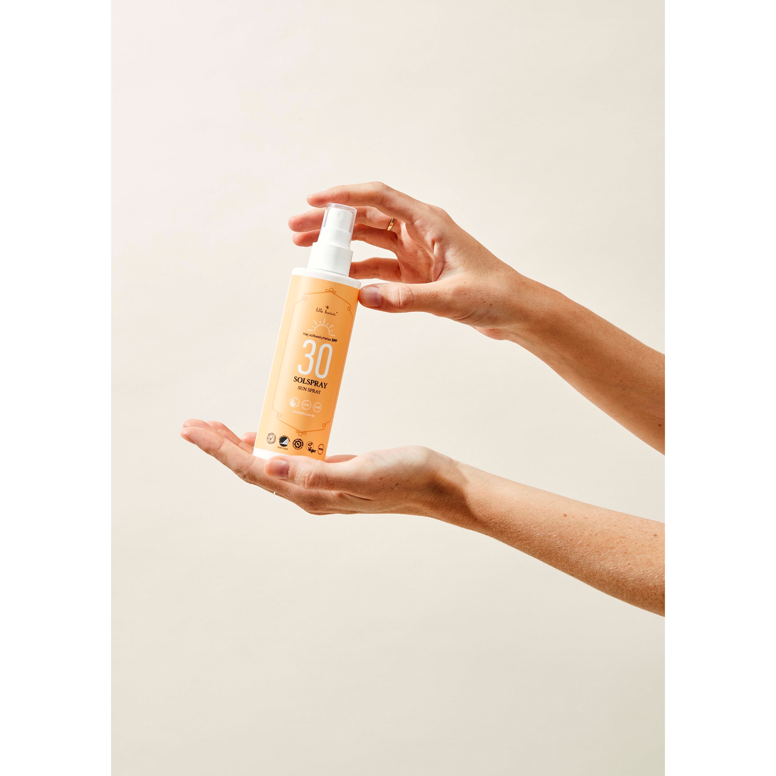 Spray przeciwsłoneczny Lille Kanin SPF30+ jest wodoodporny i chroni przed promieniowaniem UVA i UVB. Utrzymuje i chroni nawilżenie skóry, a jego stosowanie jest bezpieczne zarówno dla dzieci, jak i dorosłych.Sposób użycia:Przed użyciem wstrząśnij i nałóż obfitą ilość 20 minut przed ekspozycją na słońce. Dzięki pompce łatwo nałożysz filtr przeciwsłoneczny w równych warstwach, co ułatwia jego wchłanianie. Aplikuj regularnie, aby zapewnić długotrwałą ochronę, szczególnie po pływaniu lub osuszeniu się ręcznikiem. Ochrona znacznie się zmniejsza, jeśli użyjesz zbyt mało produktu. Użyj garści filtru przeciwsłonecznego na ciało dziecka (20 ml).Produkty przeciwsłoneczne mogą zostawiać plamy na ubraniach i innych przedmiotach. Dlatego zalecamy, aby pozwolić produktowi całkowicie wchłonąć się w skórę przed założeniem odzieży, kontaktem z tkaninami lub innymi przedmiotami.Dla dodatkowej ochrony: unikaj słońca między 12:00 a 15:00, kiedy promieniowanie jest szczególnie silne, i upewnij się, że przebywasz w cieniu. Niemowlęta i małe dzieci nie powinny być narażone na bezpośrednie działanie słońca.
