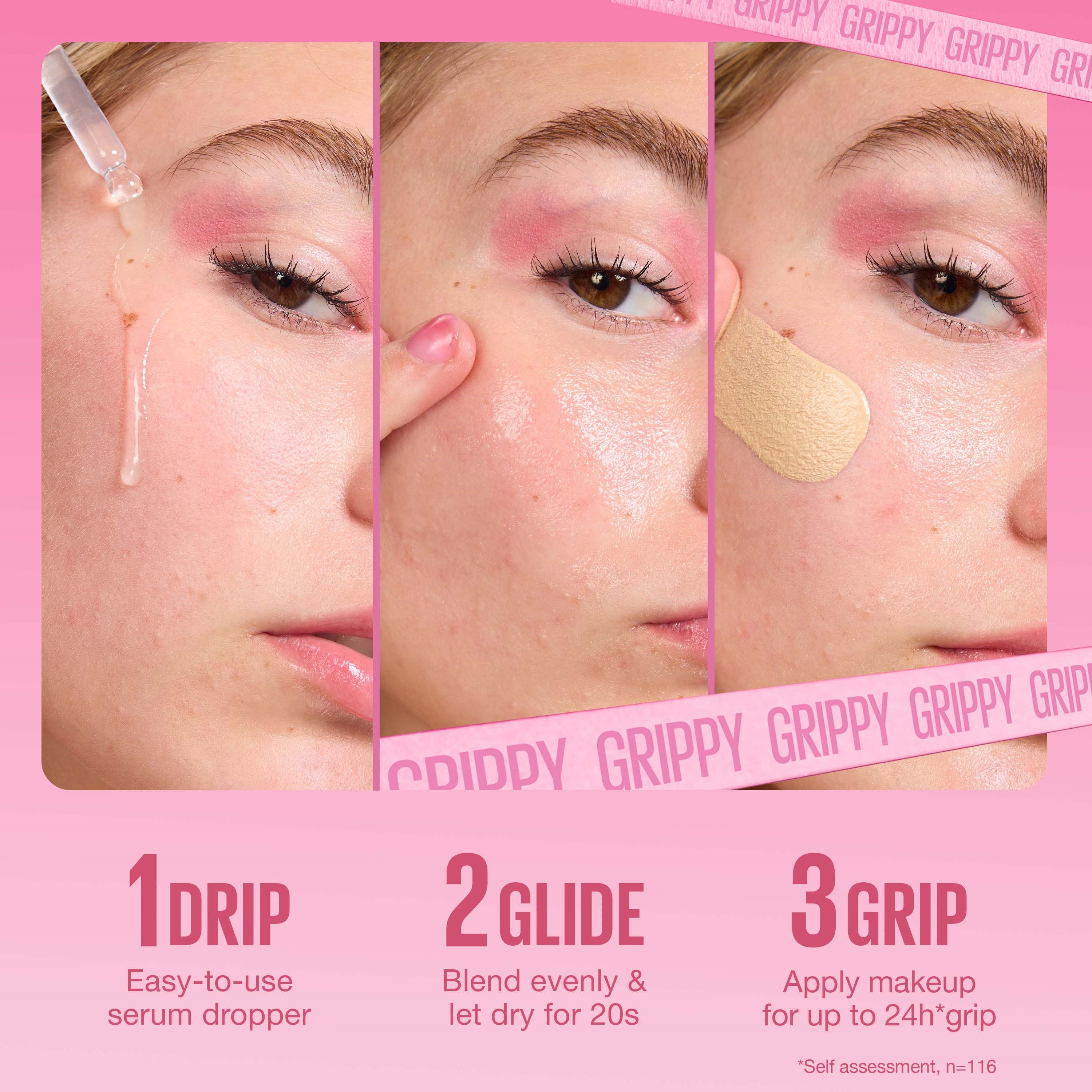 Maybelline New York Grippy Serum Primer to wodna baza pod makijaż, która sprawia, że makeup trzyma się na miejscu przez cały dzień. Efekt liquid-to-grip zmienia płynną formułę w primer, który „chwyta” makijaż i utrzymuje go na miejscu. Wzbogacona 2% niacynamidem, nawilża skórę.- Formuła, która wtapia się w skórę- Do 24 h trwałości- Efekt liquid-to-grip- Bezzapachowa- Wegańska formuła*Samoocena, 116 osób**Bez składników pochodzenia zwierzęcegoSposób użycia:Krok 1. Zacznij od oczyszczonej i nawilżonej skóry.Krok 2. Nałóż 1–2 krople na skórę i wmasuj jak serum.Krok 3. Poczekaj 10 s, aż produkt zmieni się w lepką bazę pod podkład lub korektor.Krok 4. Można stosować samodzielnie dla lekkiego blasku.