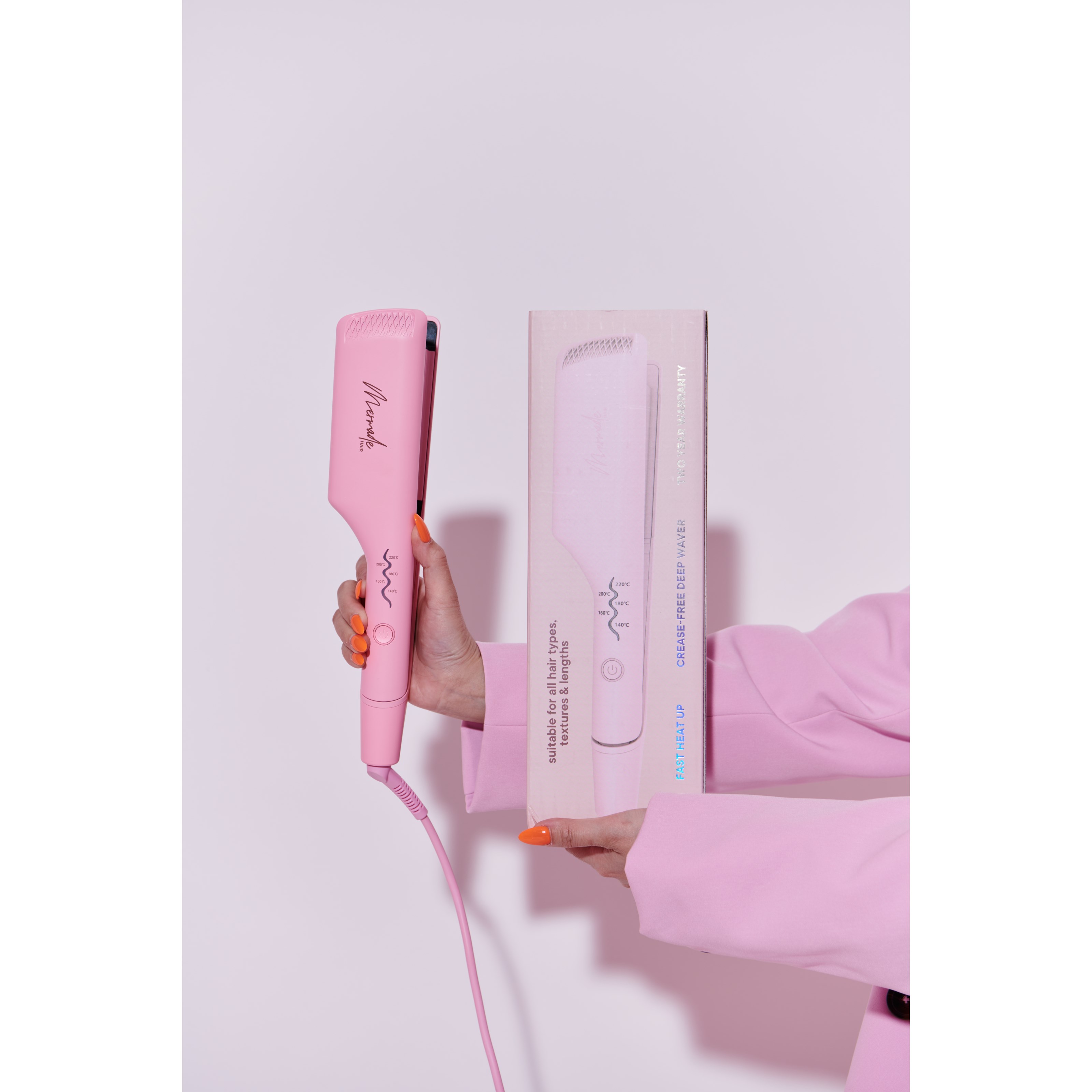 Przedstawiamy nasz Double Waver, narzędzie kosmetyczne, które przeciwstawia się filozofii „mniej znaczy więcej”. Dzięki innowacyjnej konstrukcji z podwójną lufą ta lokówka bez wysiłku tworzy marzycielskie, średniej wielkości fale, które z pewnością przyciągają wzrok. Nadaje się do użytku przez każdego, a jego super lekka konstrukcja zapewnia bezproblemowe wrażenia i wyniki o jakości salonu. W zaledwie 60 sekund Double Waver jest gotowy do przekształcenia włosów w miękkie, efektowne fale dzięki zaawansowanej technologii termicznej. Ceramiczne i zapobiegające oparzeniom płytki chronią również włosy przed uszkodzeniami, zapewniając jednocześnie wspaniałe rezultaty. Dzięki wielu ustawieniom temperatury i uniwersalnemu napięciu ta profesjonalna falownica to Twój paszport do pięknych włosów w dowolnym miejscu na świecie.Sposób użycia:Krok 1. Przed użyciem włosy powinny być czyste, suche i niesplątane. Ustaw żelazko na podstawce na gładkiej, odpornej na ciepło płaskiej powierzchni i podłącz je. Naciśnij i przytrzymaj przycisk ON/OFF, aż urządzenie się włączy i zaświeci się wskaźnik temperatury. Dostosuj temperaturę, aby osiągnąć żądane ciepło. Aby uzyskać zdrowszą stylizację, zalecamy ustawienie temperatury na 180°C/360°F, chyba że masz bardzo gęste/grube włosy.Krok 2. Kluczem do długotrwałych, bujnych fal jest odpowiednie przygotowanie włosów. Chcesz nałożyć na włosy środek chroniący przed wysoką temperaturą i spray do konturowania, taki jak nasza Mermade Mist, który ochroni Twoje pasemka przed wysoką temperaturą i zapewni włosom dodatkowe utrwalenie.Krok 3. Zacznij od podzielenia włosów na sekcje za pomocą naszych klipsów Grip Clips. Mniejsze sekcje stworzą bardziej zdefiniowane fale. Nakładając jedną sekcję na raz, zacznij od góry blisko nasady i zaciśnij włosy, upewniając się, że włosy są równomiernie umieszczone w beczkach. Uważaj, aby nie dotknąć narzędzia skórą głowy. Przytrzymaj przez 2-5 sekund. Przytrzymaj krócej, jeśli włosy łatwo się kręcą lub jeśli chcesz mniej wyrazistych fal. Po zwolnieniu pierwszego zacisku ponownie zaciśnij górną lufę wahacza na ostatnim zakręcie fali. Chcesz nakładać każdą falę na swoją falę, aby stworzyć płynną falę od nasady aż po same końce. Powtórz ten proces aż do końców na całej głowie.Krok 4. Po zakończeniu machania upewnij się, że włosy całkowicie ostygły przed dotknięciem, aby dać im czas na ustawienie. Aby uzyskać plażową falę bez wysiłku, rozczesz falę za pomocą naszego pędzla Mermade Brush lub przeczesz grzebieniem. Wykończ, używając dodatkowego sprayu Mermade Mist dla utrwalenia i nabłyszczenia lub elastycznego, łatwego w użyciu sprayu lub lakieru w sprayu dla lepszego utrwalenia.Krok 5. Aby wyłączyć, naciśnij i przytrzymaj przycisk wyłączania, aż się wyłączy. Dla Twojego bezpieczeństwa narzędzie wyłączy się automatycznie po 60 minutach. Pozwól narzędziu całkowicie ostygnąć przed schowaniem. Pamiętaj, aby wytrzeć narzędzie po użyciu, aby uniknąć gromadzenia się produktu na narzędziu.