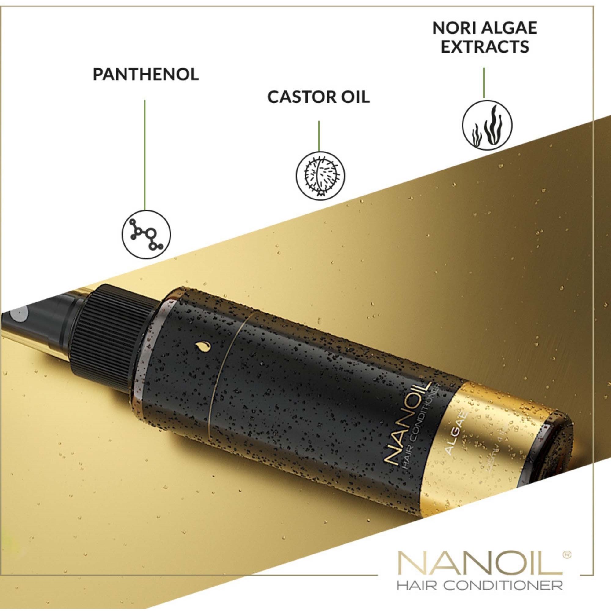 Lekka odżywka do włosów przesuszonych, łamliwych, elektryzujących się, o suchych końcach – dwufazowa odżywka Nanoil na bazie cennych alg. Dla perfekcyjnego nawilżania, regeneracji i upiększania włosów dzień po dniu.