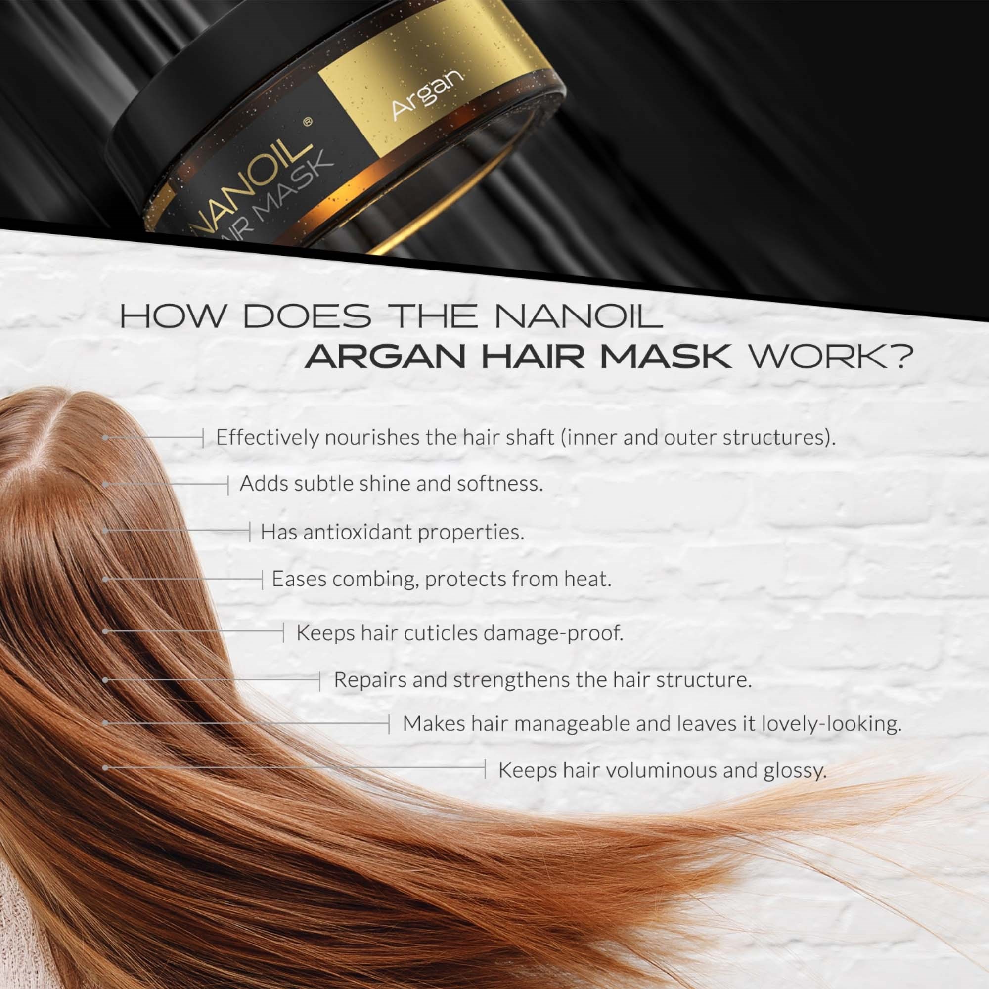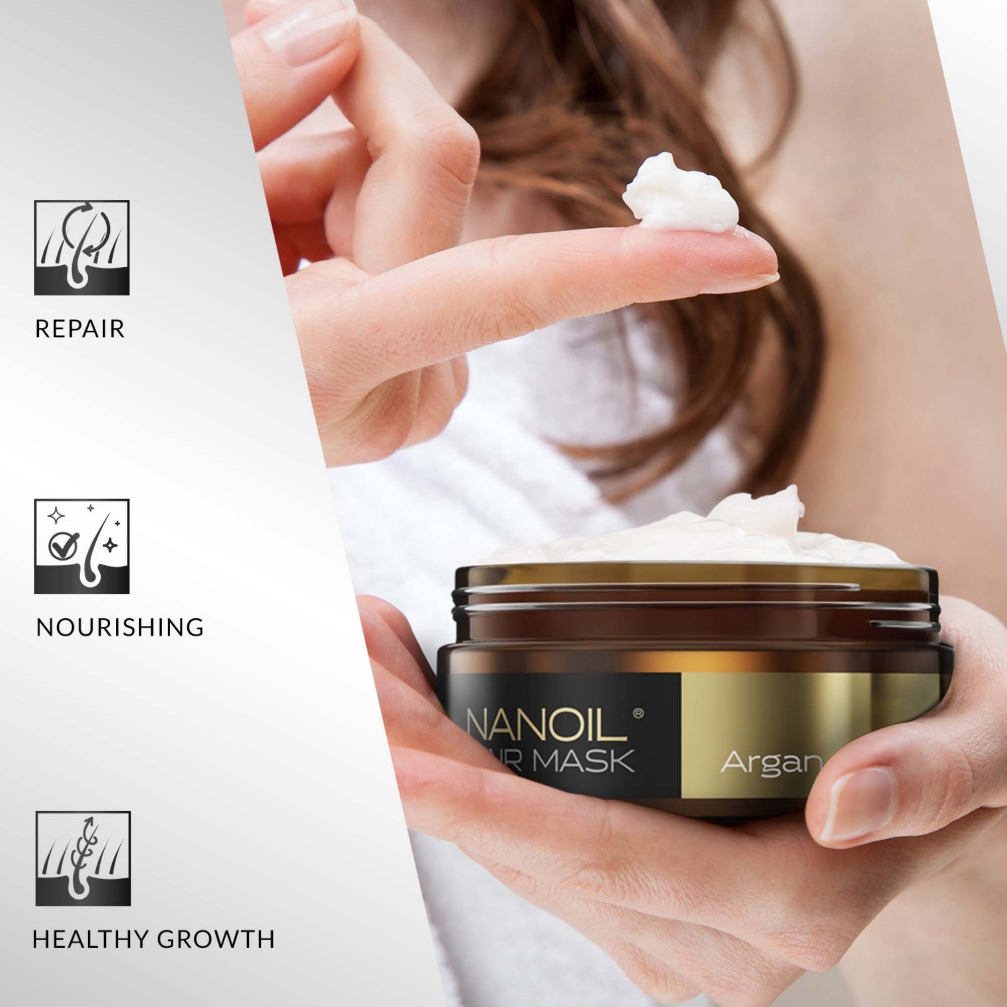 Zawiera olej arganowy, który chroni strukturę włosa, wygładza, domyka łuski, ułatwia rozczesywanie i sprawia, że włosy są tak piękne jak nigdy przedtem. To olejek najbogatszy w składniki odżywcze – zawiera ich ponad 100. W masce Nanoil połączono go z panthenolem, czyli prowitaminą B5, dzięki czemu jeszcze skuteczniej odżywia włosy na całej ich długości, pielęgnuje skórę głowy, a także zapewnia fryzurze sprężystość, lekkość i piękny blask.