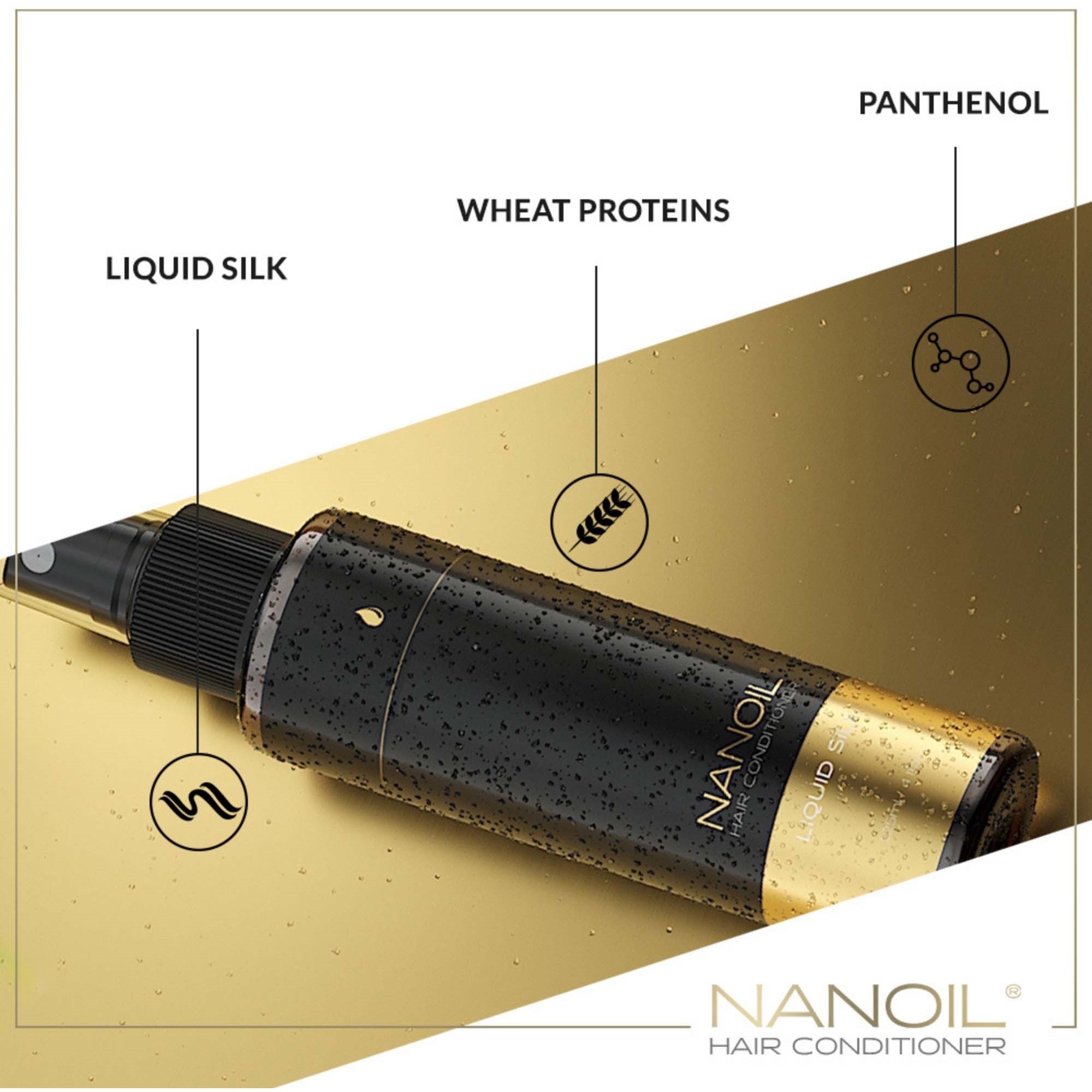 Lekka odżywka do włosów puszących się, plączących, osłabionych i trudnych w stylizacji – dwufazowa odżywka od Nanoil z proteinami płynnego jedwabiu, która wzmacnia i wygładza włosy od pierwszego użycia. A wszystko to w formie mgiełki otulającej z troską każdy z włosów.